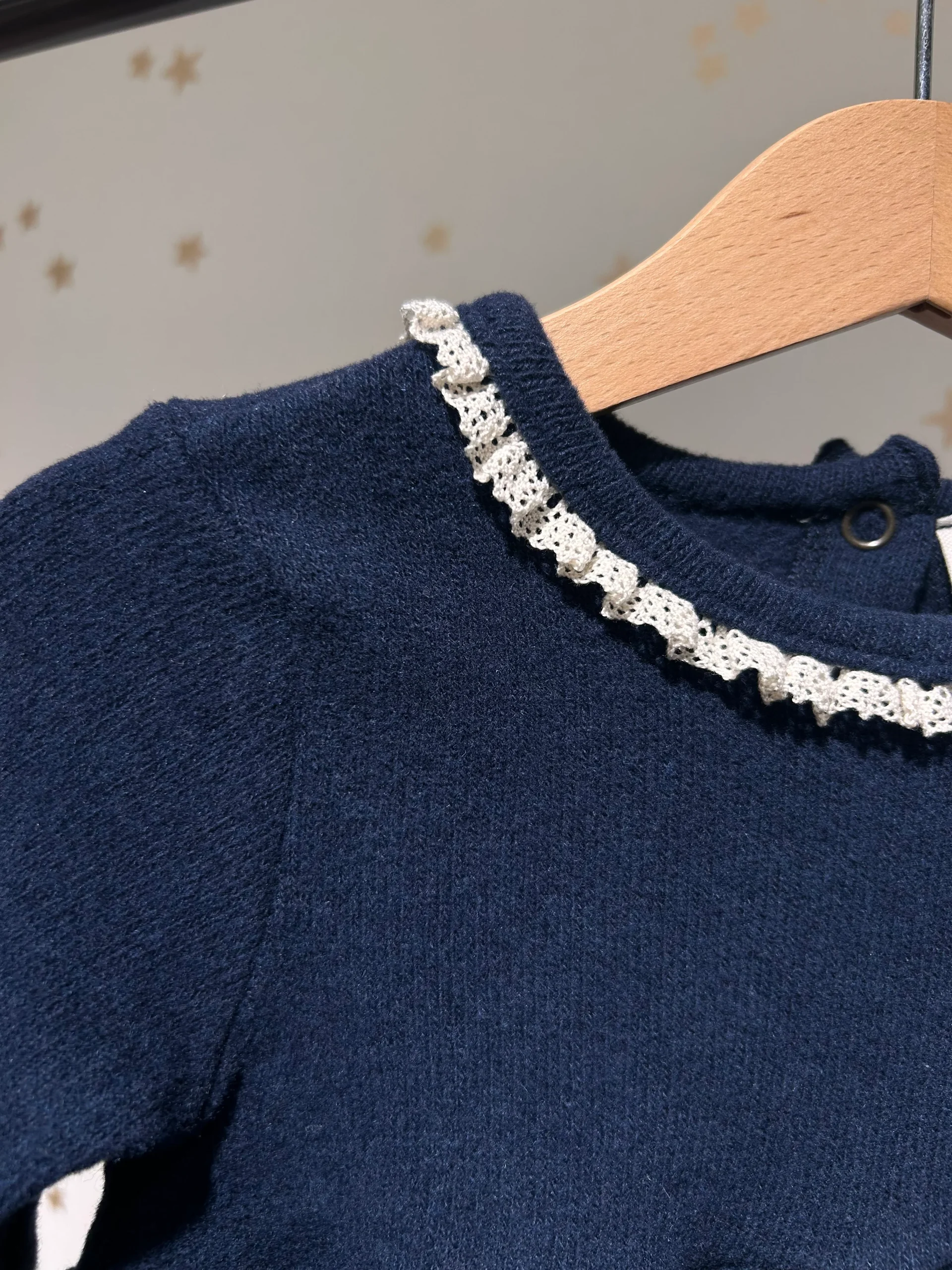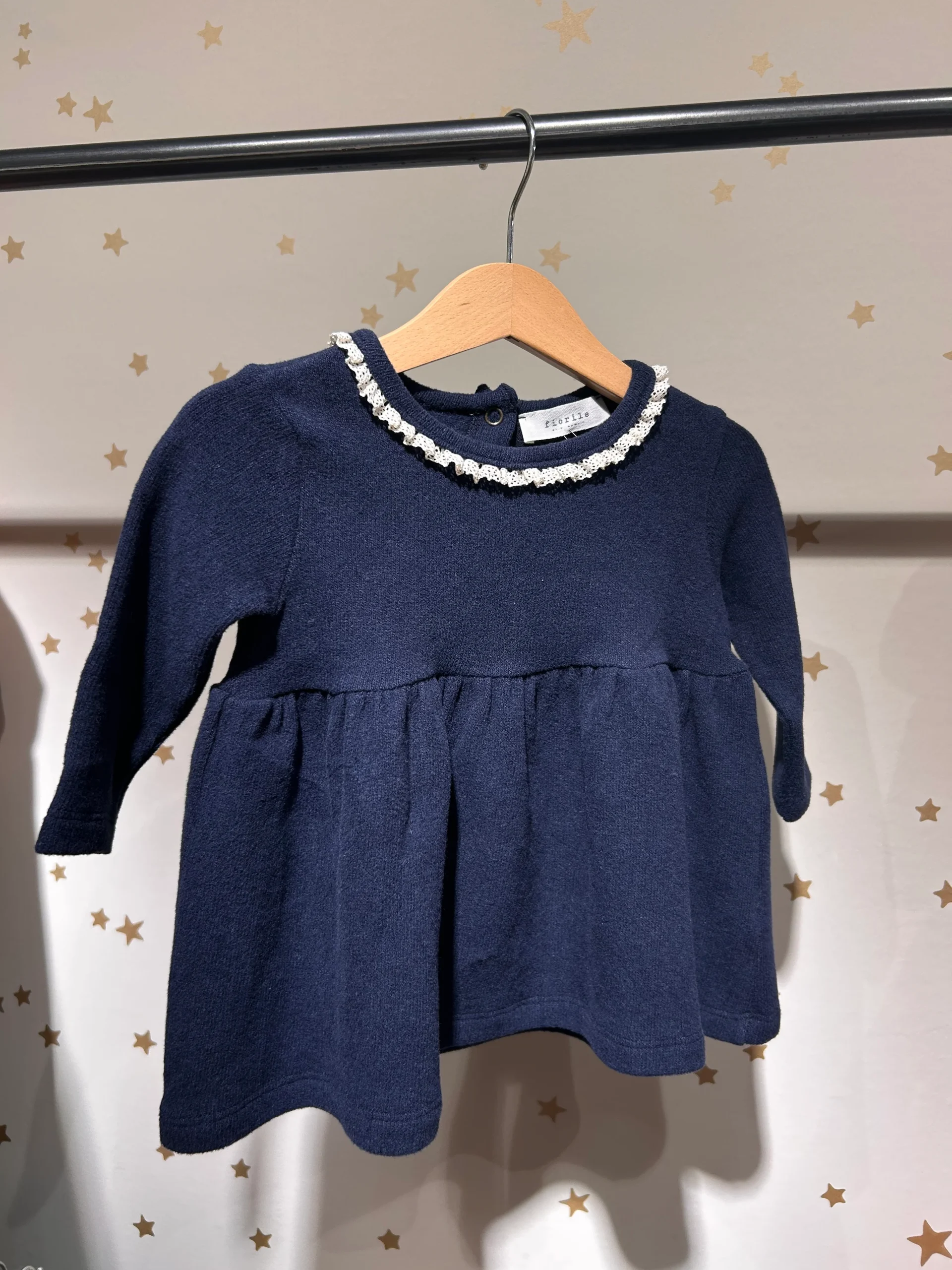 Questo abito baby in morbido caldo cotone blu è una scelta elegante e comoda per la tua neonata. Lunghezza sotto il ginocchio, balza e piccolo colletto a contrasto in pizzo bianco aggiungono un tocco di stile. Con bottoncini a clip sul retro, è facile da indossare. Un capo perfetto per ogni occasione.