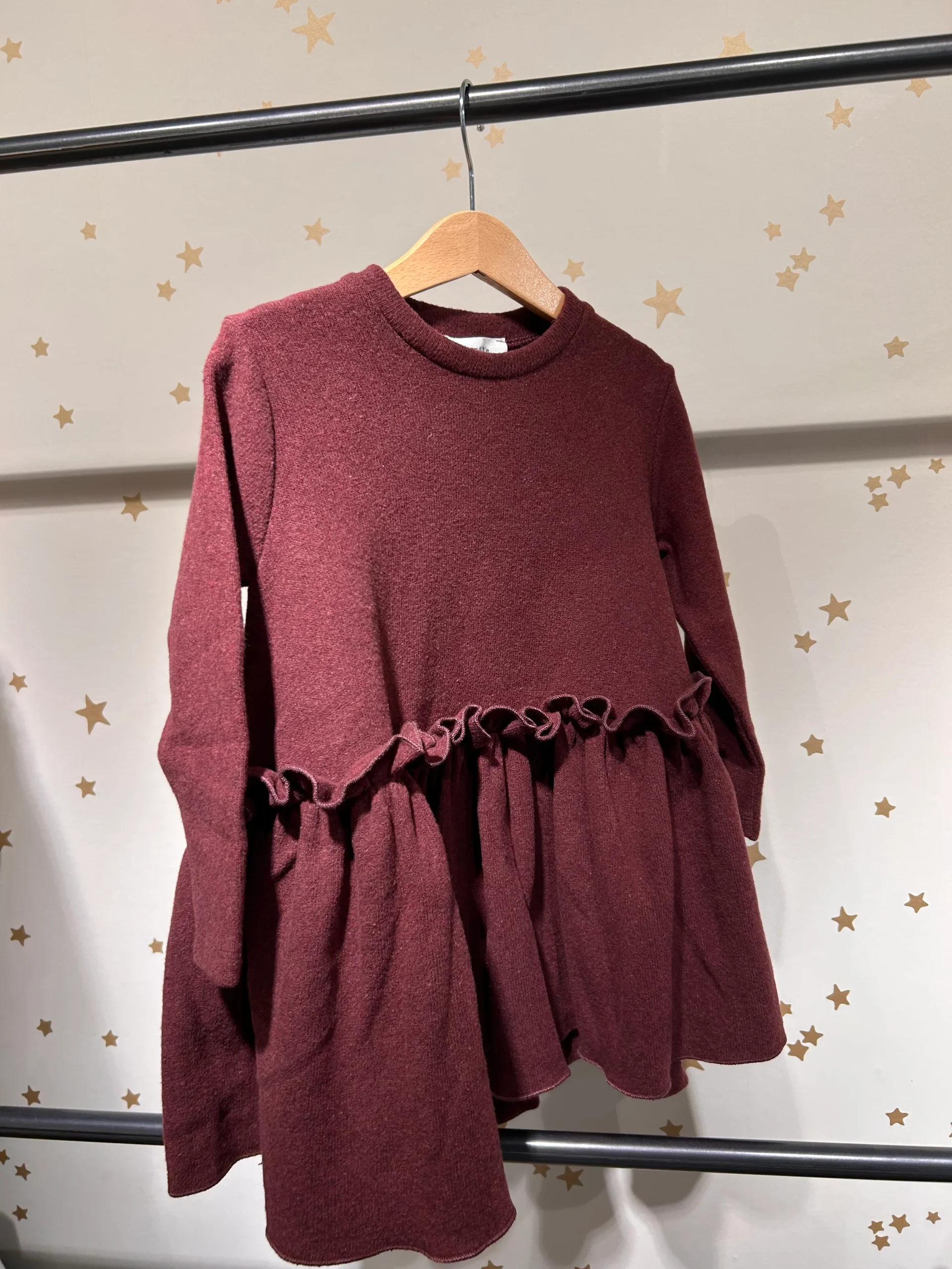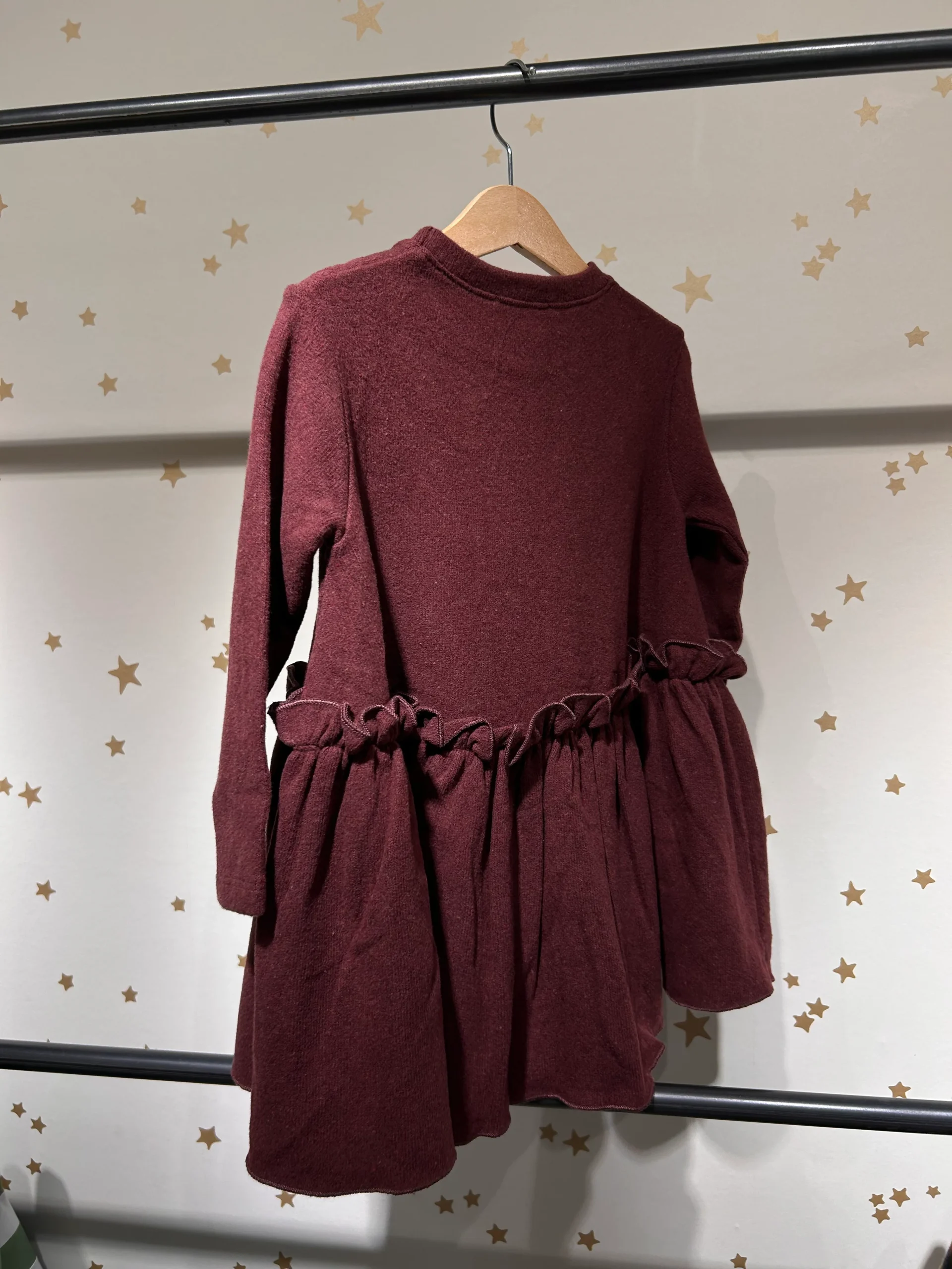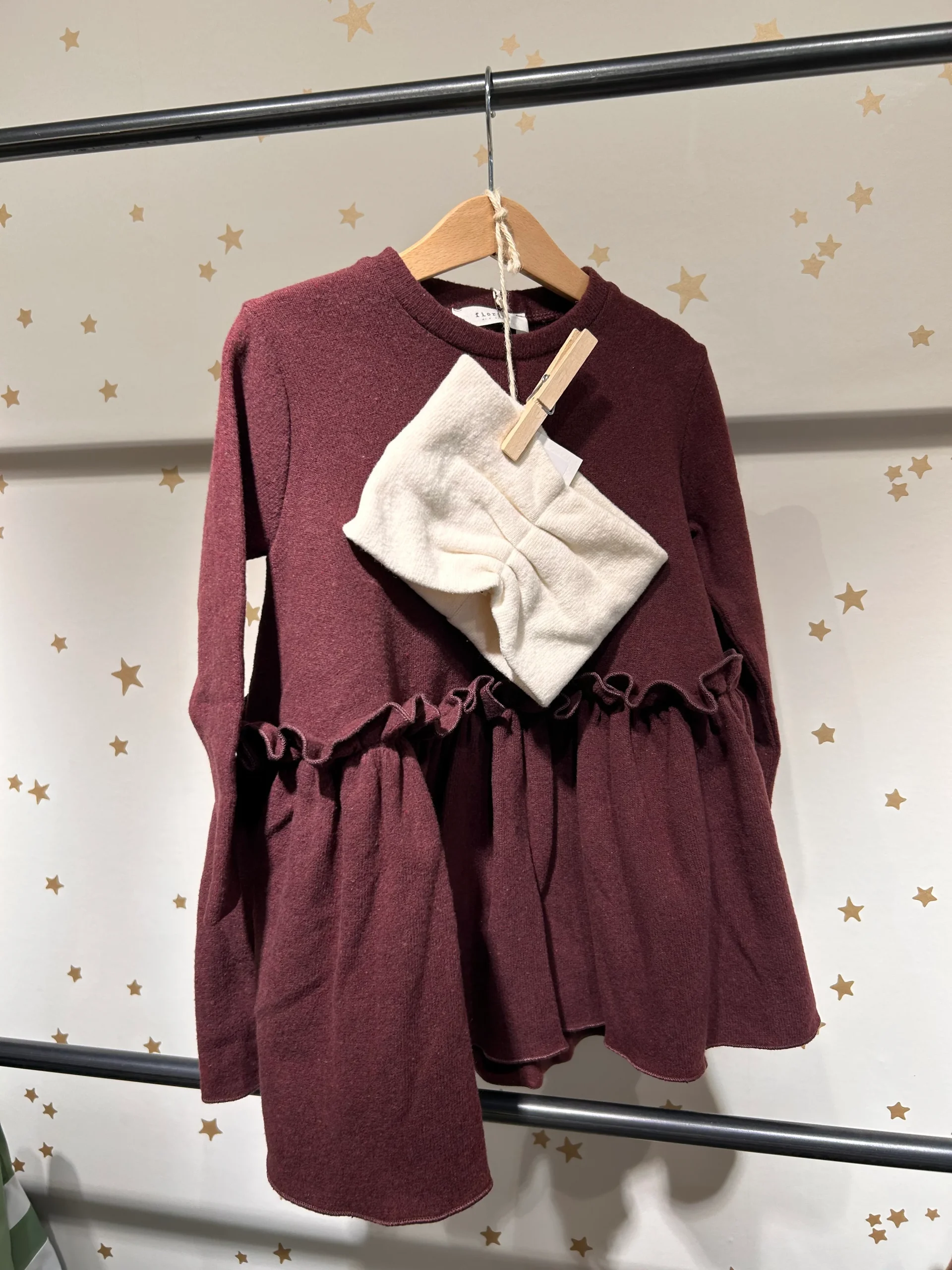 Questo abito in caldo cotone colore borgogna, è perfetto per la tua bambina, grazie al suo morbido tessuto che offre calore e comfort. Le maniche lunghe e la rouge tutt’intorno donano un tocco di raffinatezza al look, rendendolo comodo e carino allo stesso tempo. Ideale per ogni occasione!