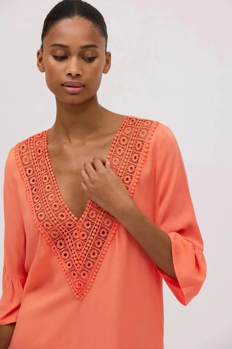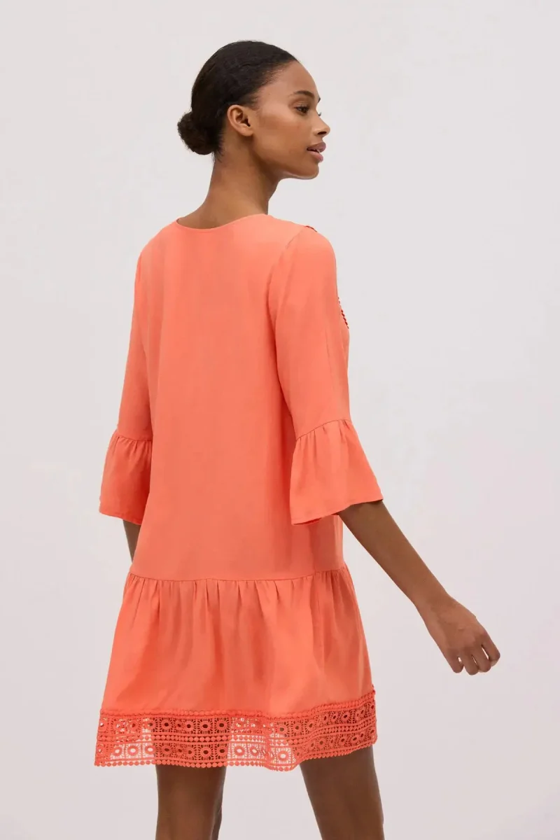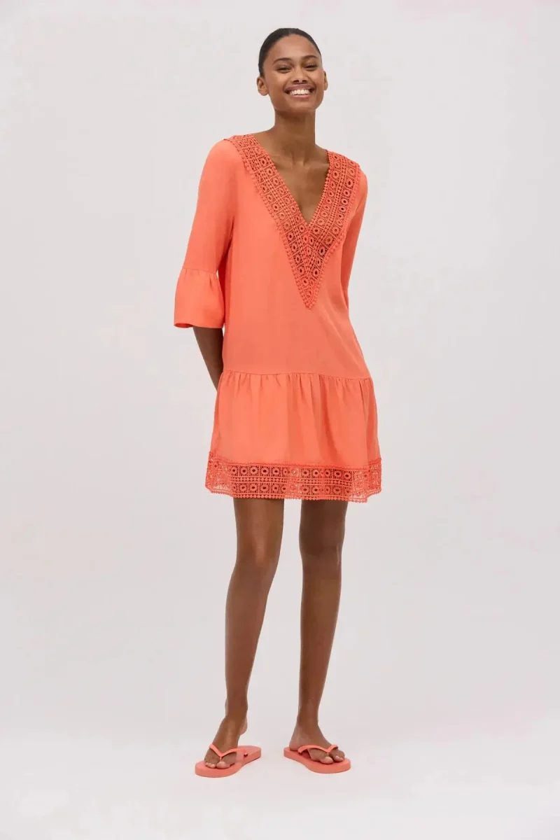 Abito fluido con stampa in tinta unita. Mezze maniche che coprono parzialmente le braccia e scollo a V che mette in risalto la figura. Dettaglio sul fondo del vestito e sullo scollo. Essendo fluido si adatta a diverse corporature e può essere utilizzato in diverse occasioni.
