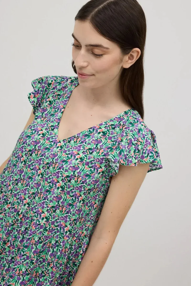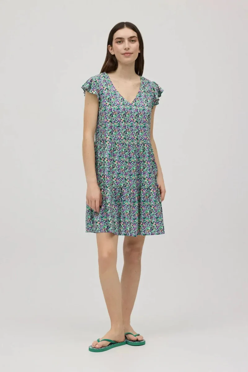 Abito corto con stampa floreale. Dettaglio volant sulle maniche che dona un tocco elegante al capo. Scollo a V per valorizzare la figura e fondo morbido per un maggior comfort. Abbinalo ai sandali e alla borsa della collezione e completa il look. Composizione 100% Viscosa art. 86143
