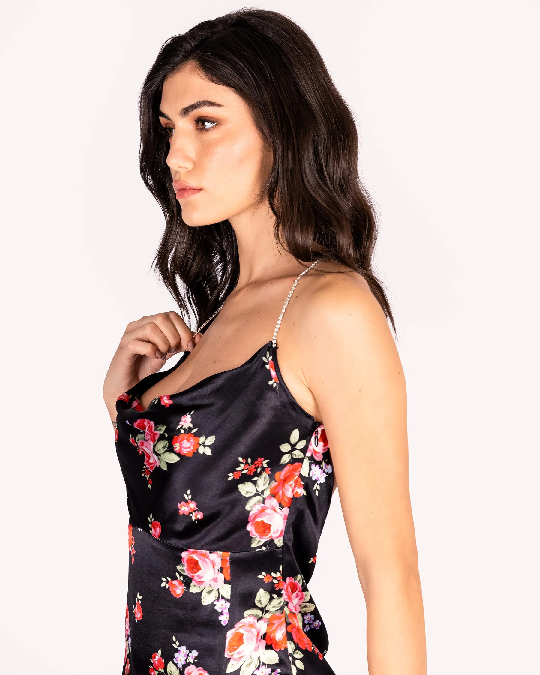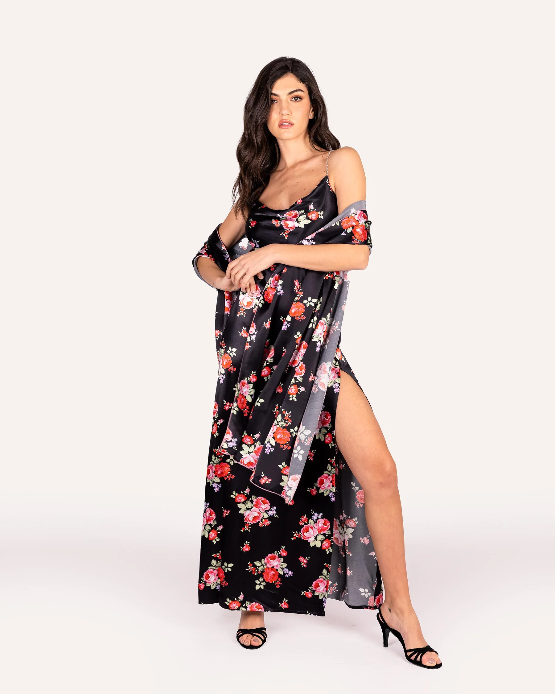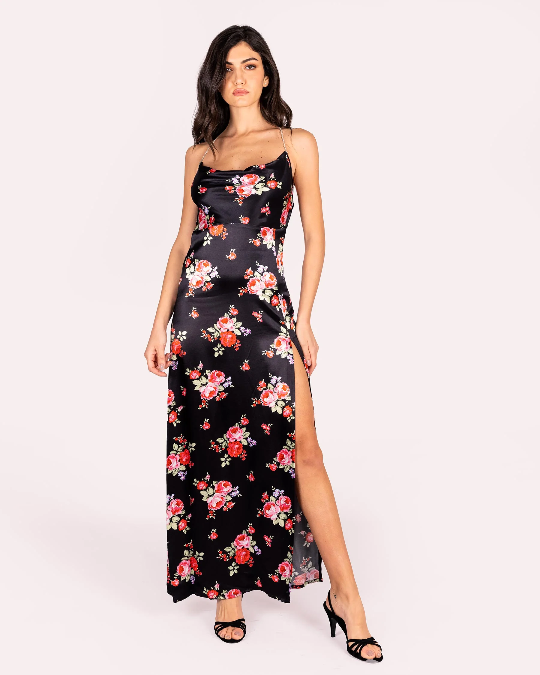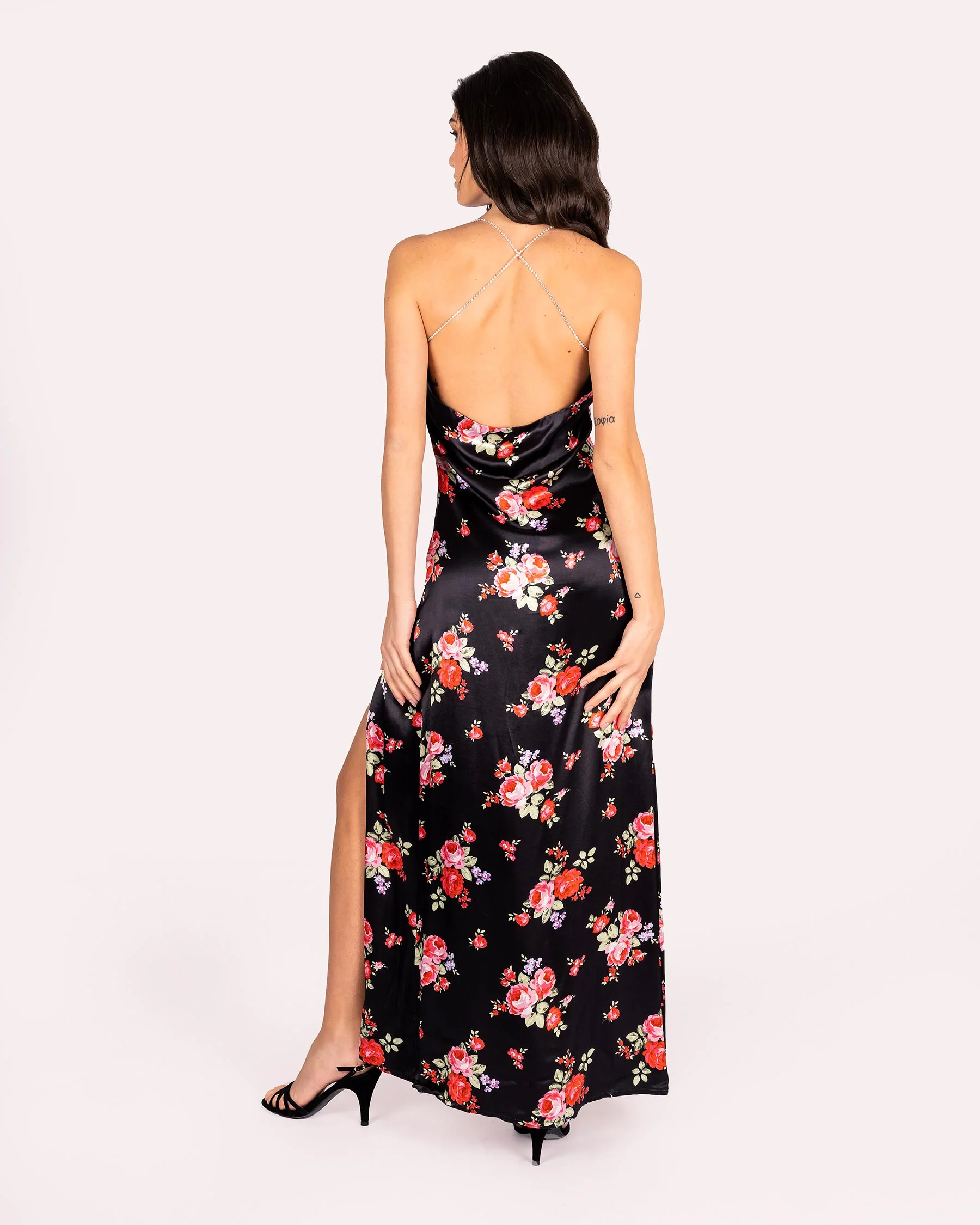 Abito in raso con stampa floreale Abito modello slip dress in raso Scollo a barca Retro con scollatura a barca e bretelline gioiello a incrocio Le bretelle sono certificate Preciosa Crystal, le pietre sono molto luminose e la base รจ sottoposta a trattamento di galvanizzazione per evitare che si ossidi Zip sul lato Spacco relativamente […]