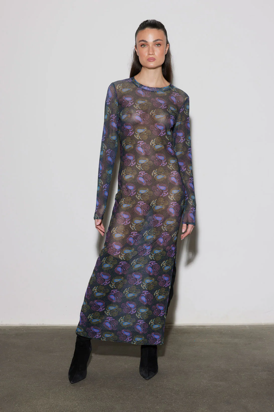 Abito lungo in tulle stampato, taglia unica, con maniche lunghe e fantasia paisley nei toni scuri. Leggero e fluido, ideale da stratificare. Lo spacco laterale aggiunge un tocco di eleganza e movimento.
