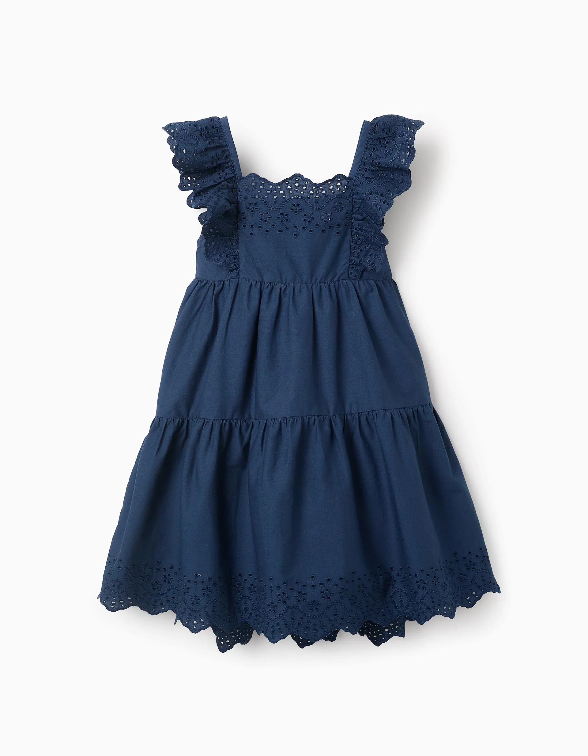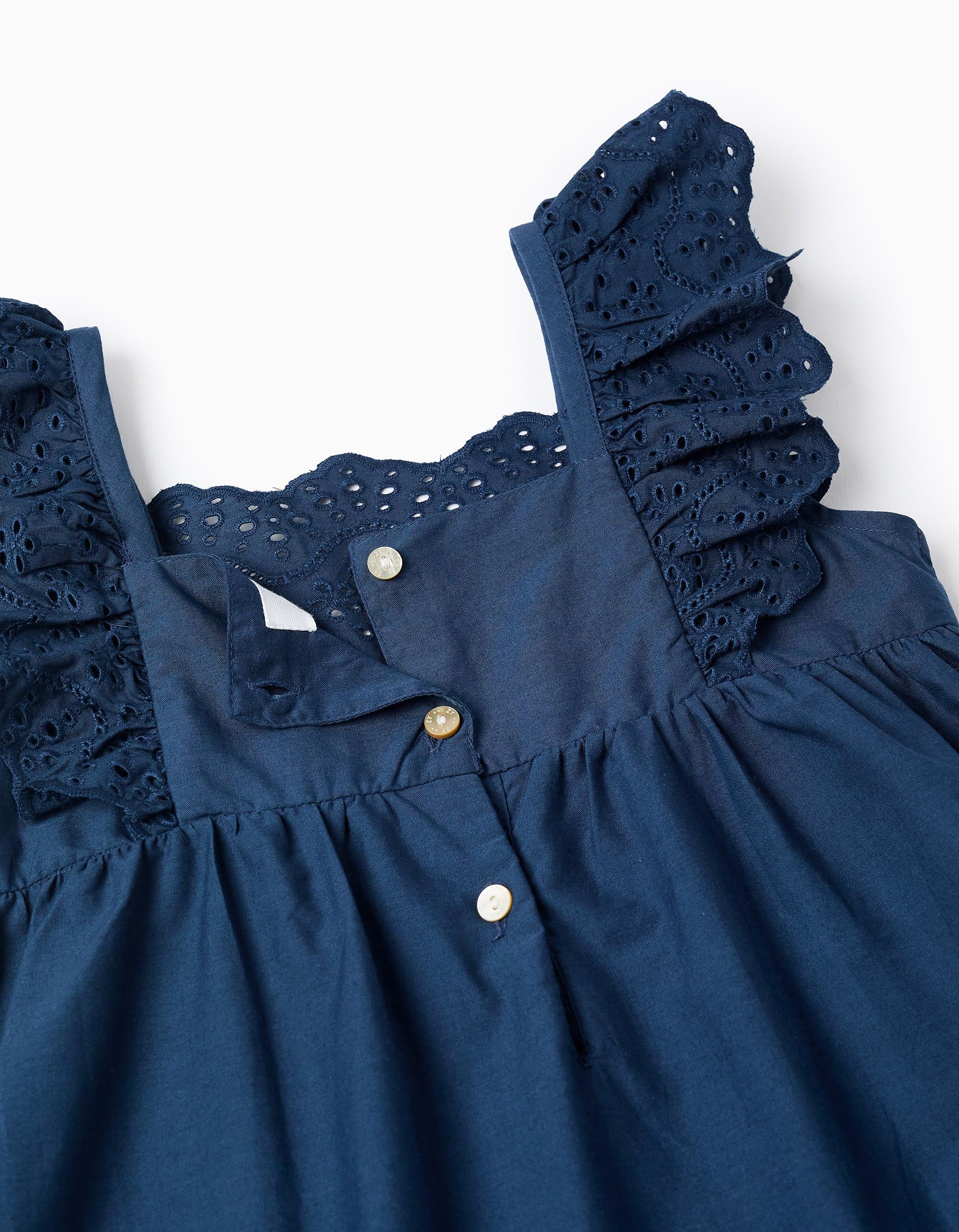 Abito blu scuro per bambine, 100% cotone, con volant e ricamo sangallo. Bottoni sul retro per una facile indossabilità. Con fodera. Un capo leggero, comodo ed elegante, perfetto per ogni occasione.