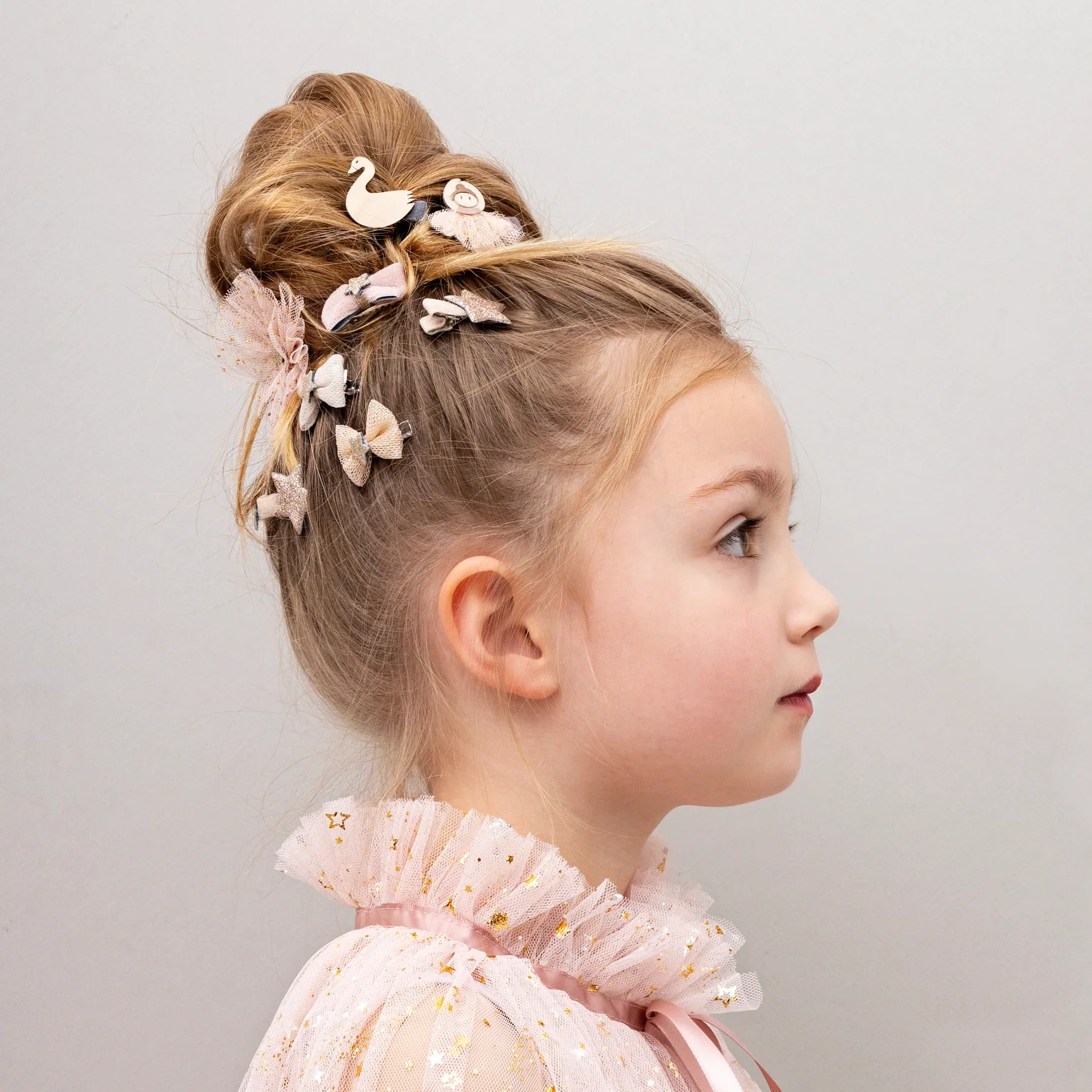 Le piccole ballerine adoreranno questo grazioso paio di fermagli a forma di stella da ballerina. Con delicati strati di tulle glitterato dorato, questi manterranno sicuramente i loro capelli en pointe come i loro movimenti!