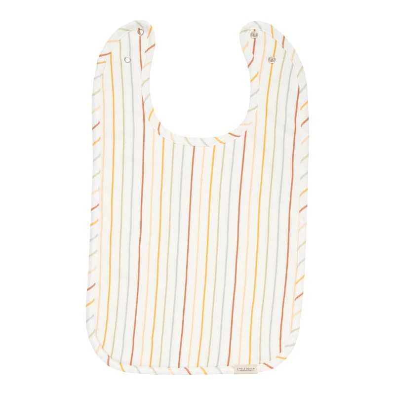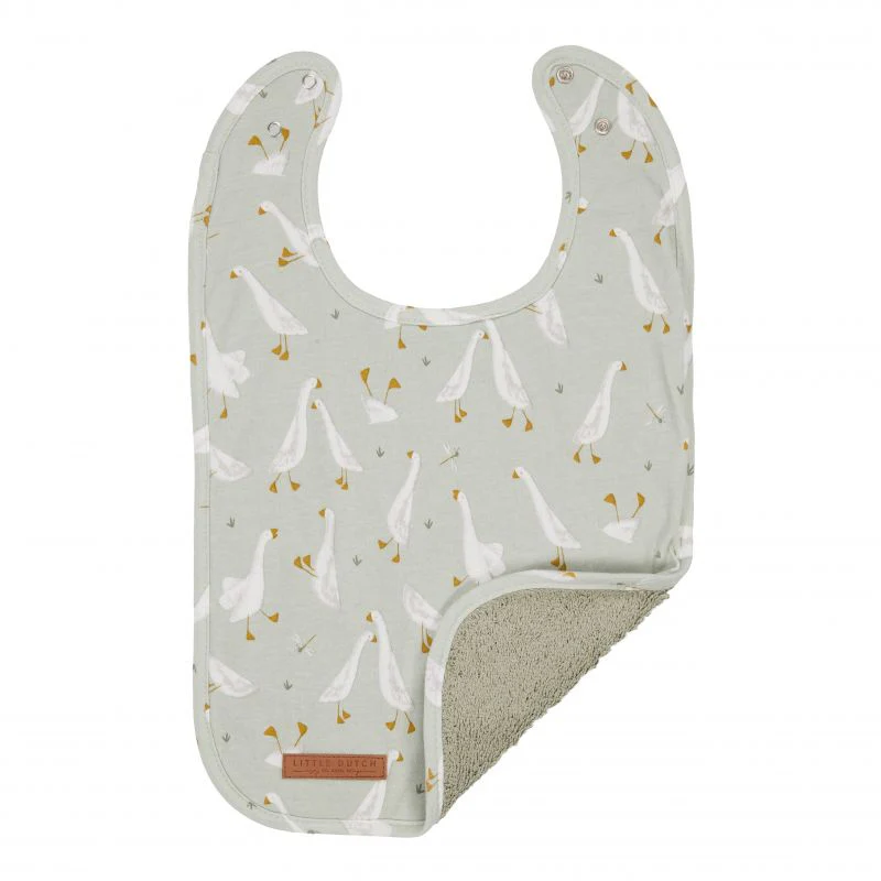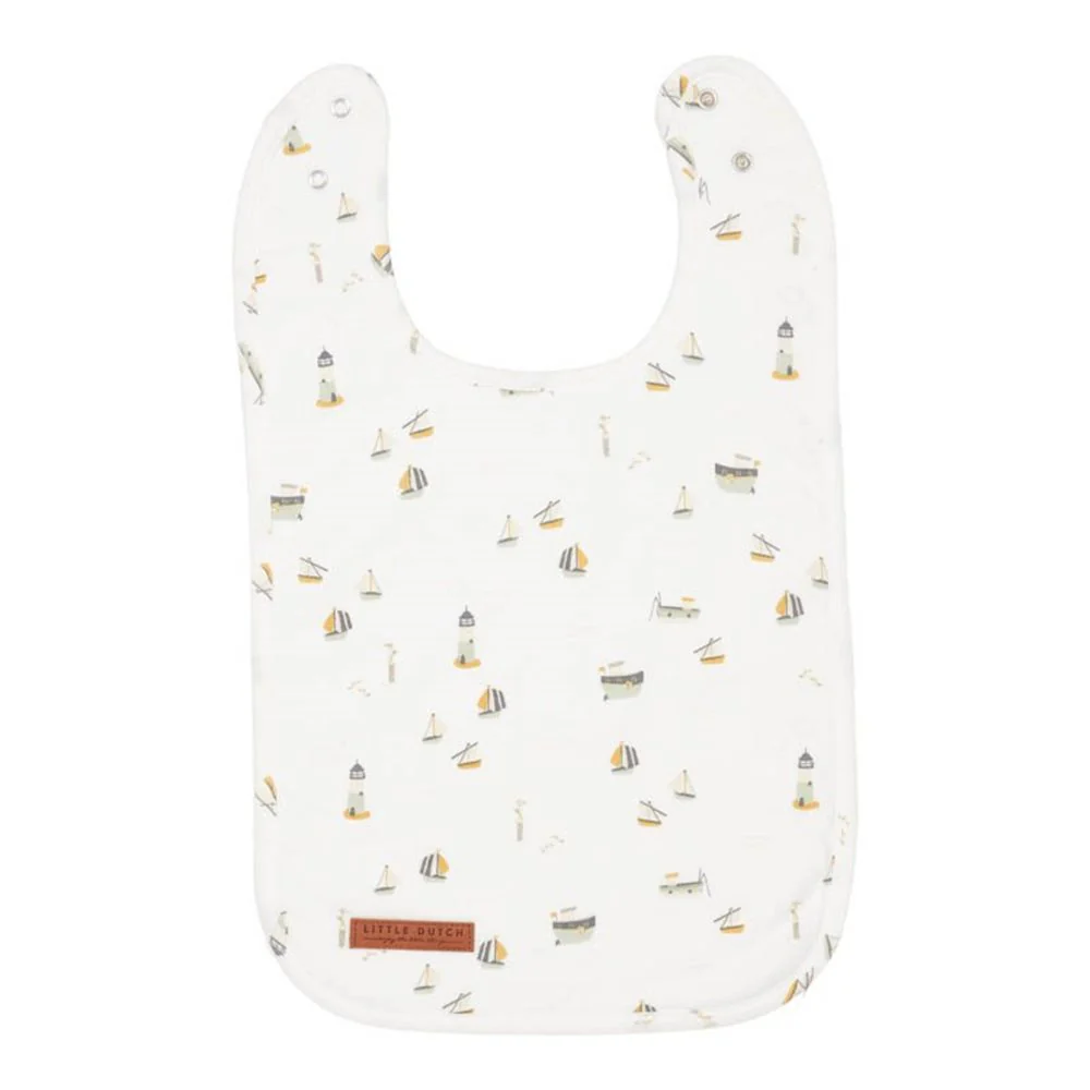 Bavaglia in varie fantasie. La parte posteriore è realizzata in morbido tessuto di peluches e ha due bottoni a pressione per regolare la taglia.