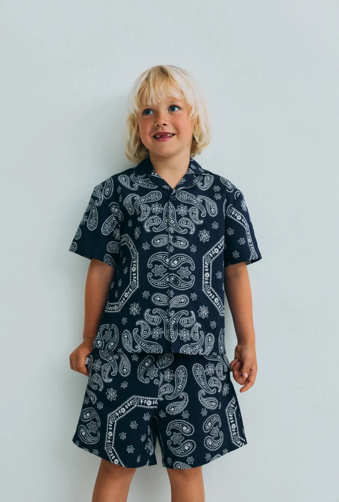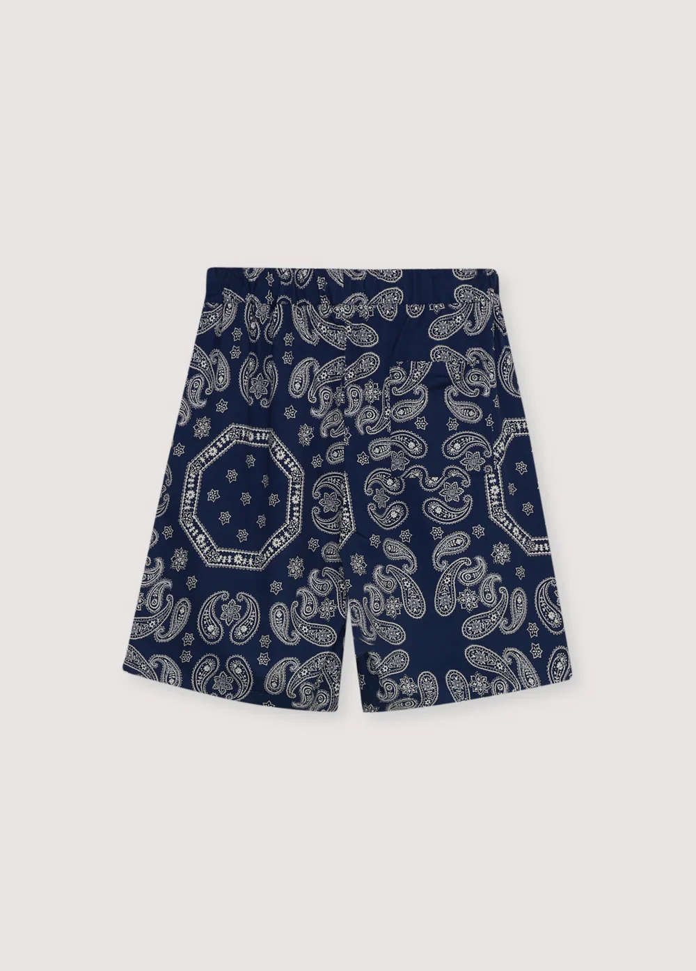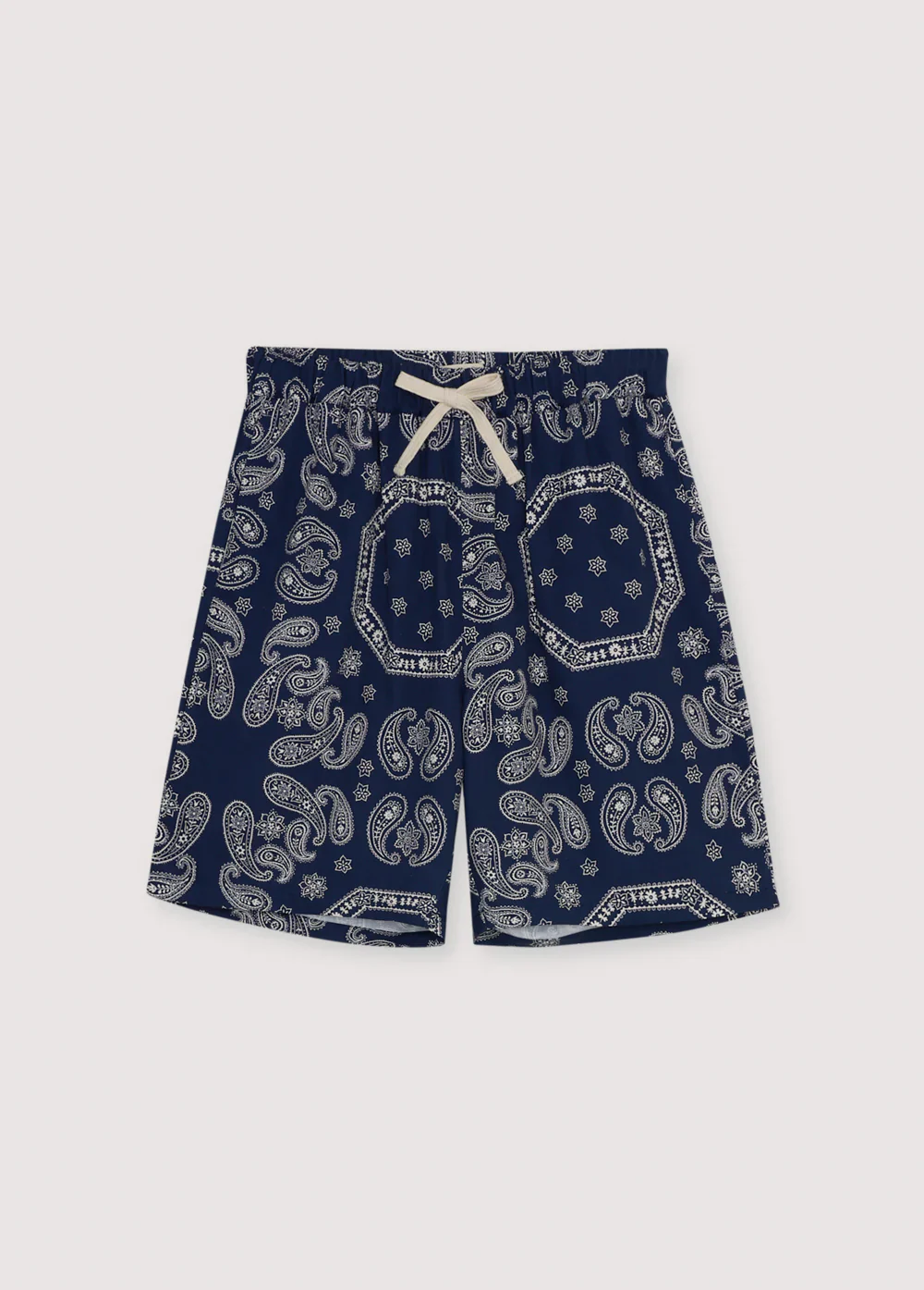 Bermuda realizzati in morbido cotone con stampa bandana bicolore blu navy. Presenta una cintura regolabile con coulisse e tasche laterali per comfort e funzionalità. Perfettamente in stile con la t-shirt panna Bonsai per un look fresco e giocoso.