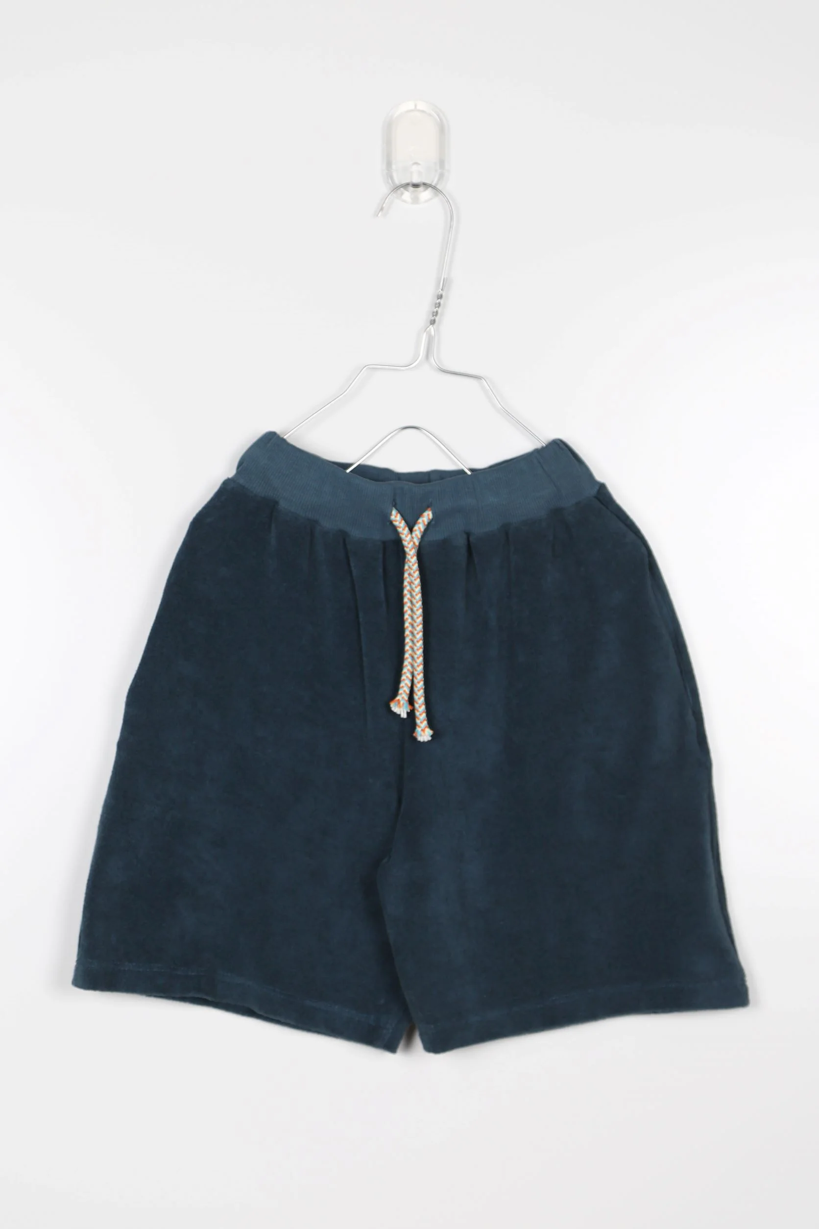 Bermuda in spugna di cotone color petrolio, elasticizzato e regolabile in vita, taschino sul retro