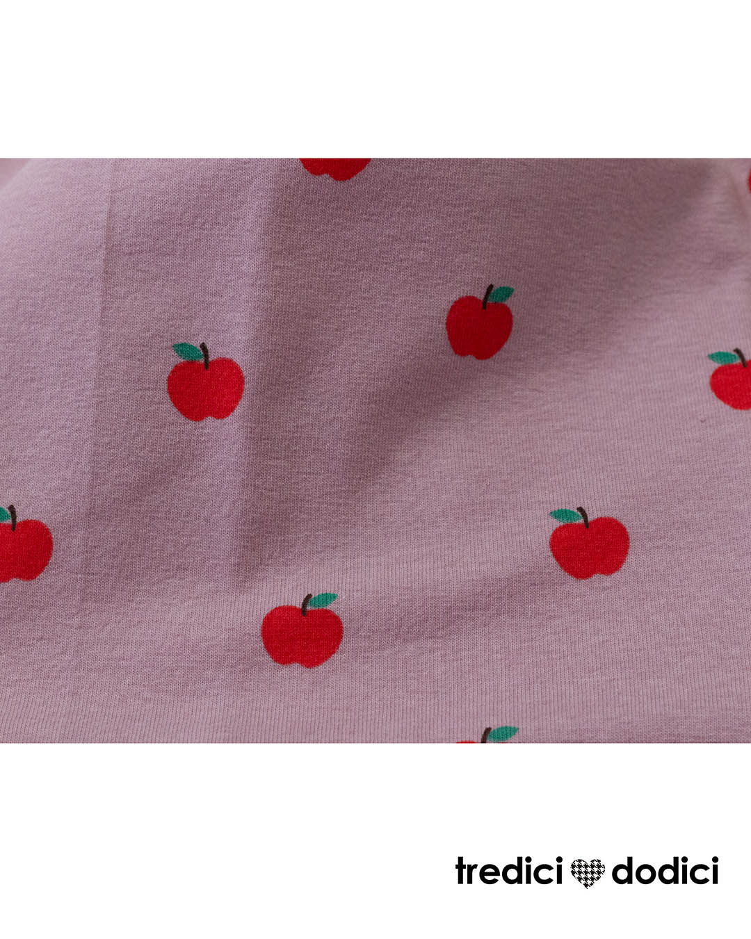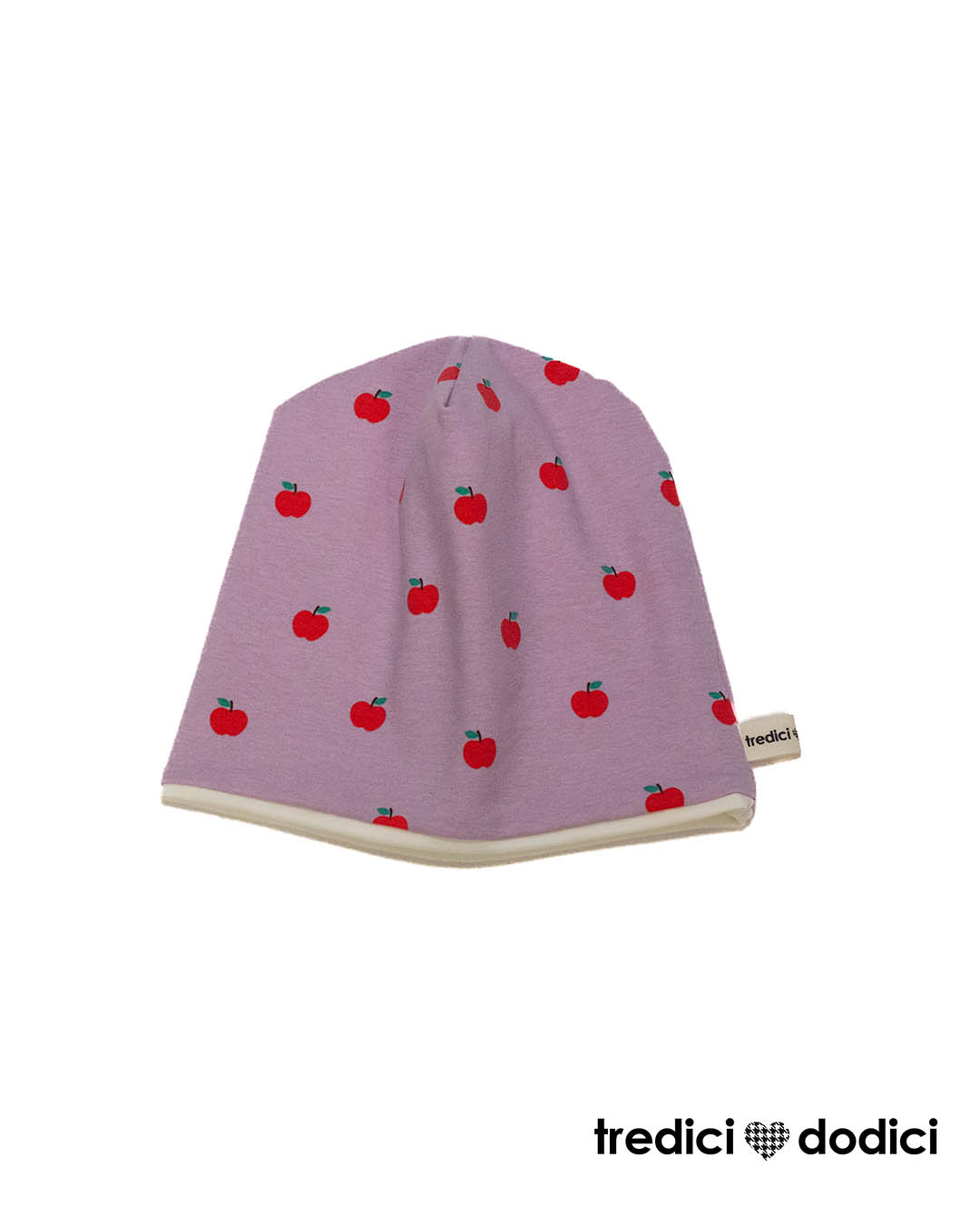 Berretta doppio strato in jersey di cotone double face. Da un lato fantasia mele e dall’altro panna.