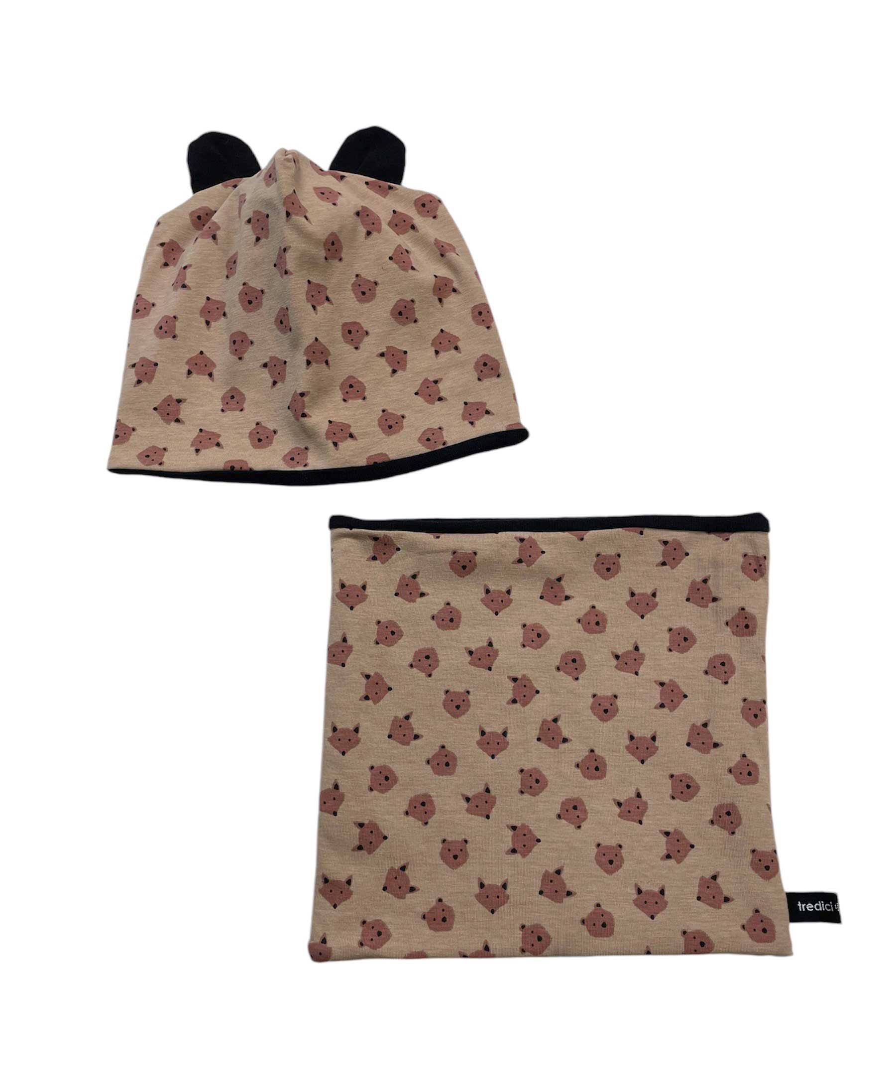 Berretta in caldo cotone e jersey stampa volpi e orsi con orecchie. Possibilità di abbinarla allo scaldacollo della stessa fantasia. Articoli venduti separatamente.