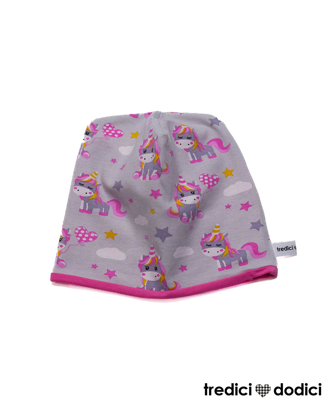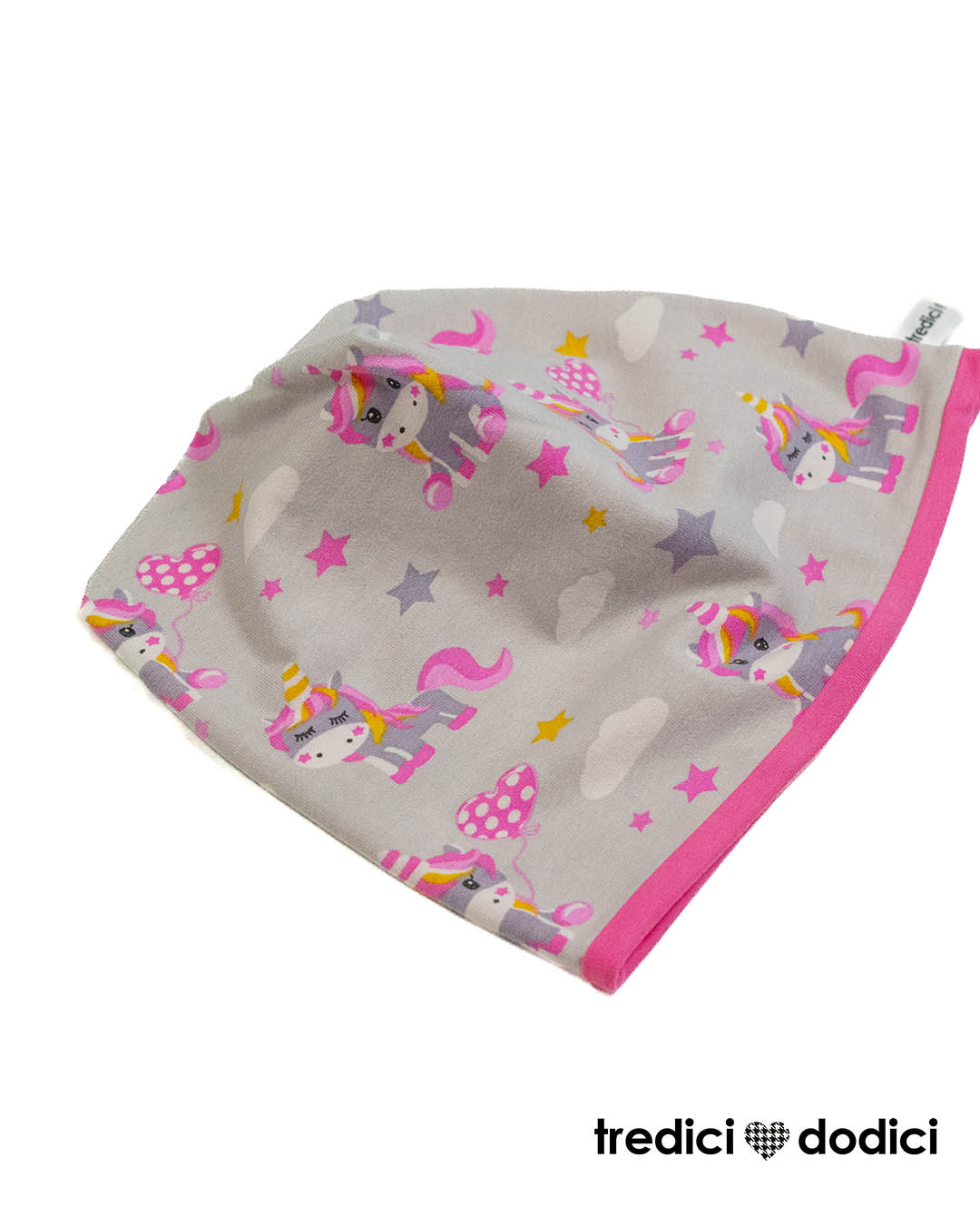 Berretta double face in jersey di cotone fantasia unicorni. Disponibile lo scaldacollo della stessa fantasia per fare il completo. Scaldacollo venduto separatamente.