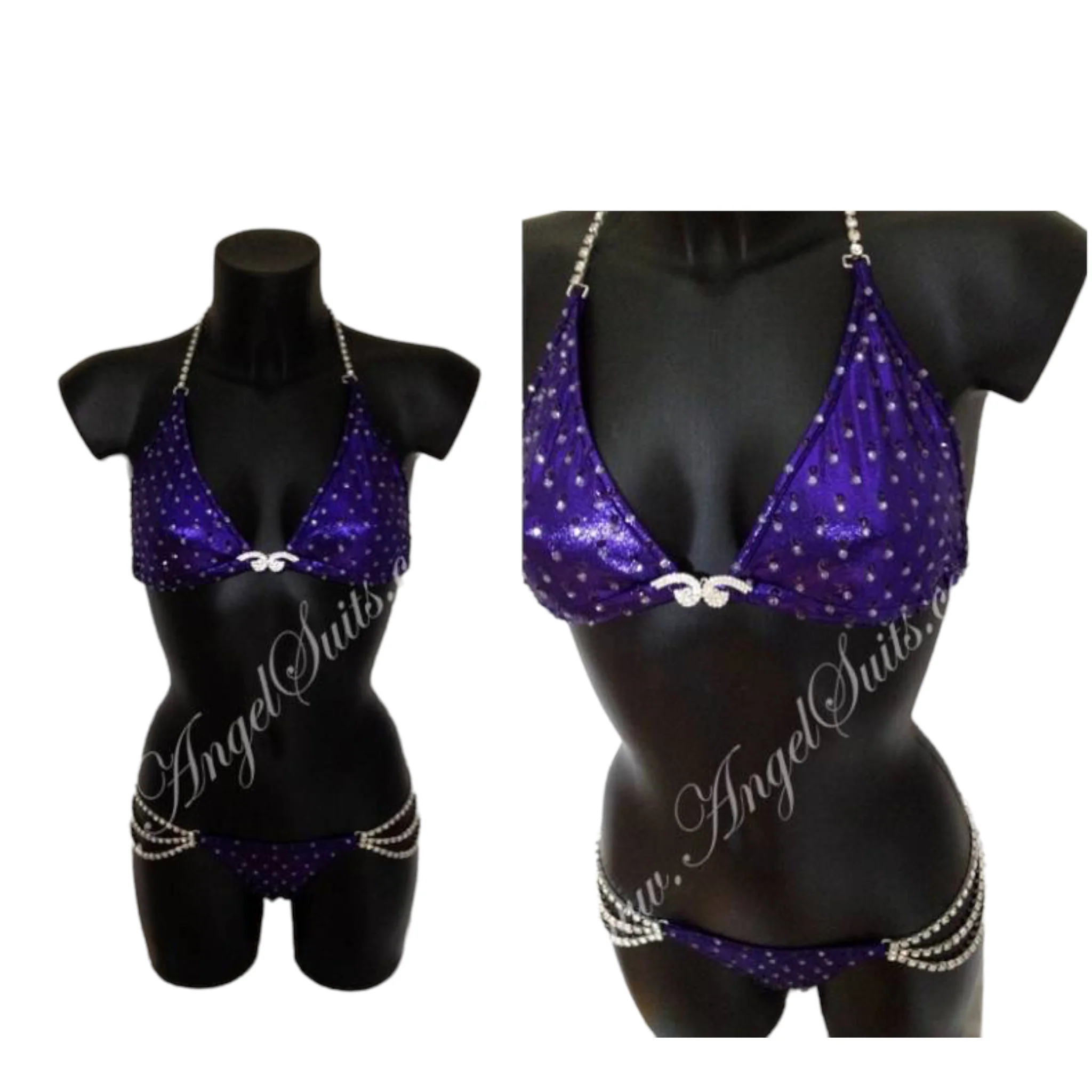 Bikini tessuto viola mist, decorazione pietre densita’ 3 con crystalli originali swarovski toni viola -reggiseno III, slip XS- connettori come da foto, push up inclusa-