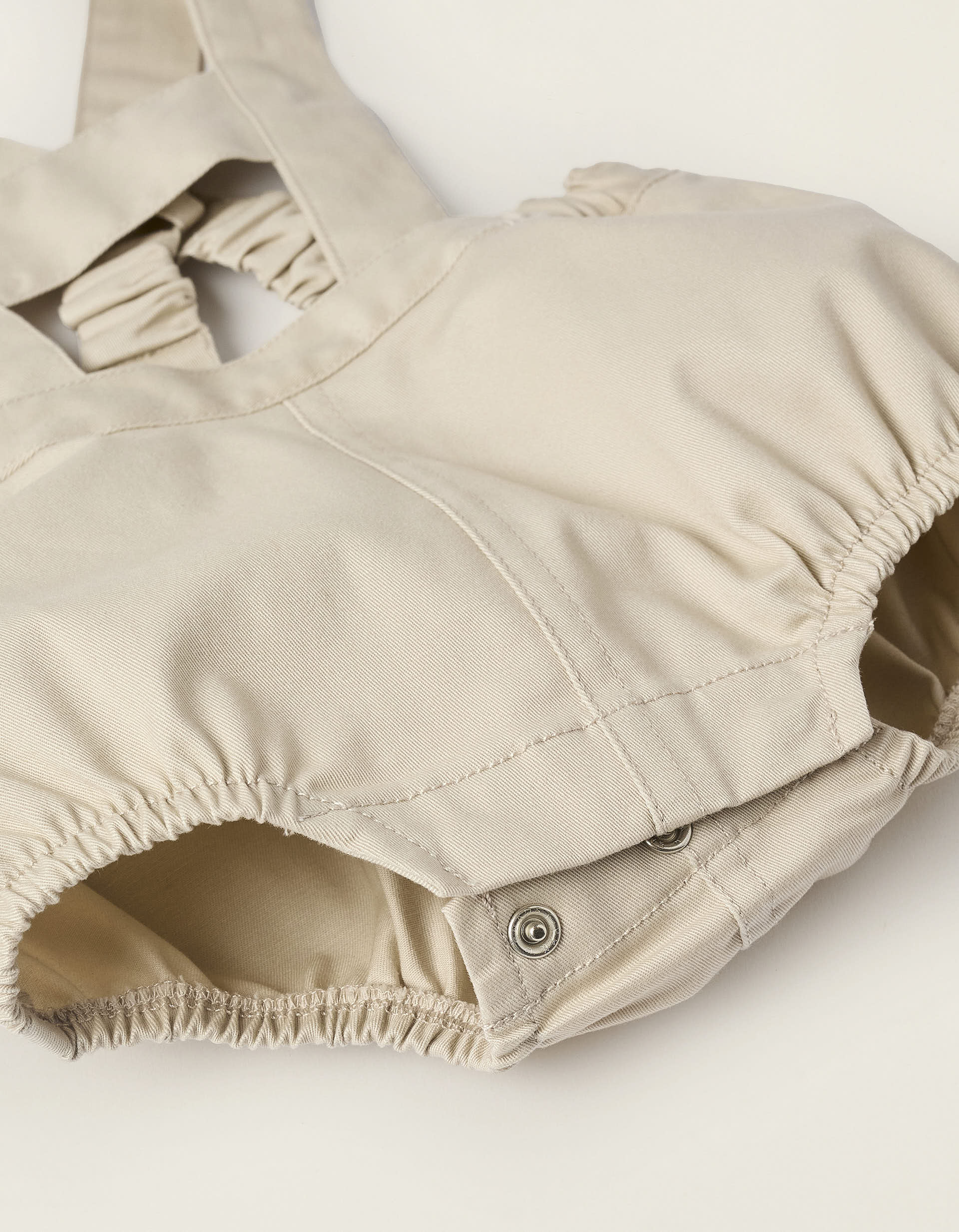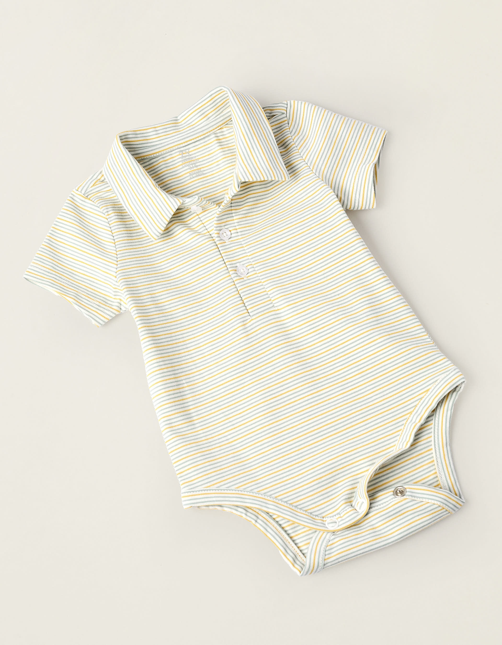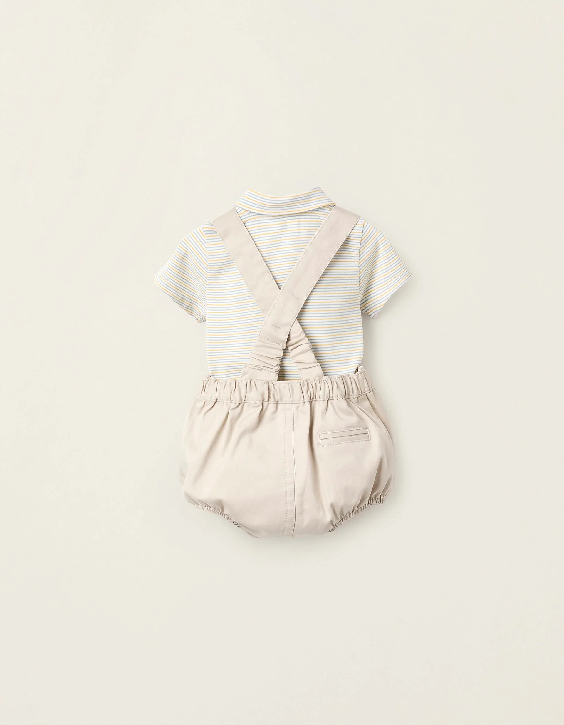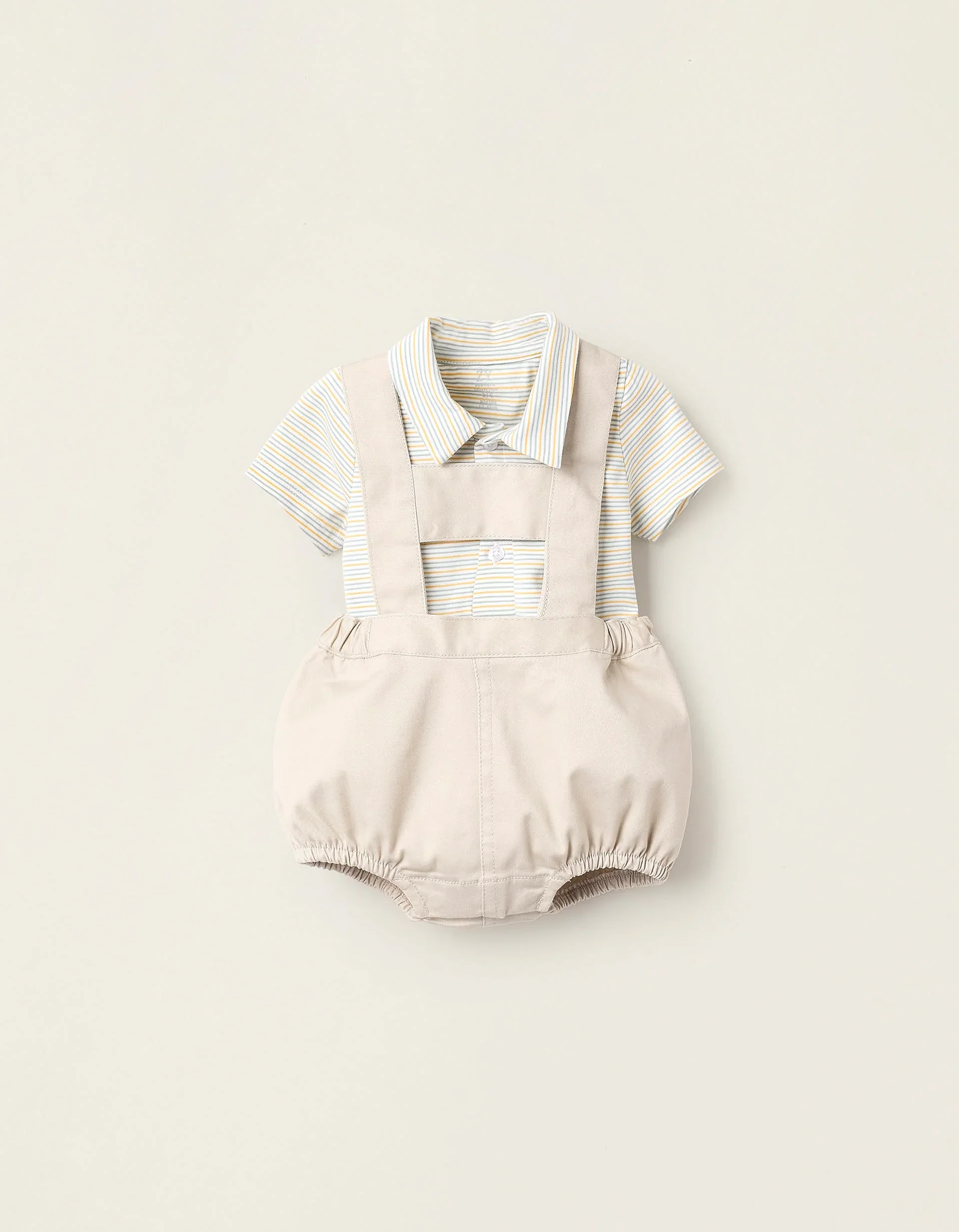 Completo due pezzi per neonati. È composto da una tutina a righe con colletto stile polo; e una tuta beige con spalline regolabili e rimovibili. Vita regolabile e comoda. Da indossare insieme o separatamente.