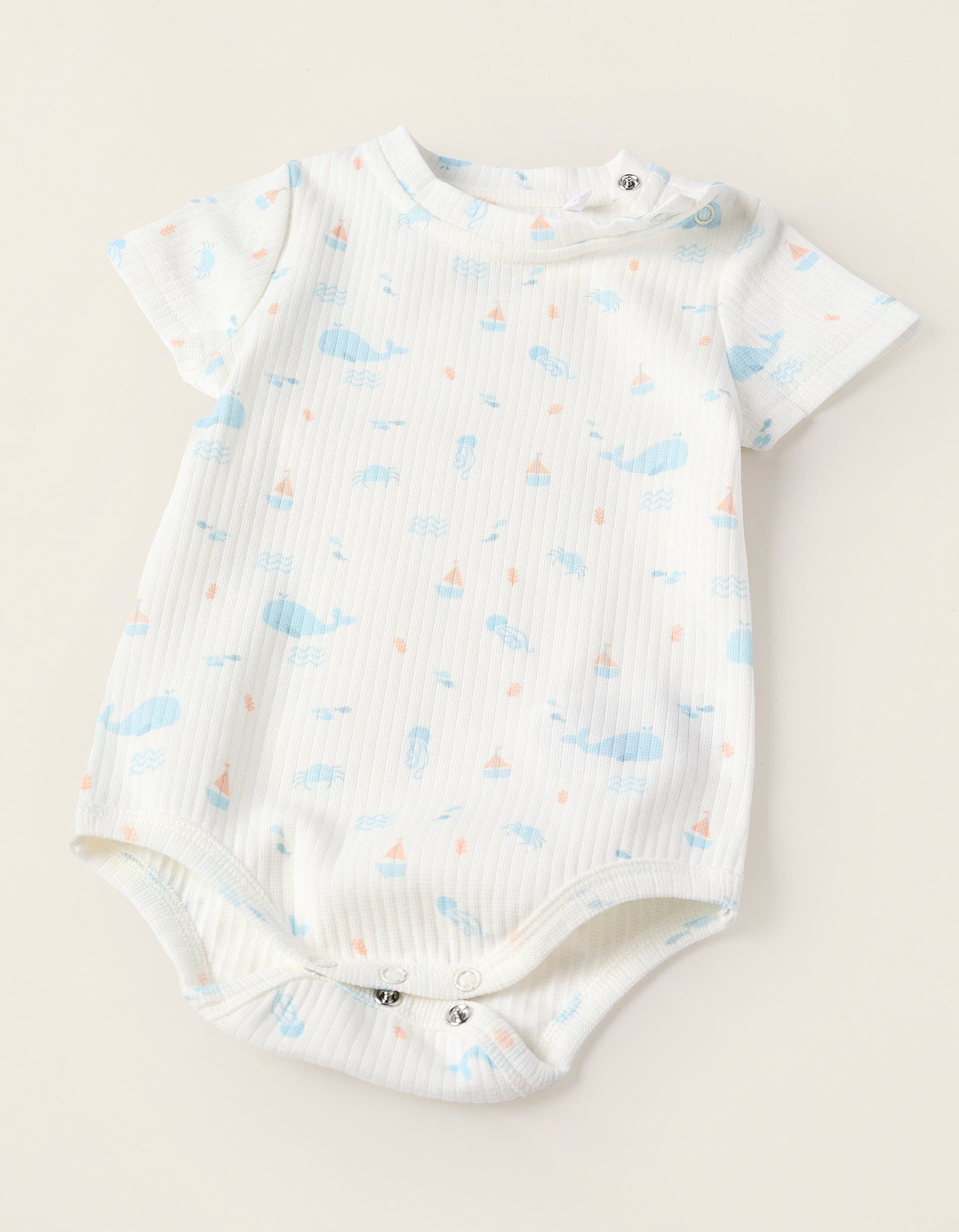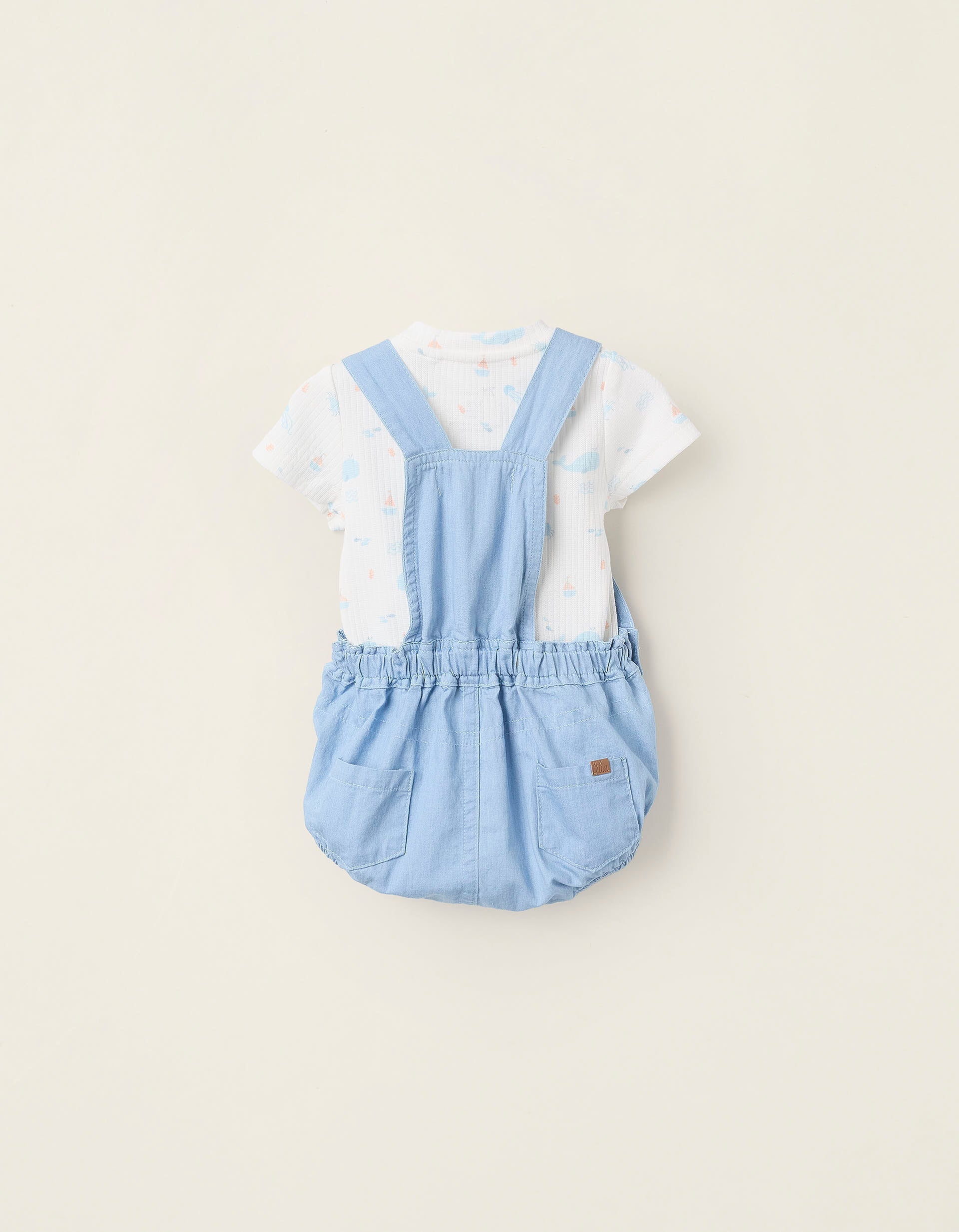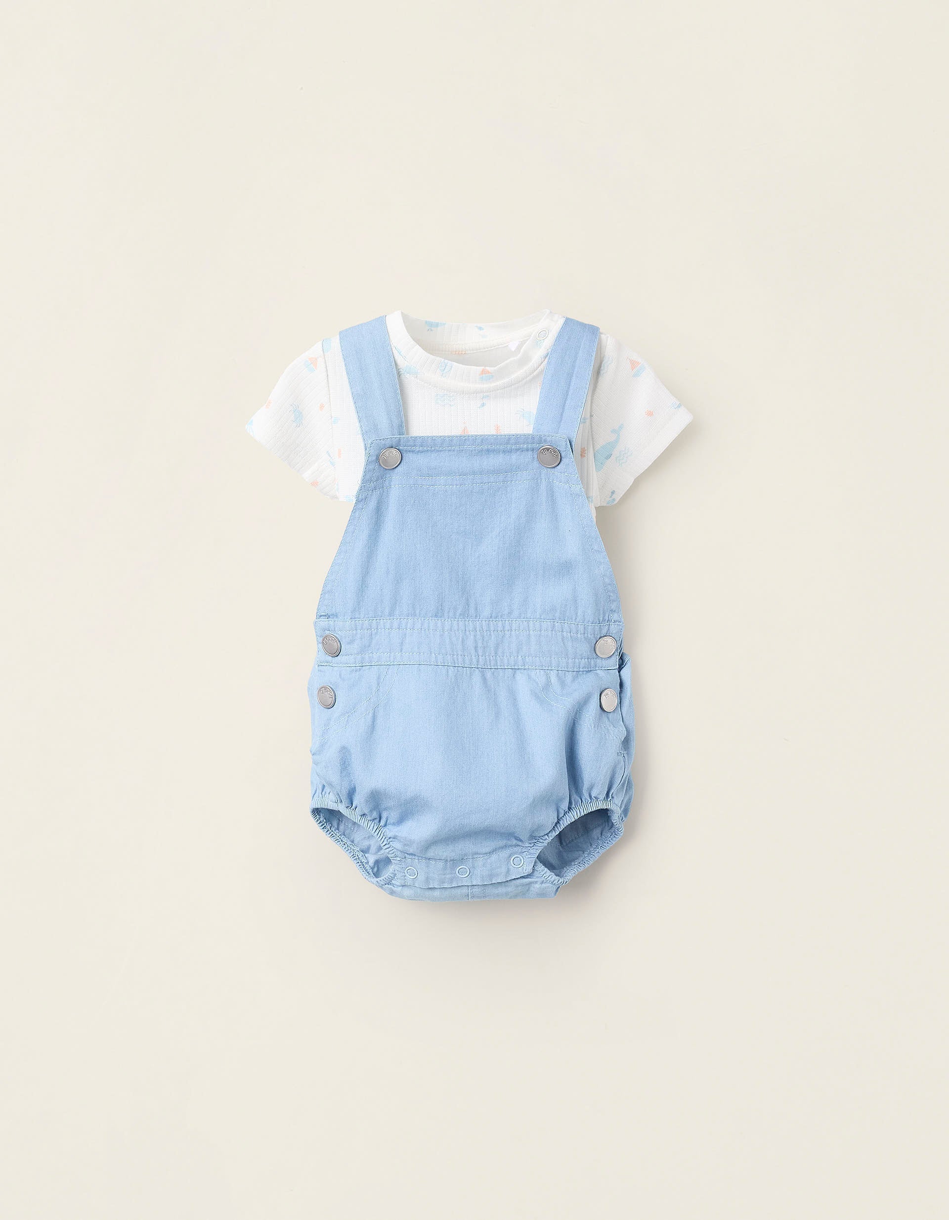Completo due pezzi per neonato, 100% cotone. È composto da una tutina a costine con motivo balena, granchio e medusa; e da una tutina corta in denim leggero, con orli elastici per una vestibilità perfetta. Un completo morbido e confortevole, da indossare insieme o separatamente.