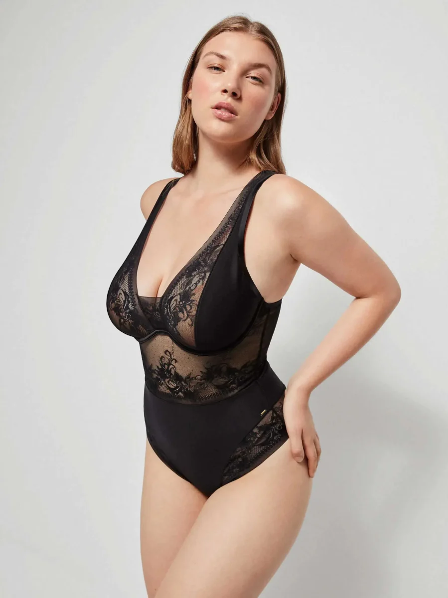 Body con ferretto e coppe di foam ultraleggero in tessuto di pizzo extra piano molto delicato e femminile che non lascia segni. Finiture satinate per un maggiore comfort e retro effetto perizoma. Chiusura posteriore e spalline regolabili. Disponibile nella coppa B.