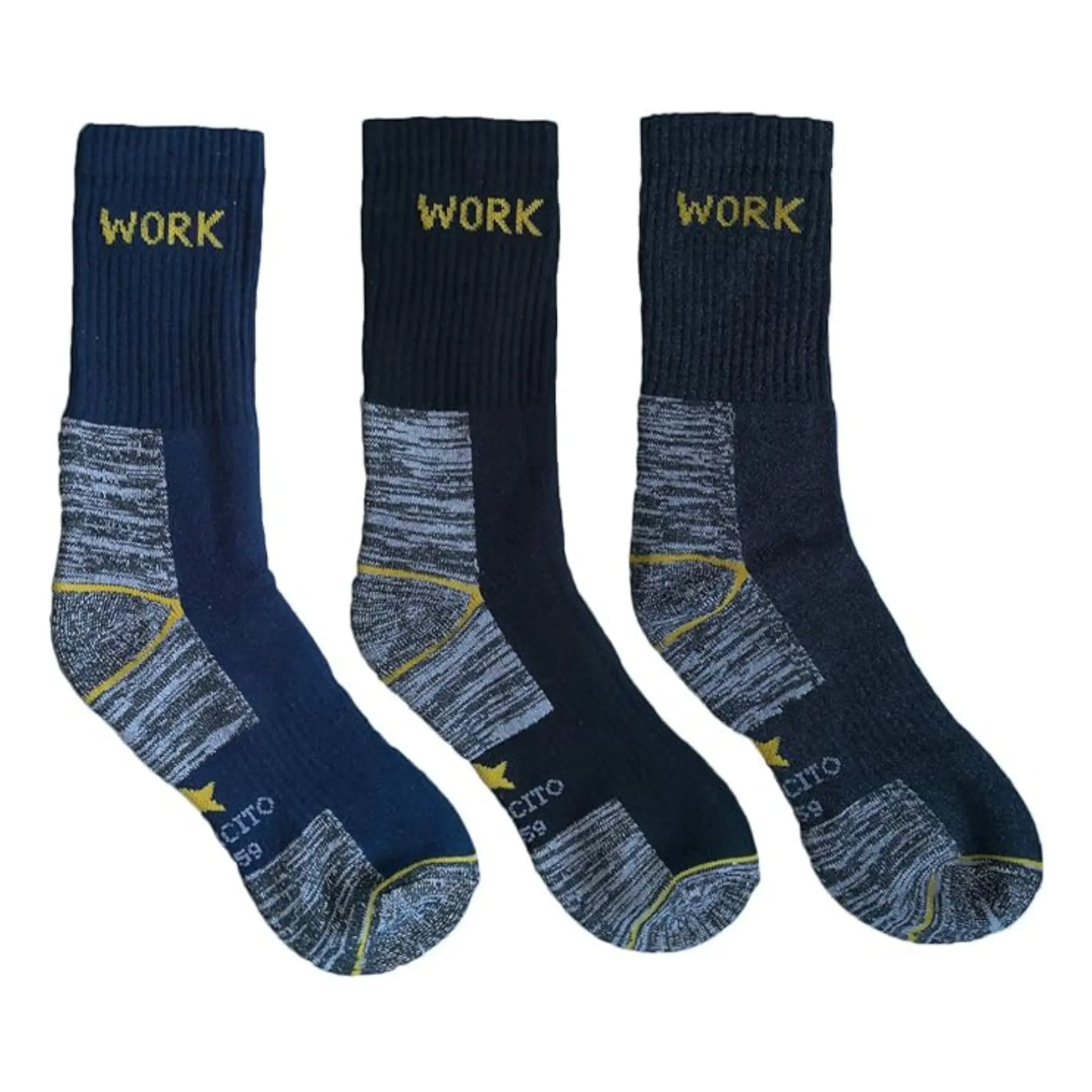 Confezione: Set da 3 paia Modello: Work rinforzato adatto per il lavoro Tessuto: 63% Cotone, 35% Poliestere, 2% Elastan Colori: Assortito