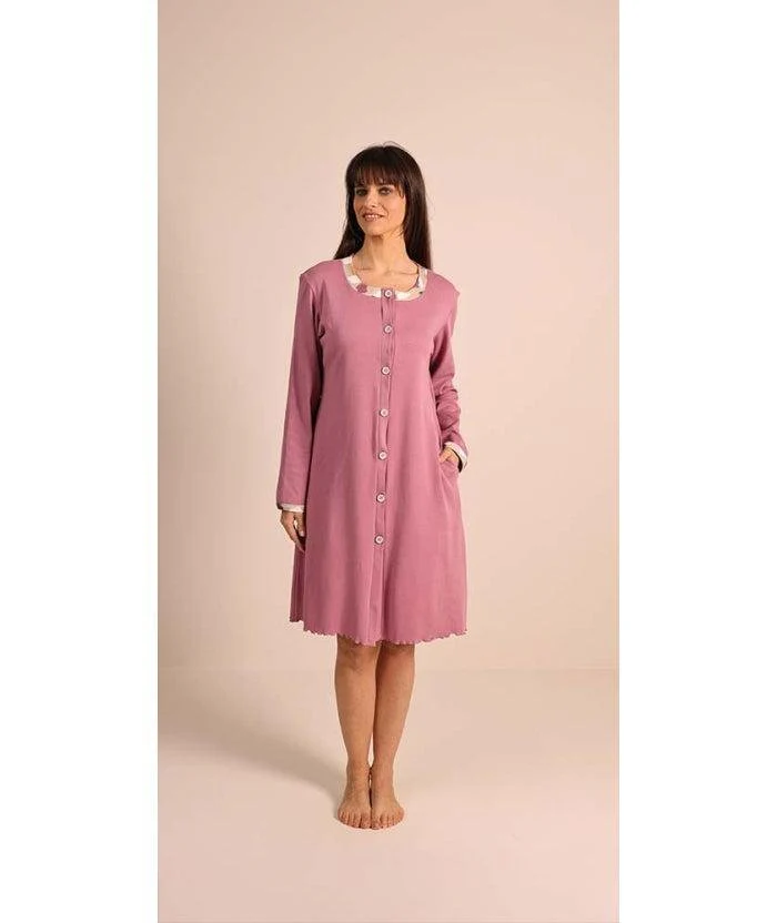 Camicia da notte in caldo cotone completamente aperta con bottoni, tinta unita con bordini a fantasia.