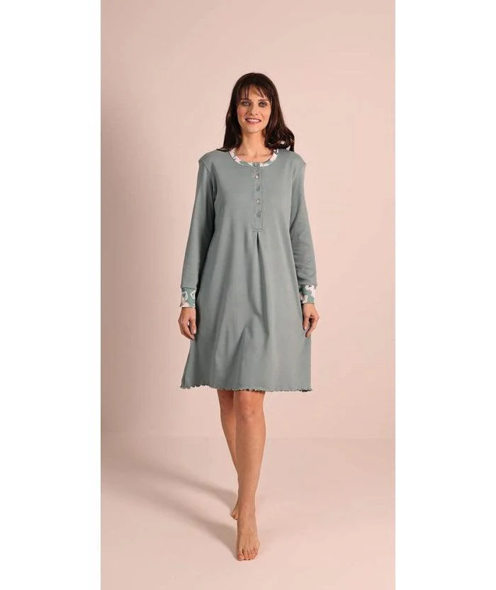 Camicia da notte in interlock con collo serafino 5 bottoni, completamente in tinta unita in morbido caldo cotone.
