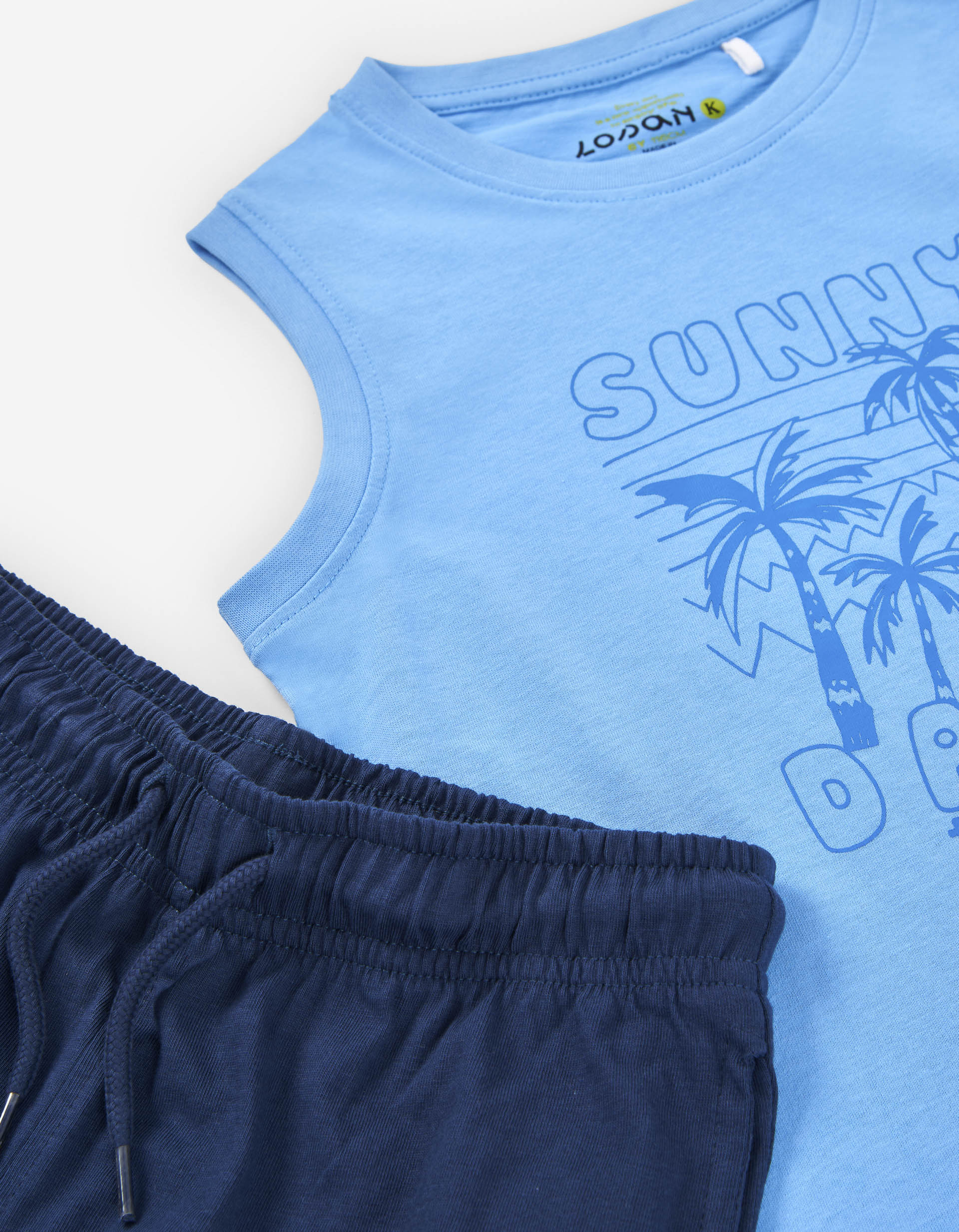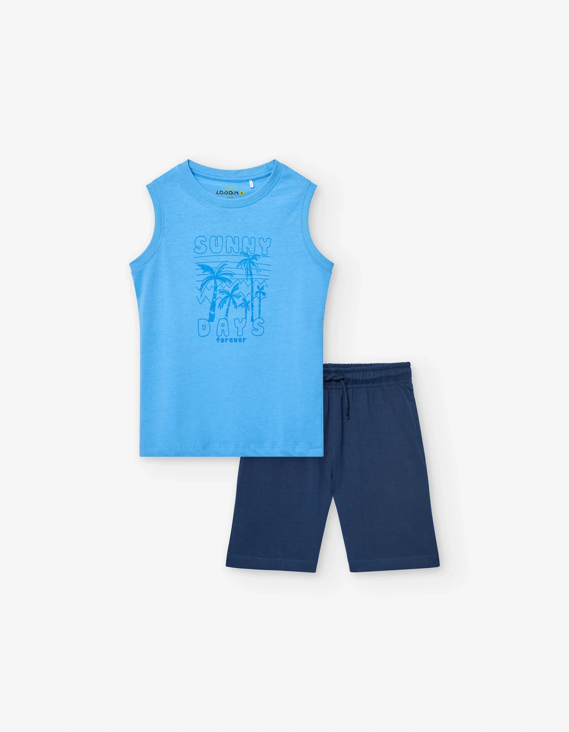 Completo due pezzi per bambino, in jersey 100% cotone. Include una canotta blu con stampa frontale e pantaloncini blu scuro a tinta unita.