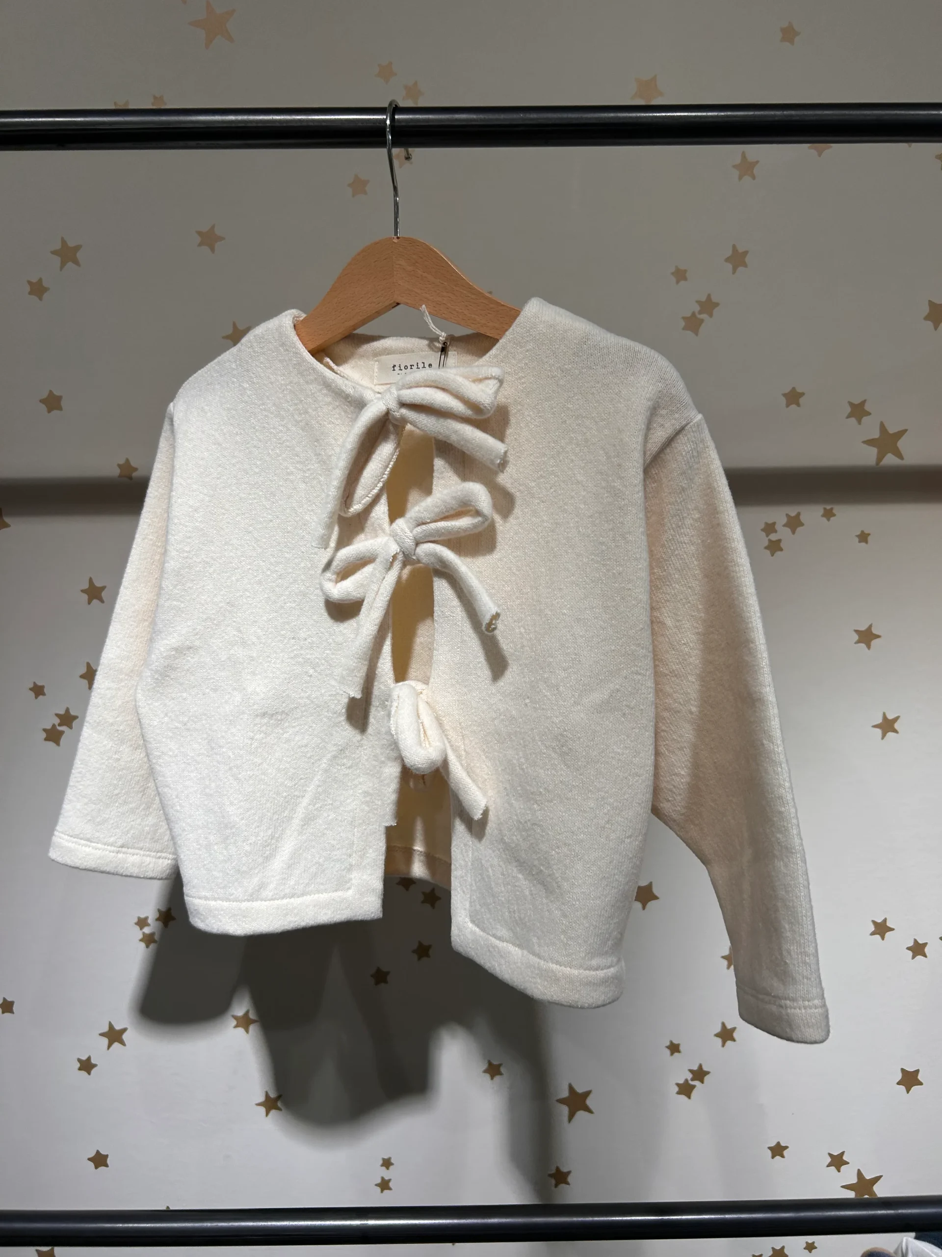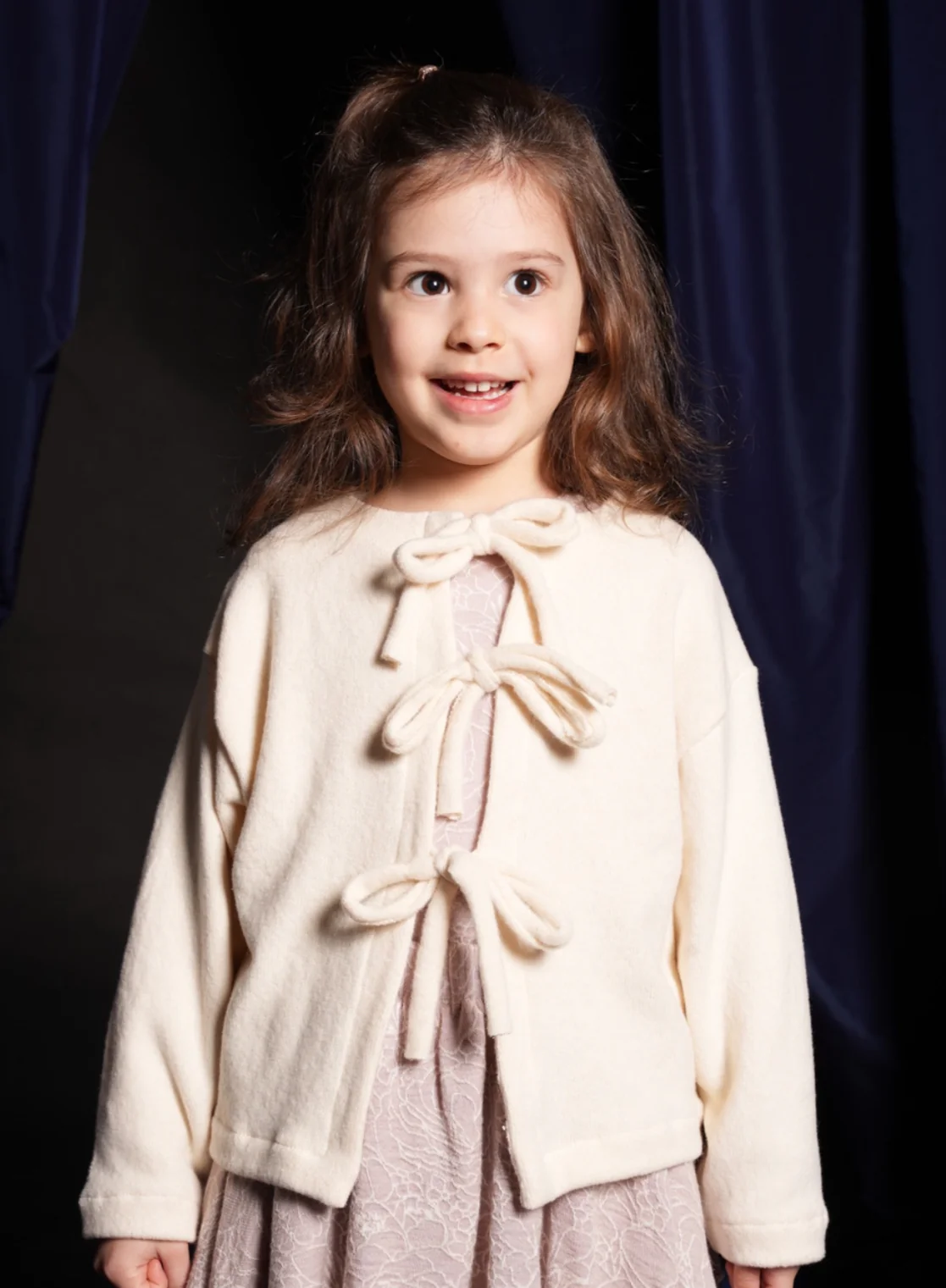 Questo cardigan da bambina in morbido caldo cotone avorio è sia chic che dolce. Con laccetti che formano dei fiocchi, si abbina facilmente a qualsiasi capo come il pantalone in velluto nostalgia rose. Resta calda e alla moda con questo elegante cardigan.