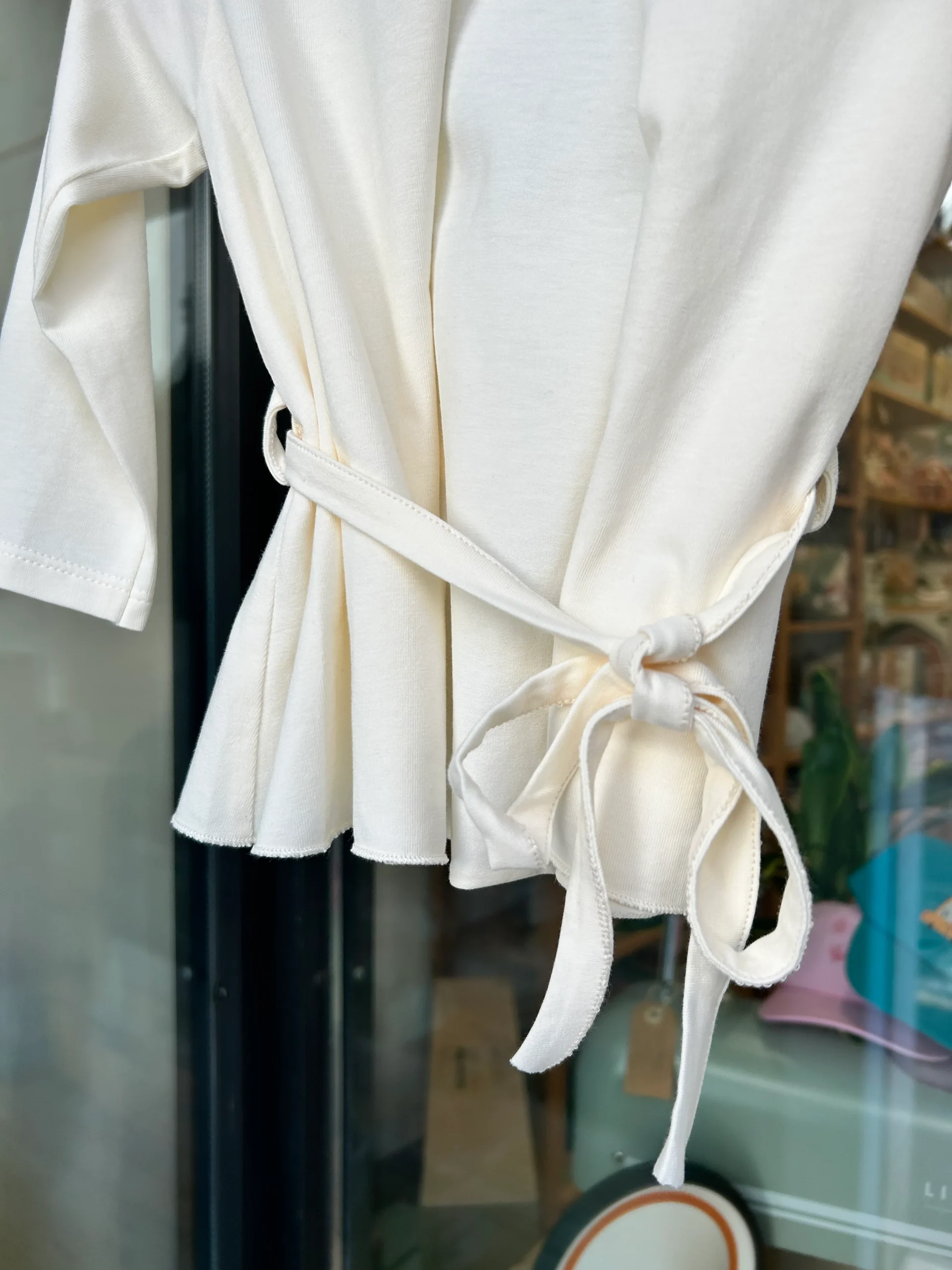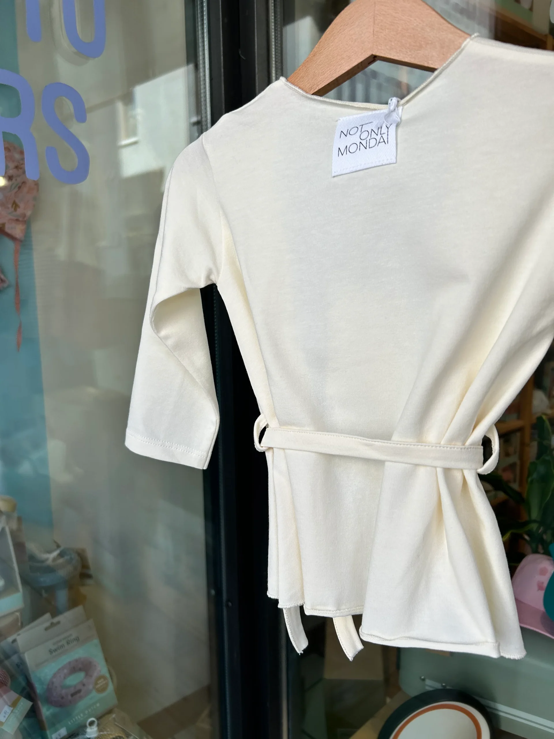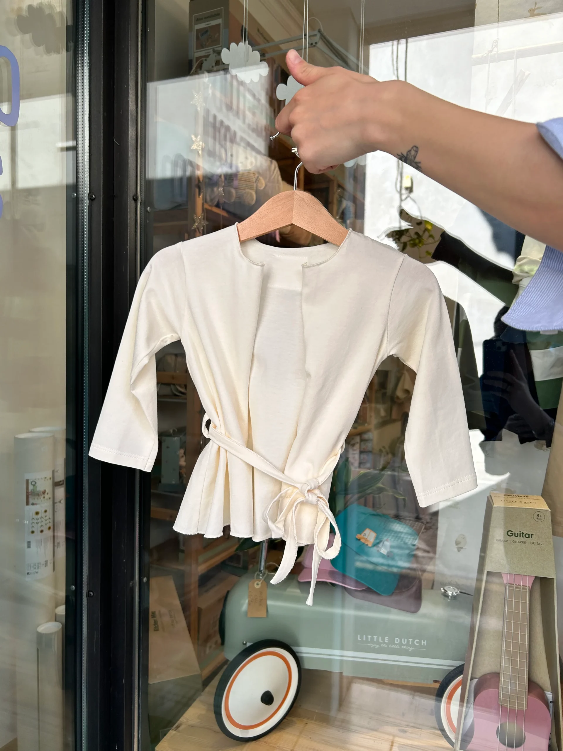Questo cardigan da bambina in morbido cotone è perfetto per ogni occasione. Di colore écru, è ideale per le mezze stagioni e l’estate. Le sue cuciture a taglio vivo e la chiusura con laccetto lo rendono semplice ma elegante allo stesso tempo. Goditi la freschezza e la comodità di questo capo.