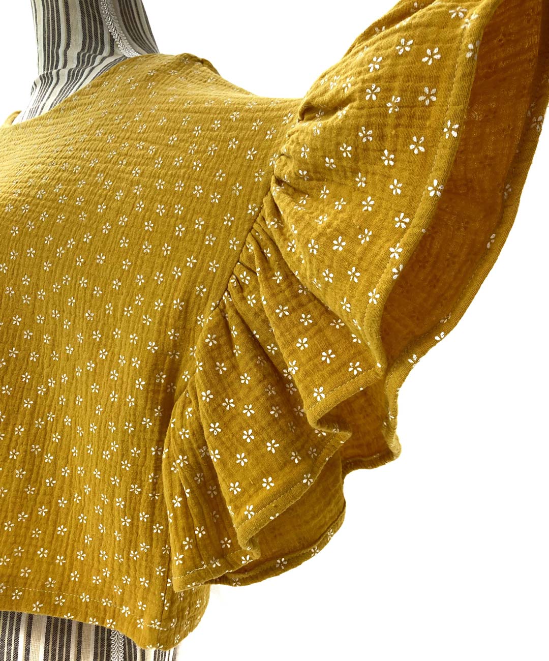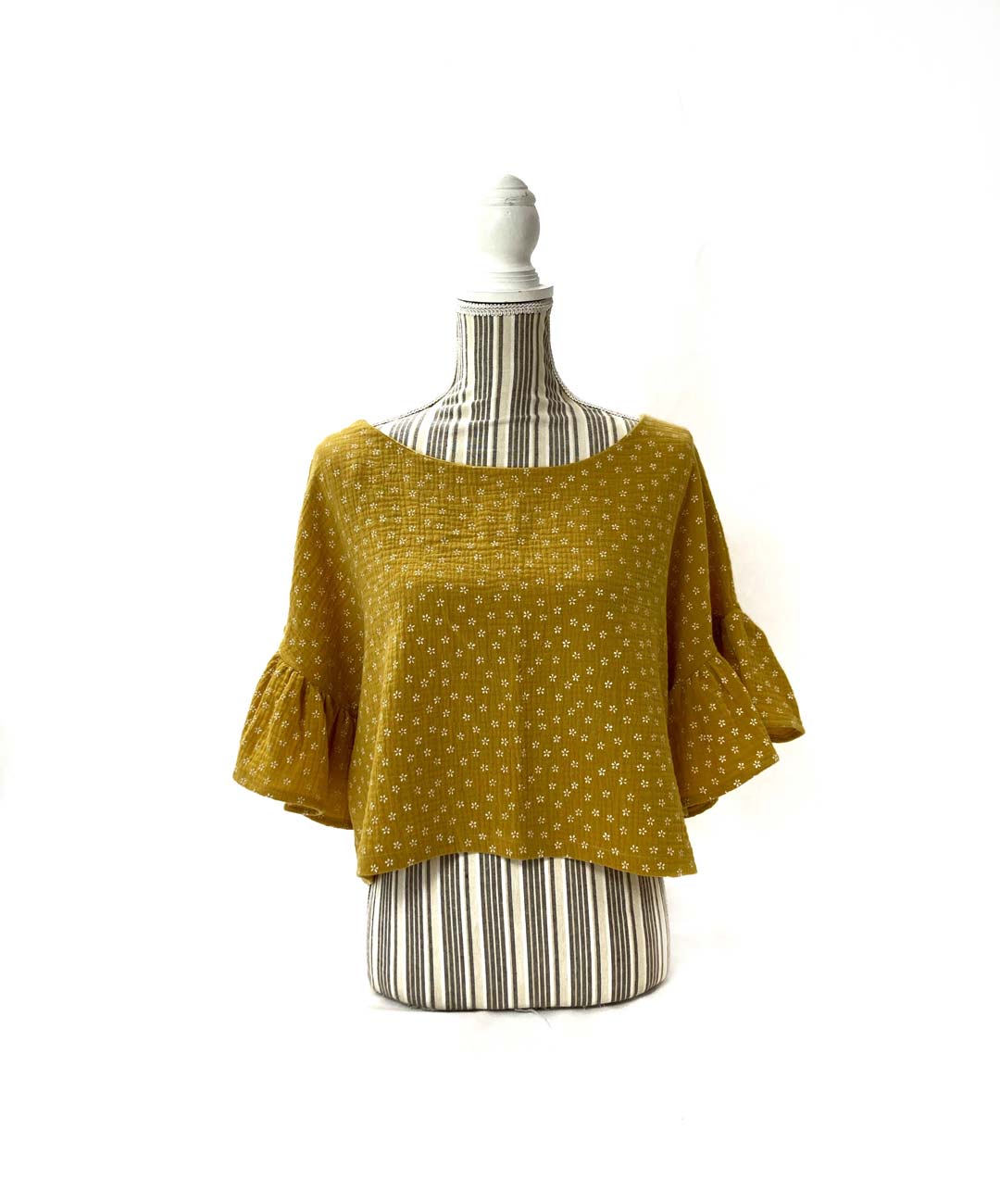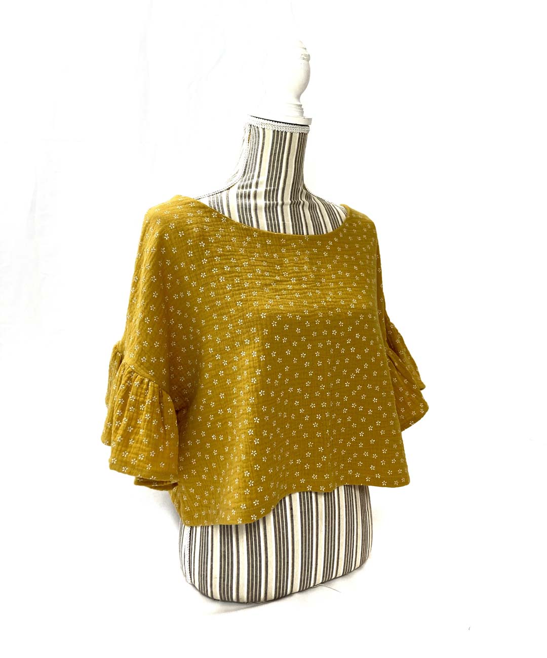 Casacca donna in tela indiana modello kimono corto e largo con grande balza nella manica.