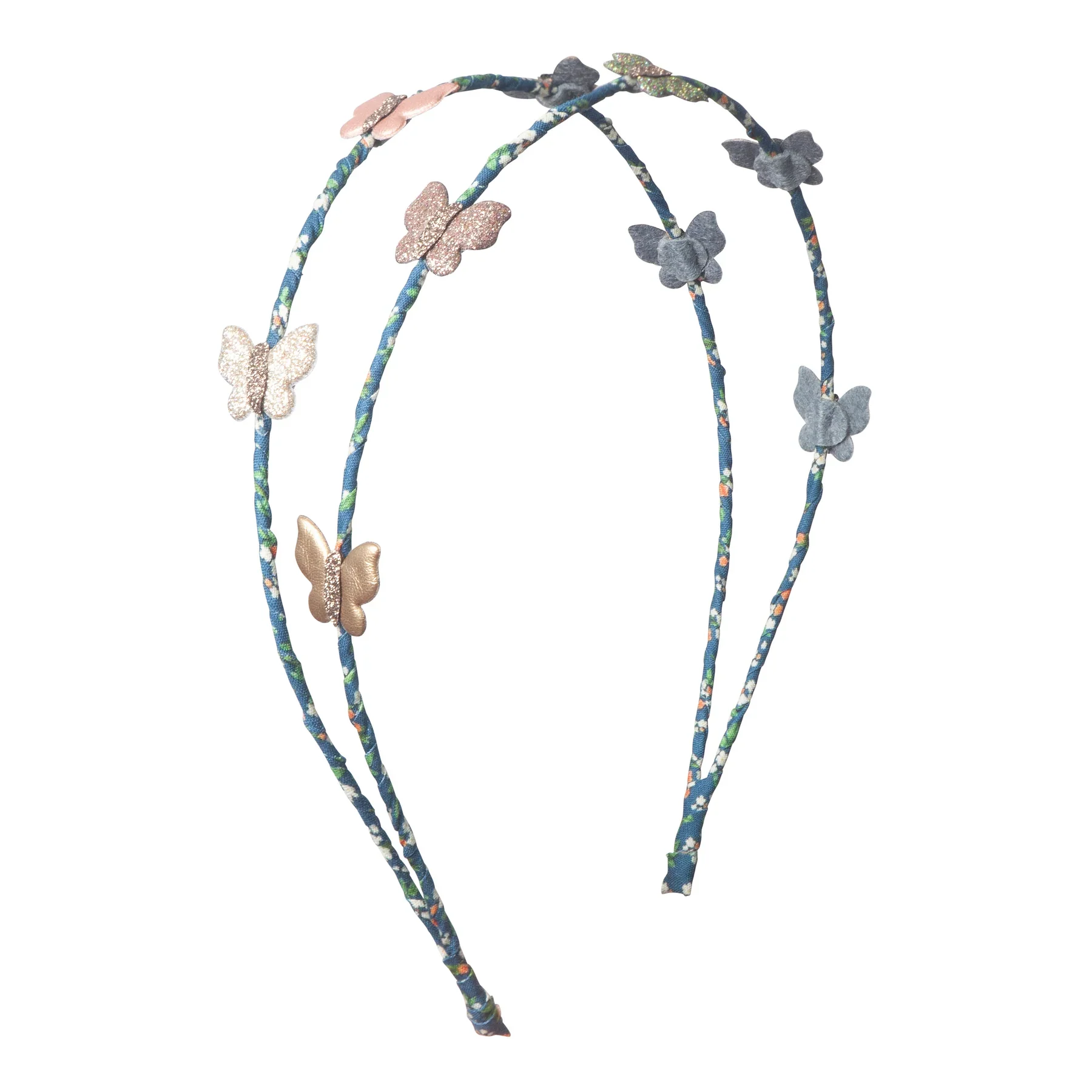 - Due file adornate da nove morbide farfalle imbottite realizzate in tessuti similpelle glitterati e metallizzati