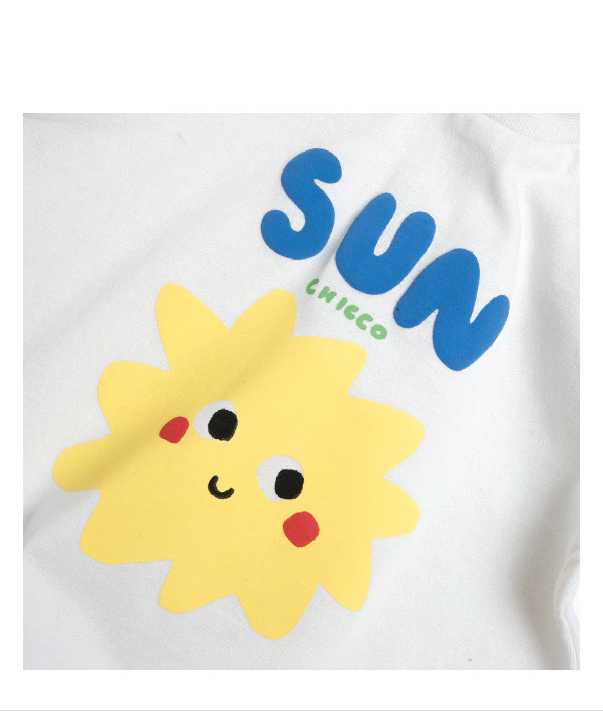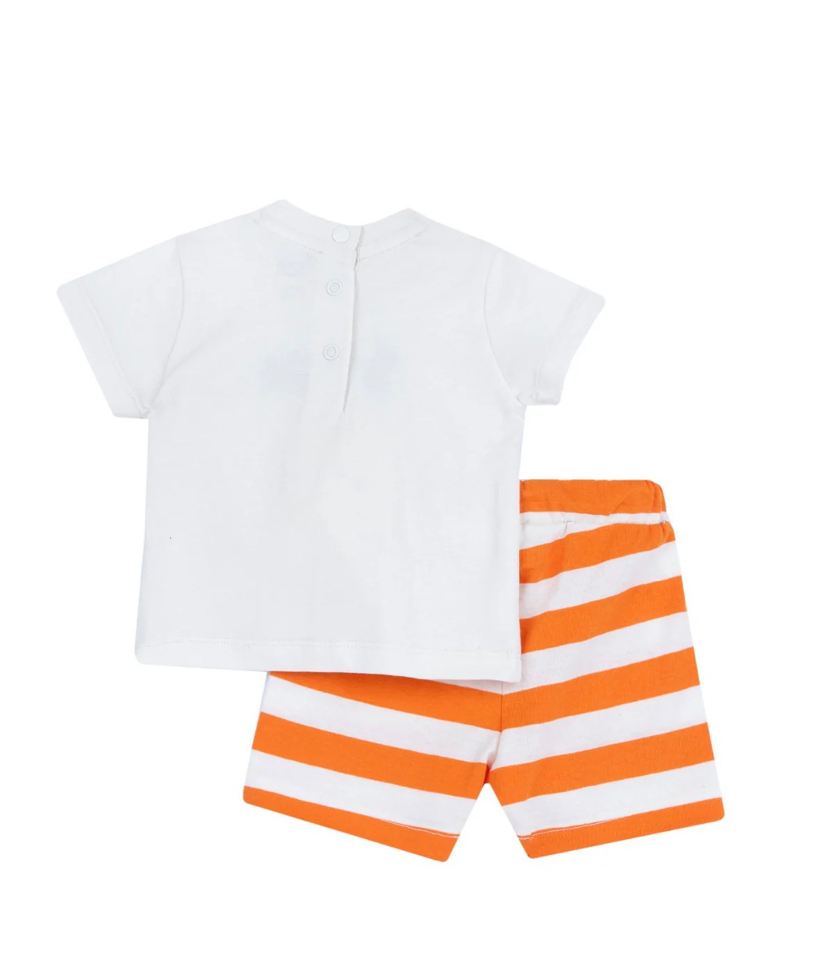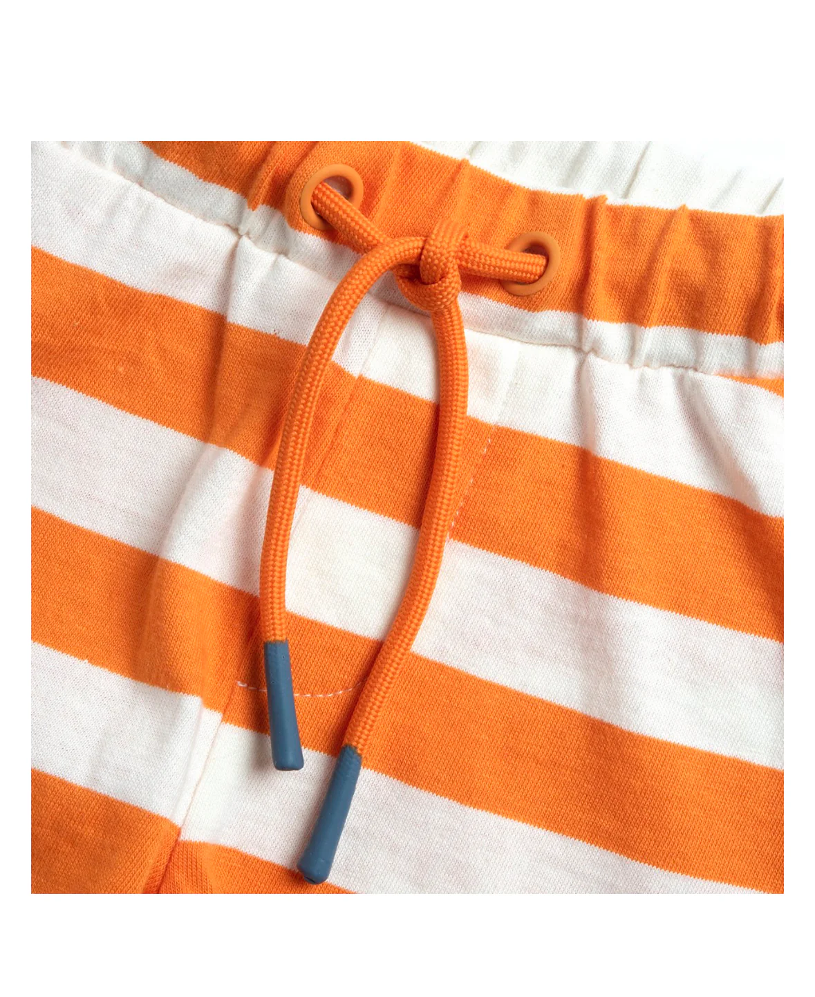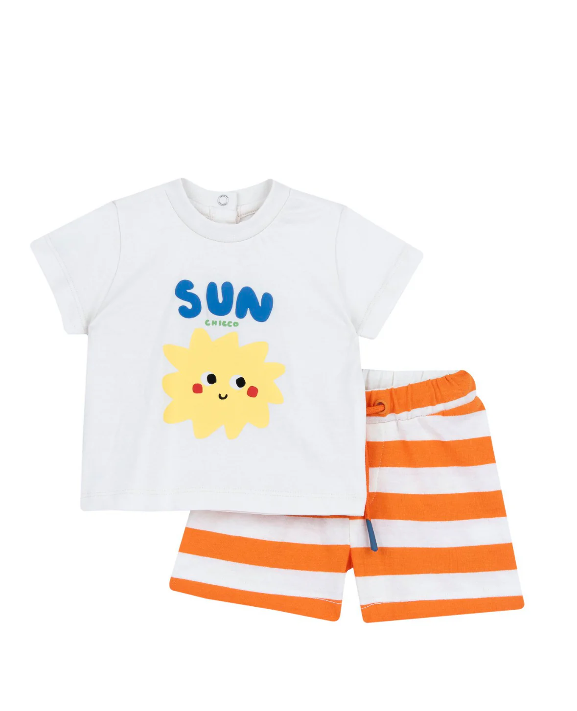 Completo mare in jersey di cotone, cotone sostenibile Maglietta stampa sole frontale con parti a rilievo Maglietta aperta dietro con bottoni automatici Pantaloni a rigoni arancioni Pantaloni vita elasticata e coulisse arancio e blu regolabile Prodotto con Certificazione Oeko-Tex: la qualità per il tuo bambino