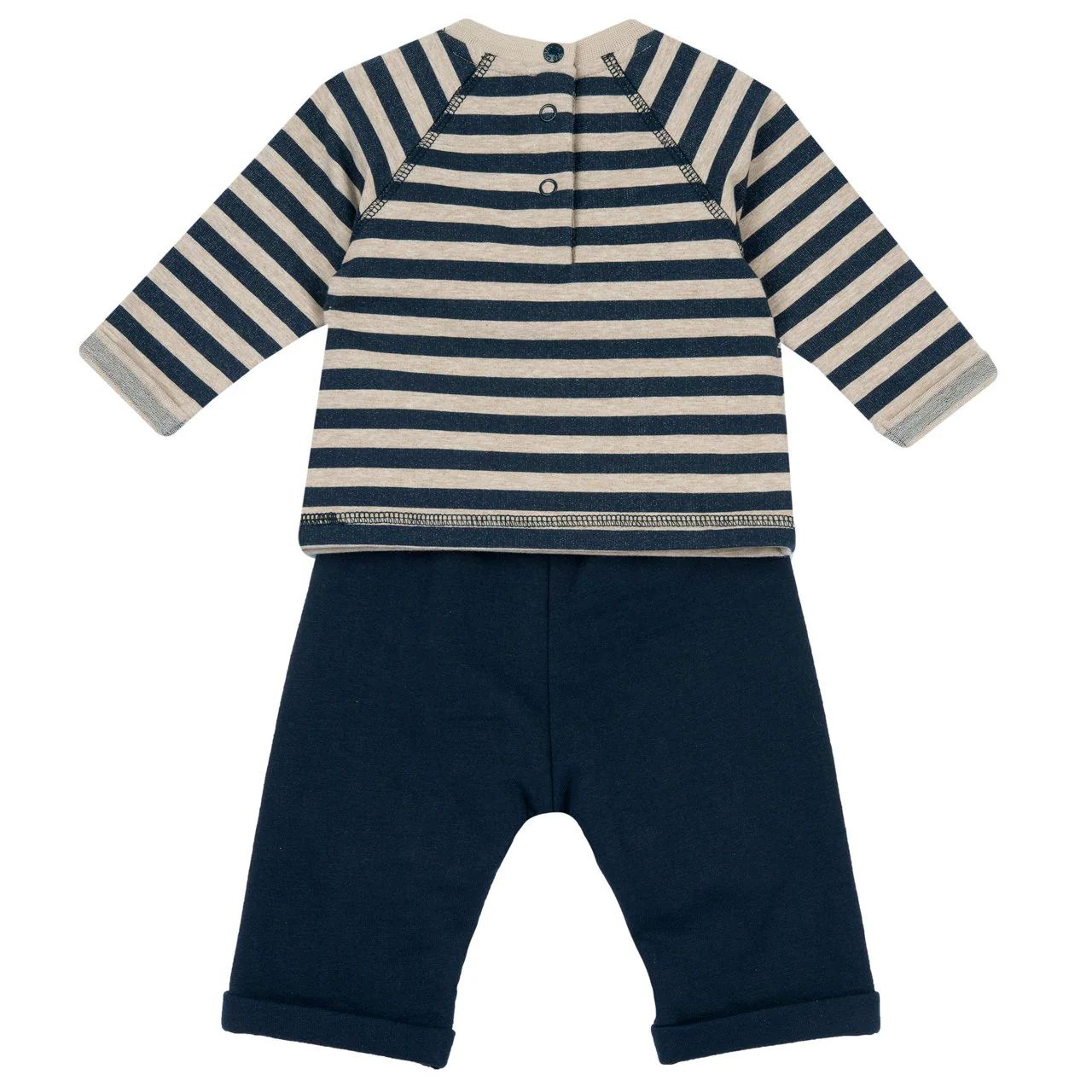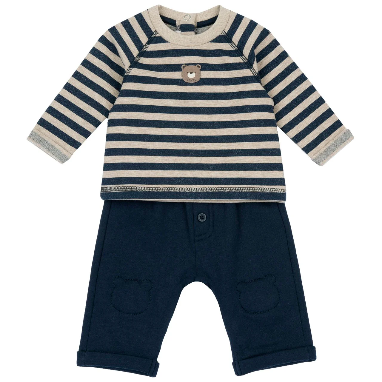 Completo girocollo in felpa non garzata elasticizzata tinto filo rigato con pantaloni in felpa mano morbida Felpa con manica raglan etichetta orso in tessuto spalmato effetto morbido Cotone sostenibile Collo in costina elasticizzata tinta unita beige, polsi con risvolto Felpa aperta dietro con bottoni automatici fino alla tg. 086/18 mesi