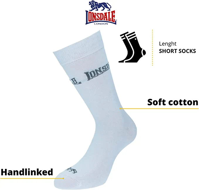 Calza corta unisex Lonsdale in cotone elasticizzato extra soft. Calzini corti in cotone, altezza metà polpaccio, adatti per l’abbigliamento casual di tutti i giorni. Calze in cotone, assorbimento dell’umidità, buona traspirabilità, anti-odore contro il sudore. Il bordo elastico rende i calzini aderenti al piede, senza stringere troppo ed evitando che scivolino all’interno delle scarpe. Vestibilità perfetta e massimo comfort.