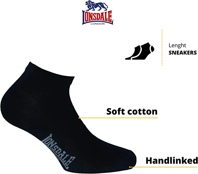 Calzini fantasmini sneakers unisex Lonsdale in cotone elasticizzato extra soft. Composizione 80% cotone 18% poliammide e 2% elastan. Confezione composta da 6 paia dello stesso colore e stessa taglia. art. LNS30