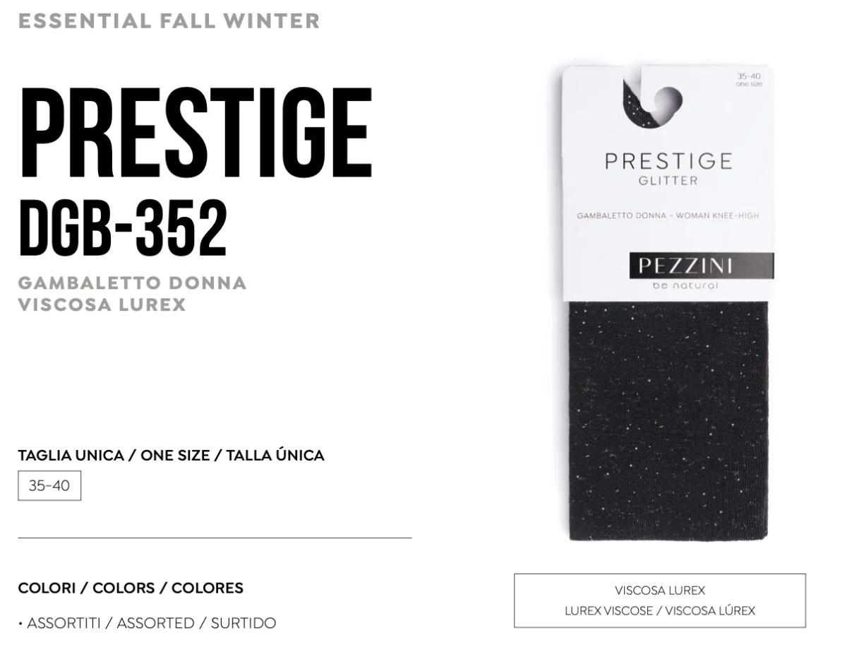 Gambaletto donna in morbida viscosa lurex. Rimaglio a mano. Confezione composta da sei paia assortiti nei colori. Composizione: 72% viscosa, 22% poliammidica, 3% elastan, 2% acrilico e 1%poliestere. Taglia unica dal 35 al 40. art. Dgb-Prestige