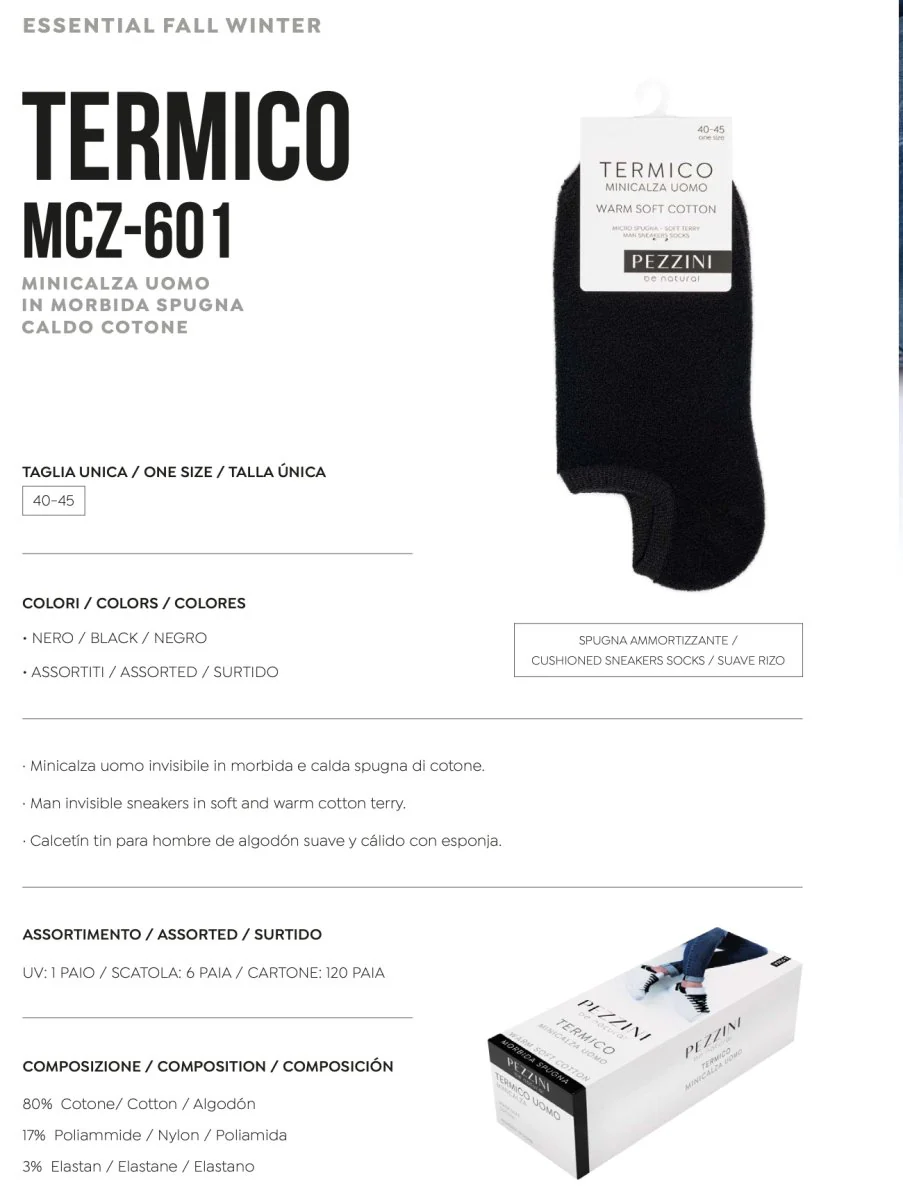 Minicalza uomo donna unisex Pezzini Invisibile in cotone supersoft, morbida e calda spugna Composizione: 80% cotone 17% poliammide 3% elastan Confezione composta da 6 paia. Taglie disponibili 40/45 art. MCZ-601