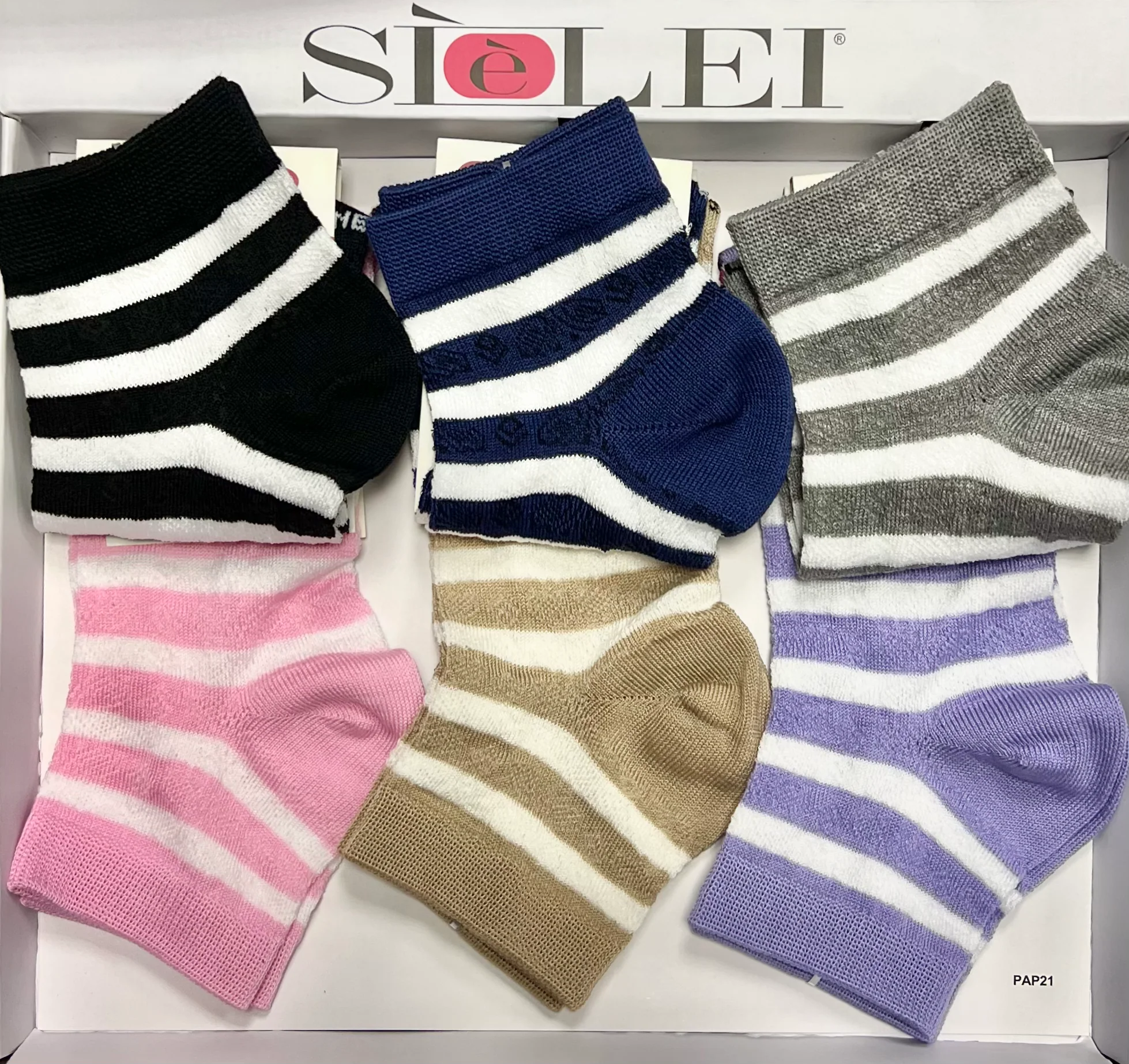 Calza corta donna della linea Sièlei in puro cotone in tinta unita con fantasia e righe a tinta con elastico. Confezione composta da sei paia. Taglia unica donna dal 35 al 40 Composizione 67% cotone – 31% poliestere – 2% elastan art. NS02 Righe