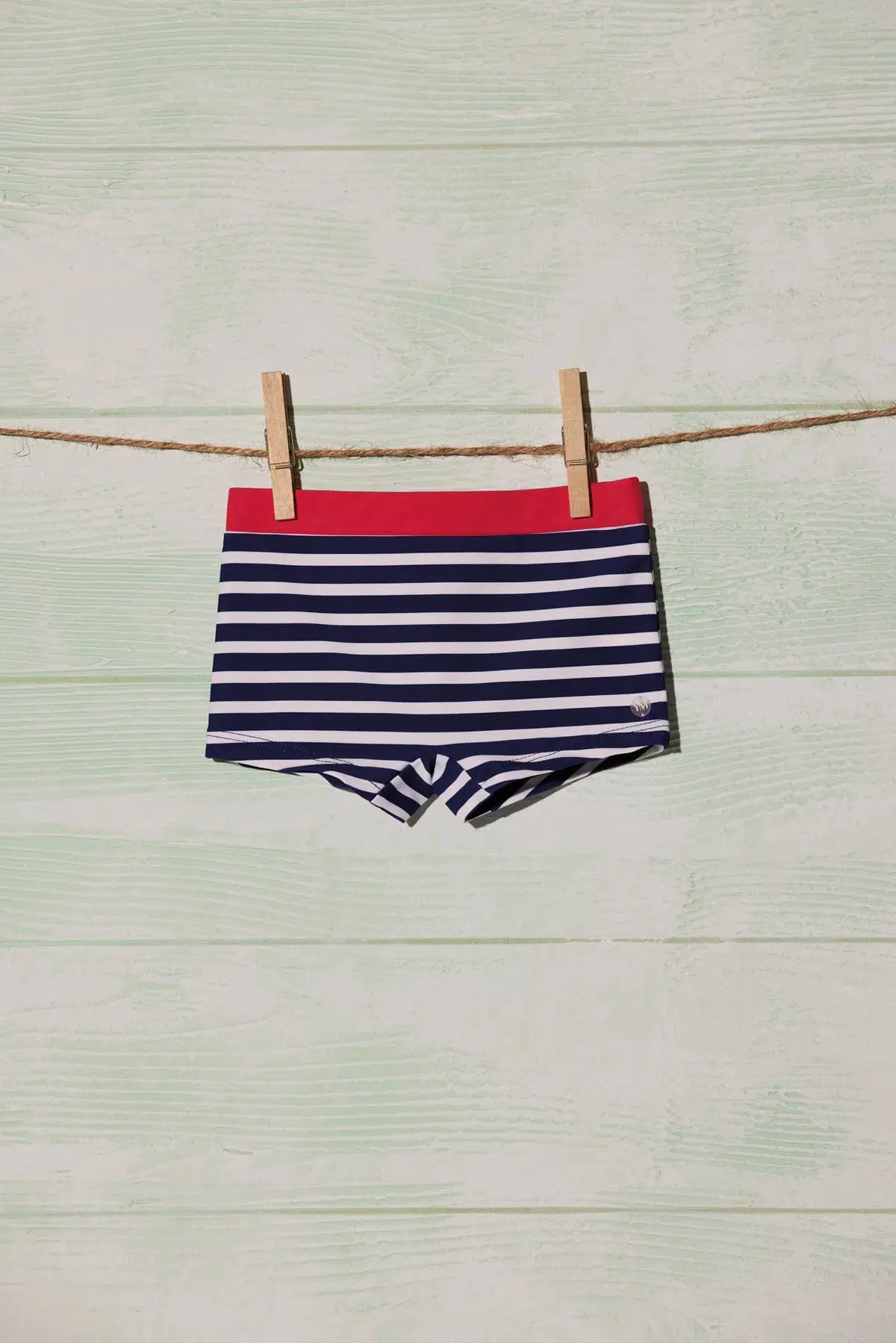 Collezione Baby Sailor. Boxer da bagno per bambino. Stampa marinaio con strisce blu e bianche.