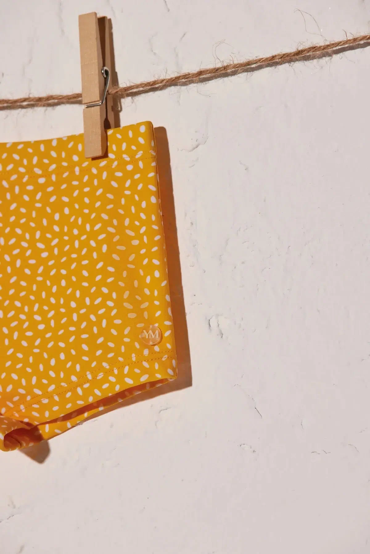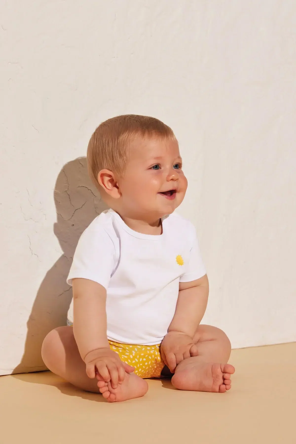 Collezione Baby Sailor. Boxer da bagno per bambino. Stampa gialla con dettagli bianchi.