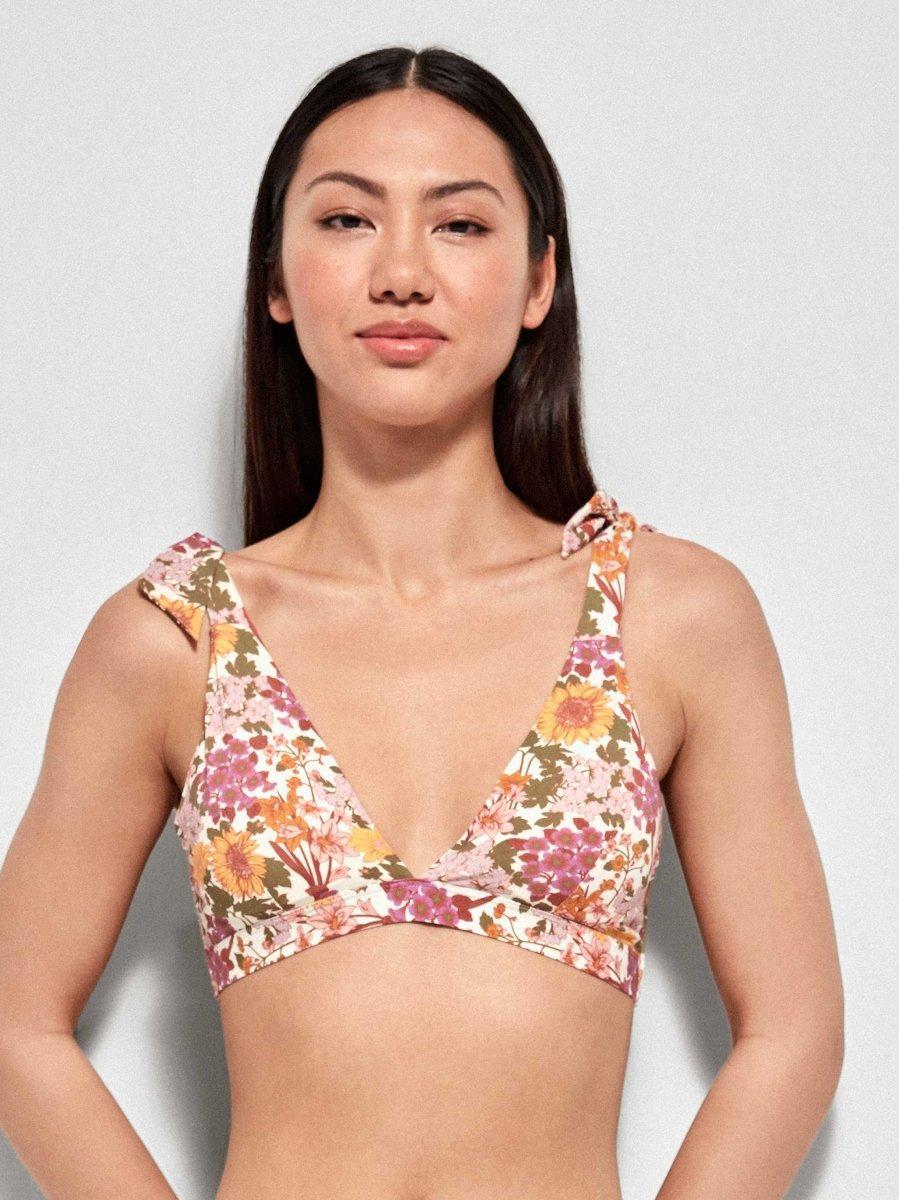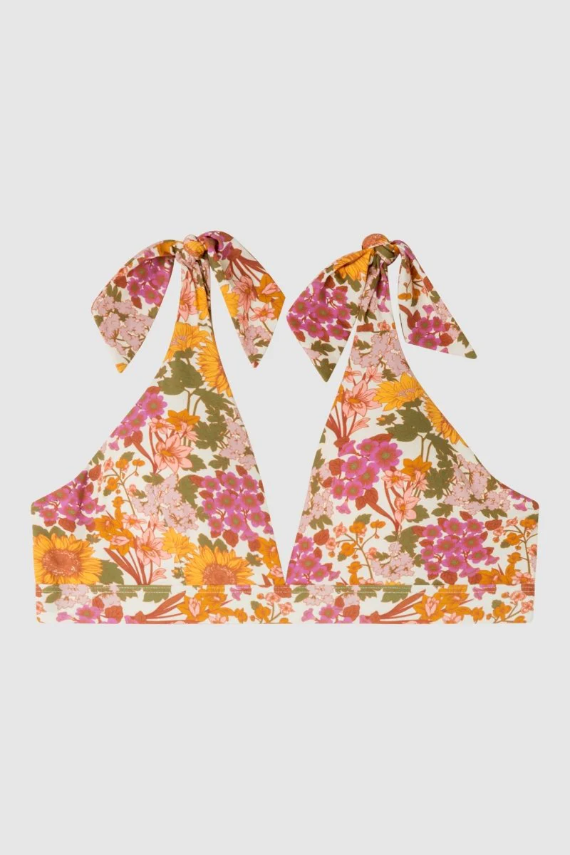 Top bikini reggiseno senza ferretto a triangolo con scollatura centrale e imbottitura estraibile in tessuto fantasia, spalline larghe regolabili, slip vita bassa tanga nella stessa fantasia con ottima vestibilità