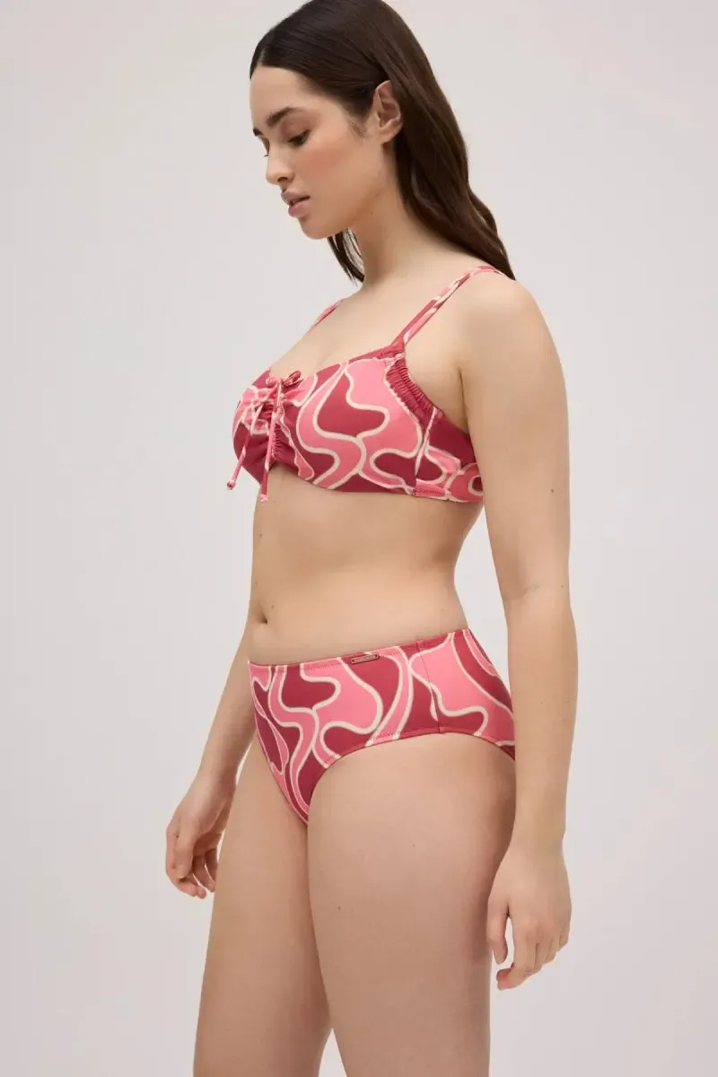 Set bikini a due pezzi. Reggiseno con ferretto e senza imbottitura in coppa C e scollatura annodata, con slip midi. Costume contenitivo e riduttore che modella e snellisce la figura. Chiusura a moschettone sulla schiena.