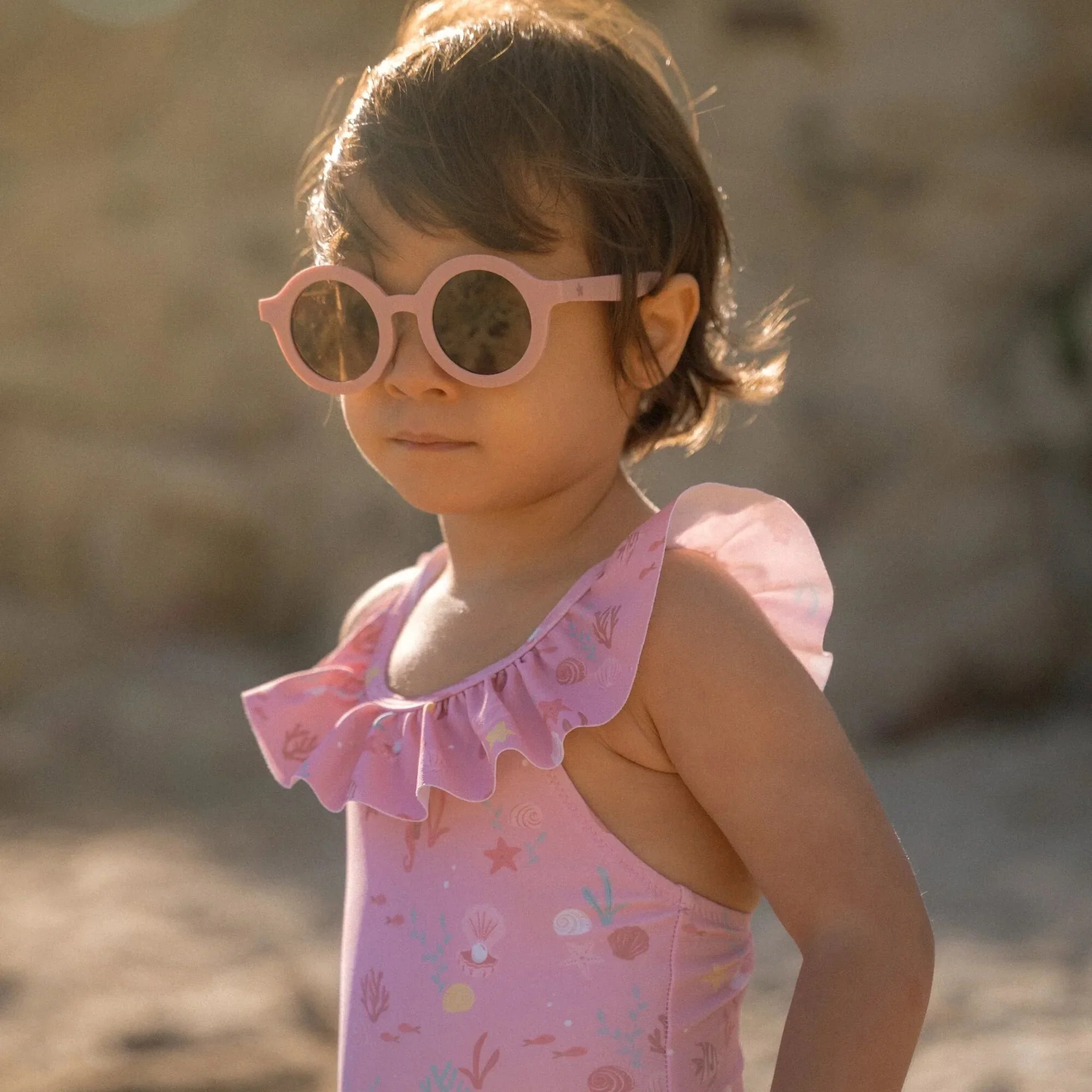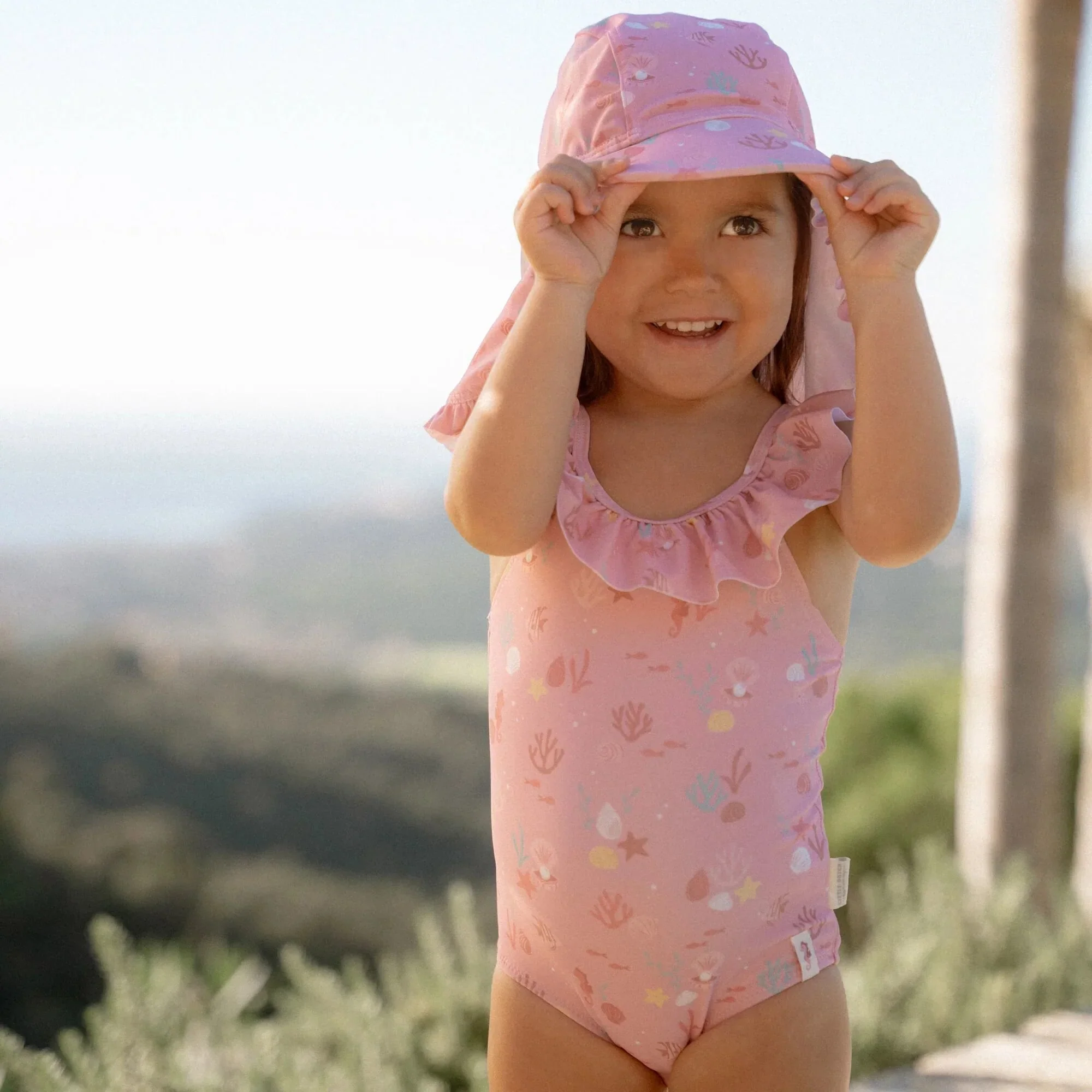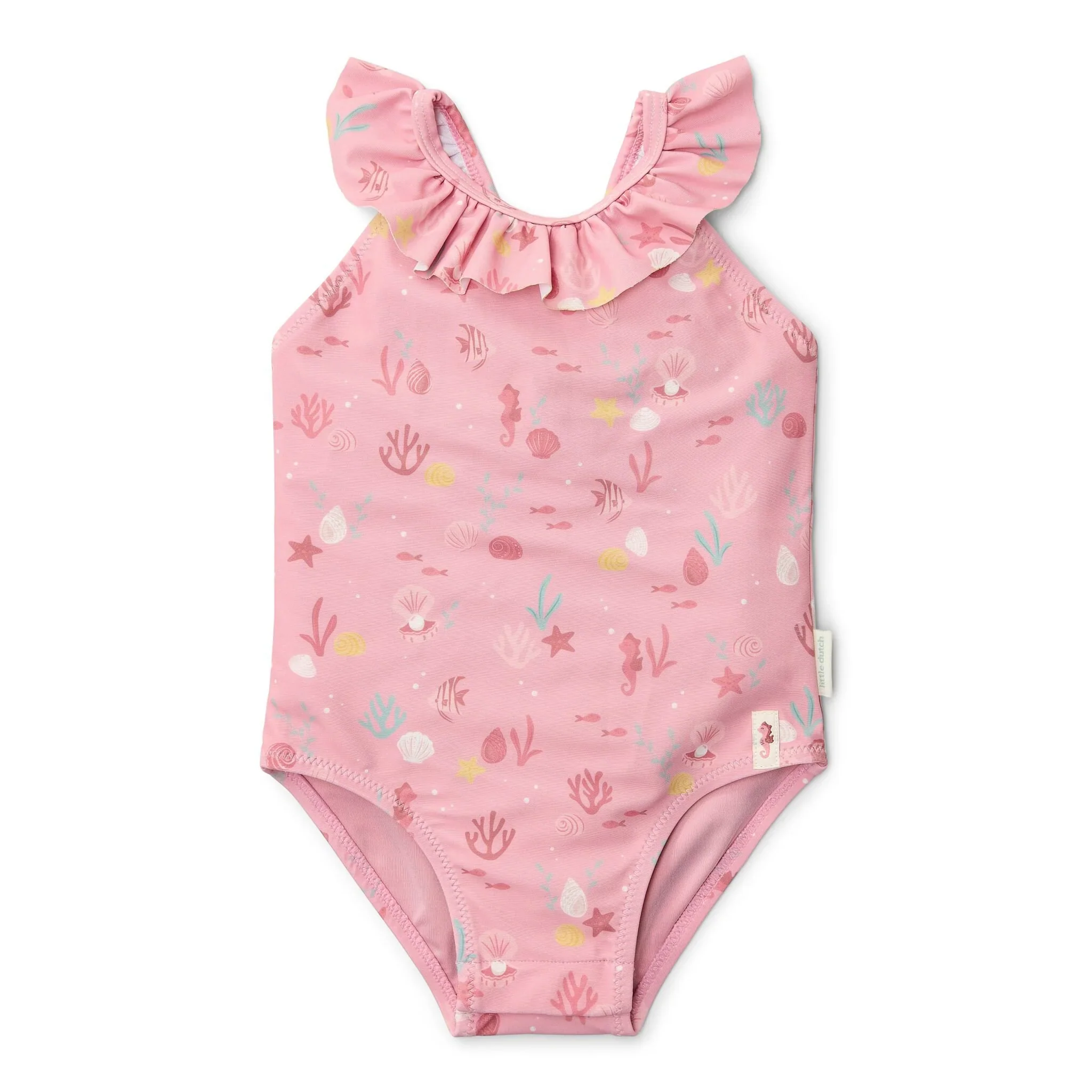 Il costume da bagno intero da bambina Ocenan Treasures ha un dolce colore rosa chiaro decorato con cavallucci marini, corallo e conchiglie, creando un bellissimo tema subacqueo.