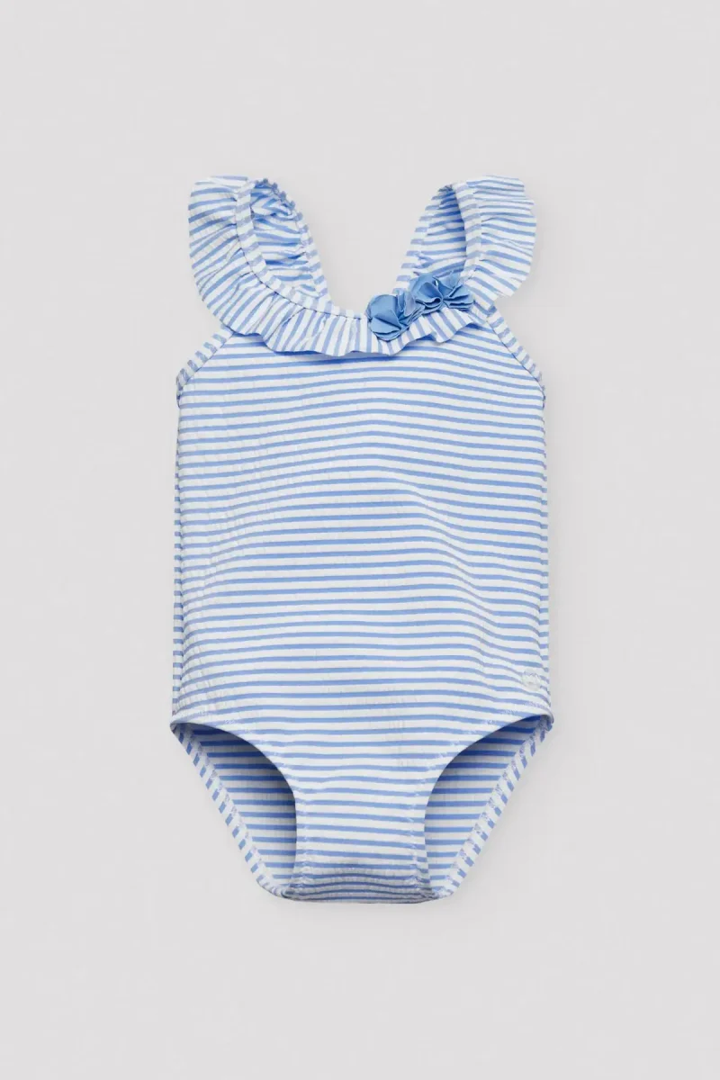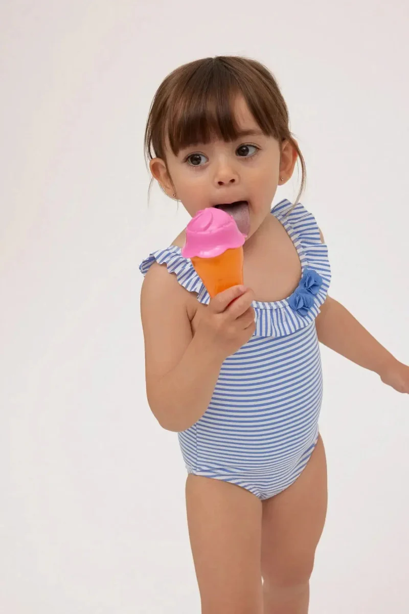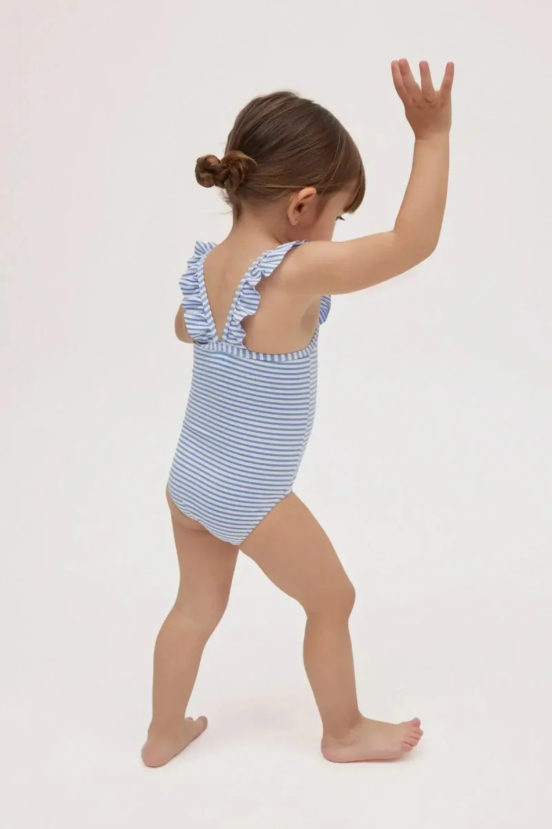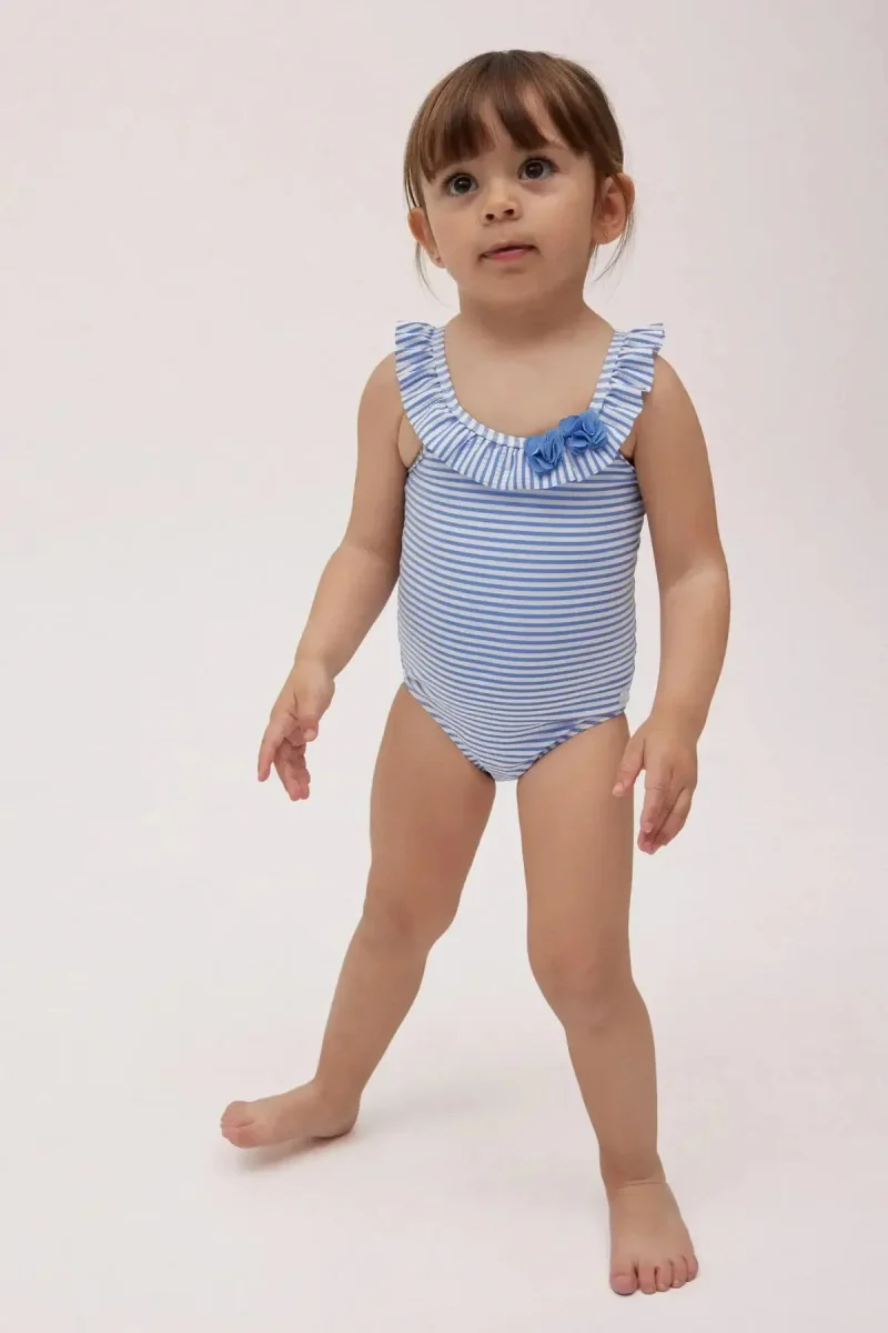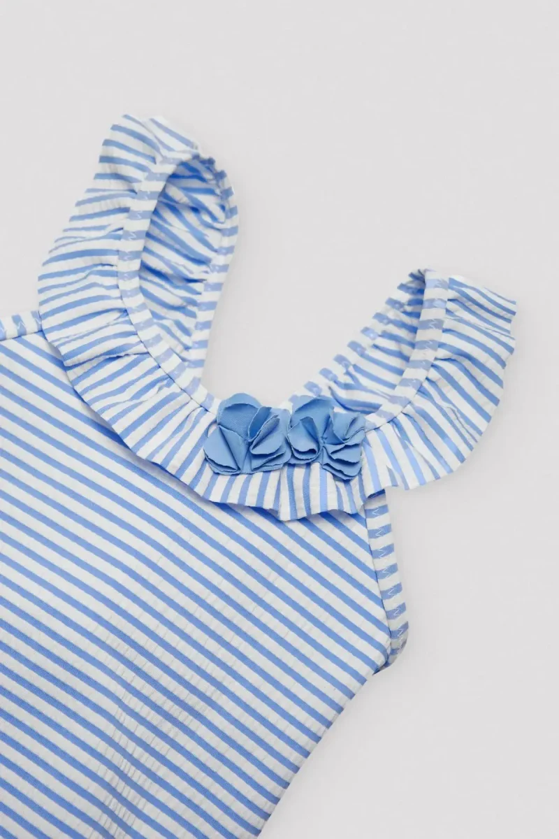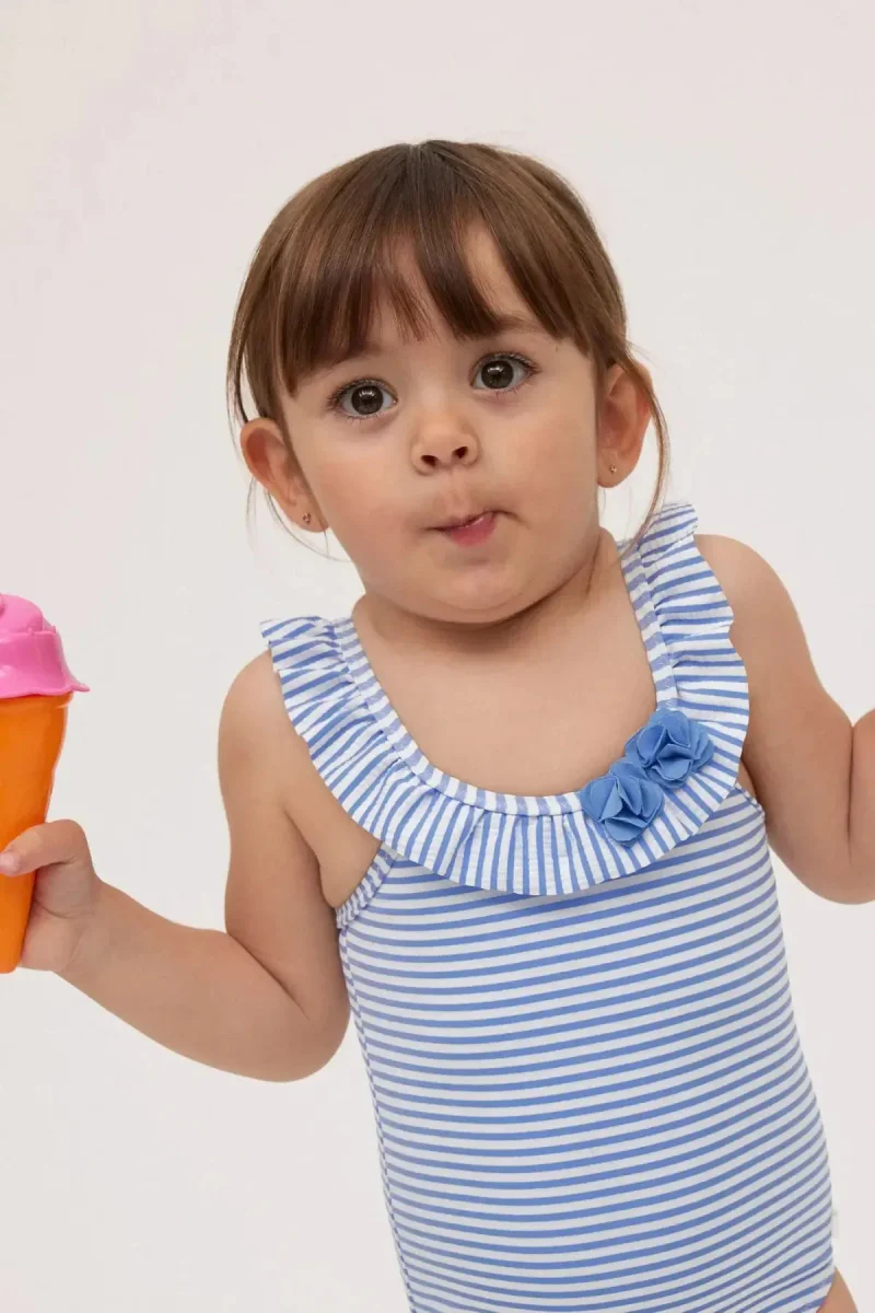 Costume da bagno per bambini. Questo modello ha una stampa a righe e spalline arricciate.