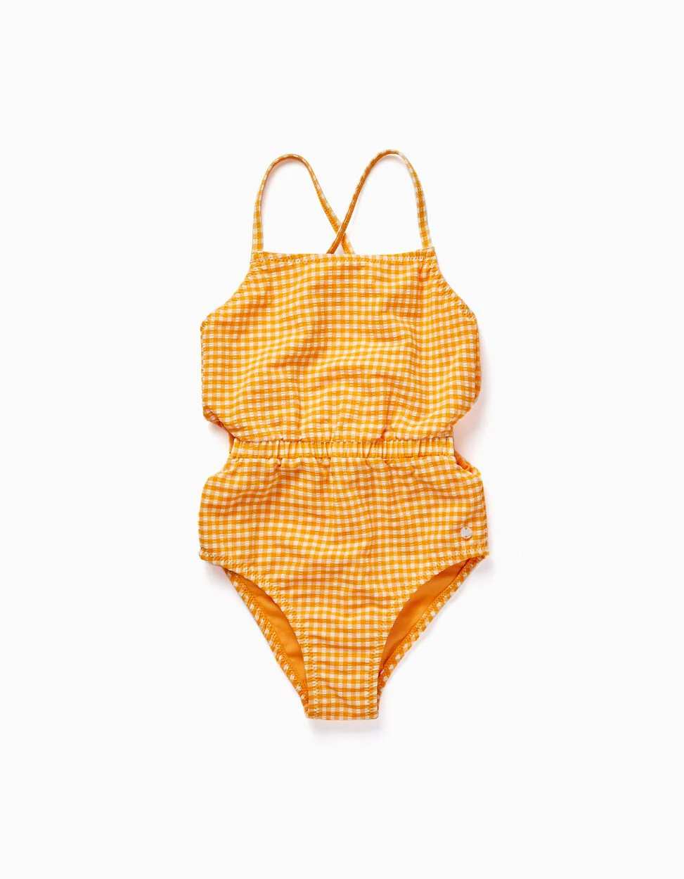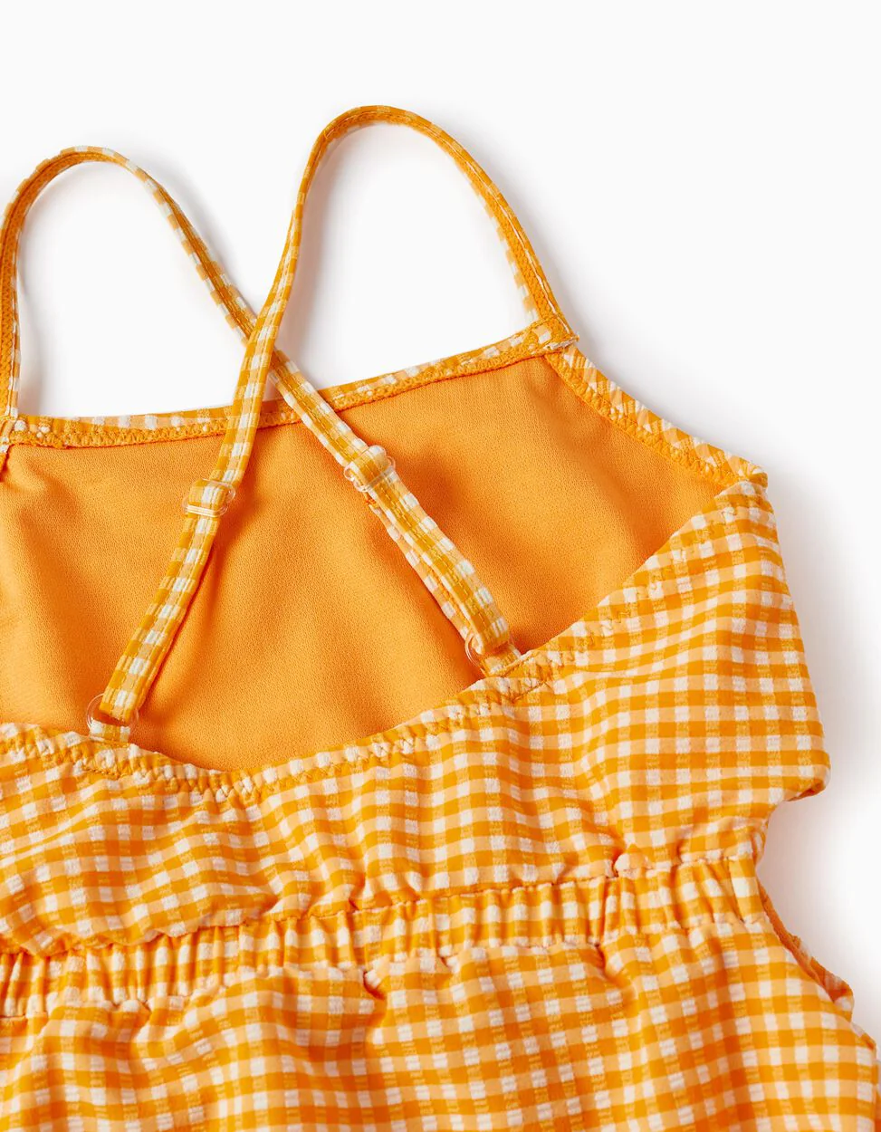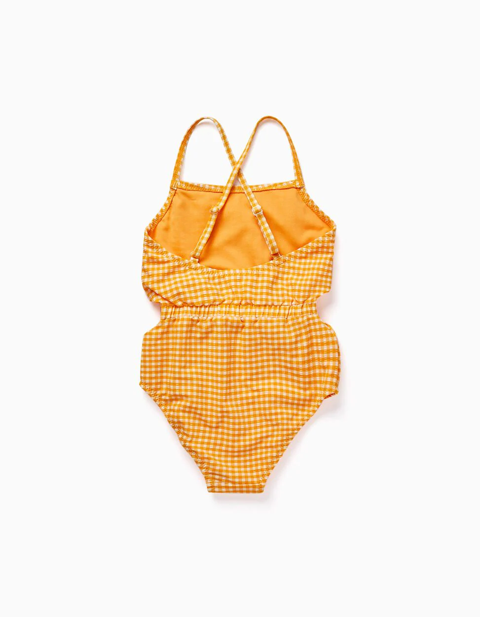 Costume da bagno con motivo Vichy giallo e bianco per bambina. Vita elastica con tagli laterali. Spalline regolabili che si incrociano sul retro. Con fodera per un maggiore comfort. Ideale per le vacanze estive!