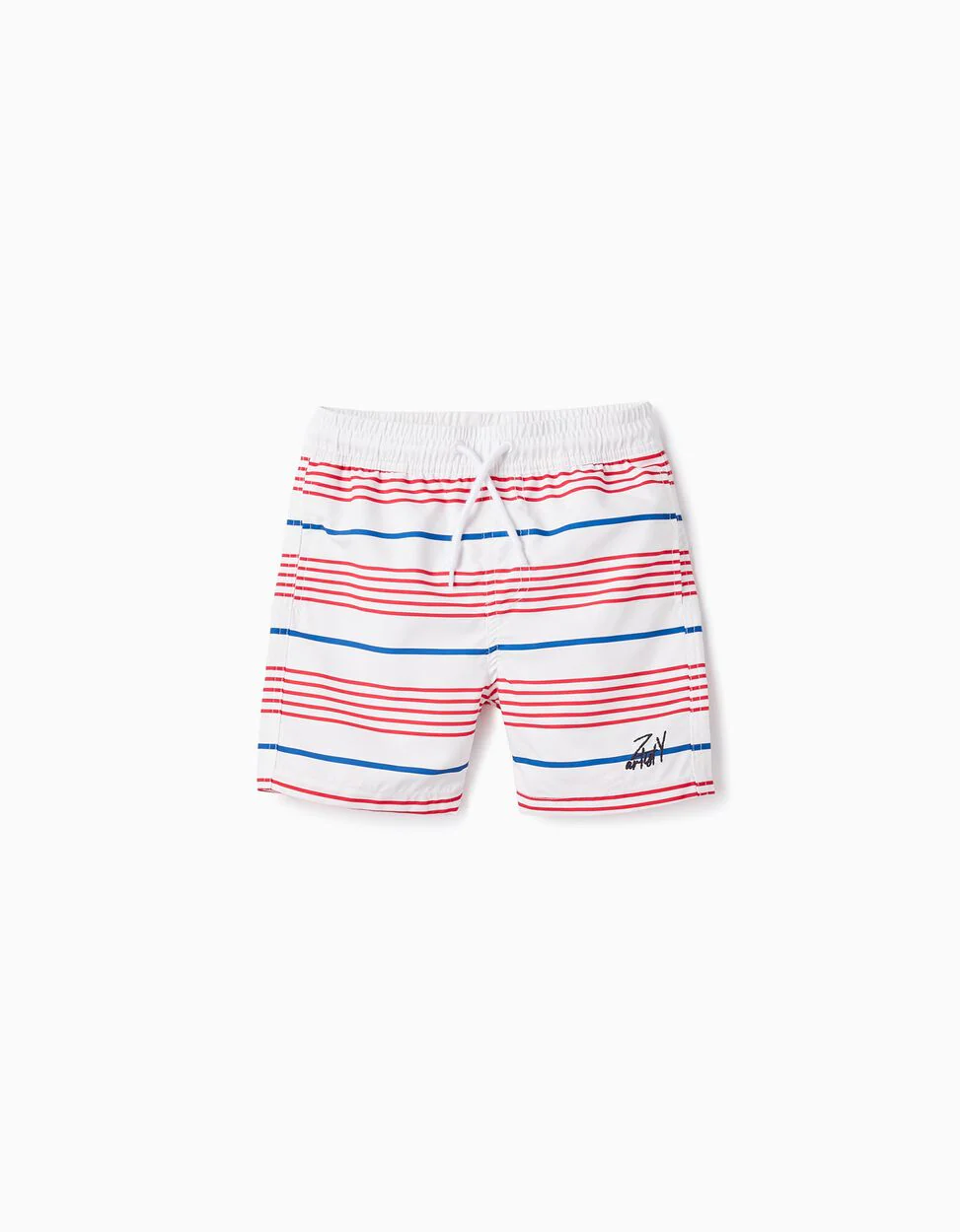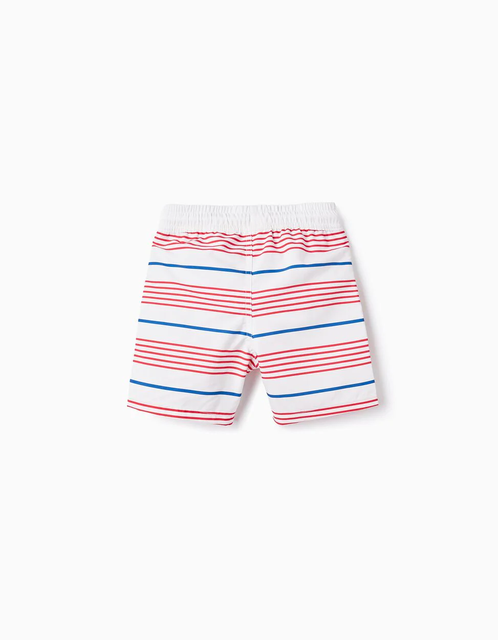 Shorts da bagno per ragazzi, con fantasia a righe rosse e blu. Vita elastica con coulisse per la regolazione. Fodera in rete per un maggiore comfort del bambino. Tasche laterali. Per un’estate di bagni e caldo. We Care: questo articolo è realizzato con materiali riciclati.