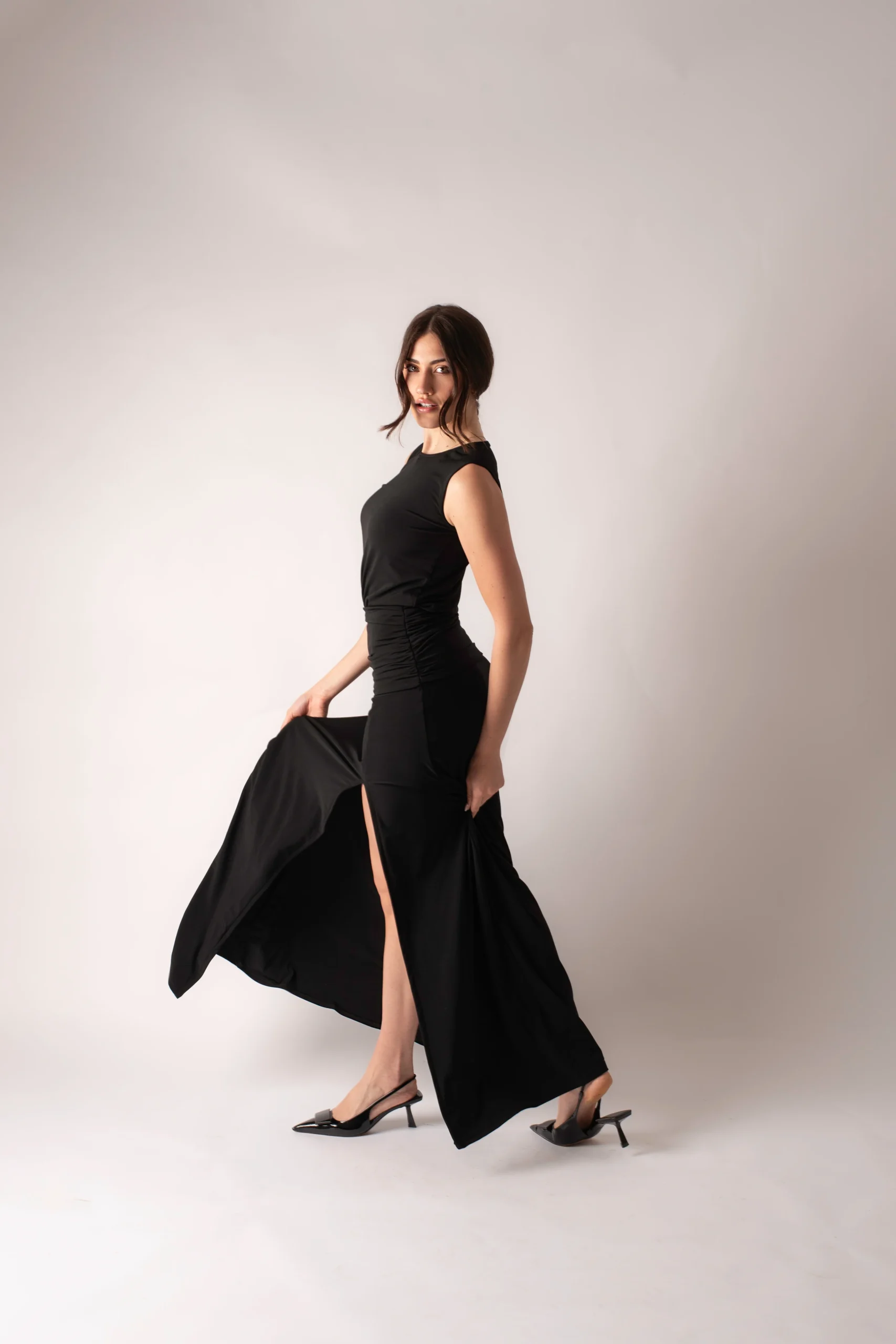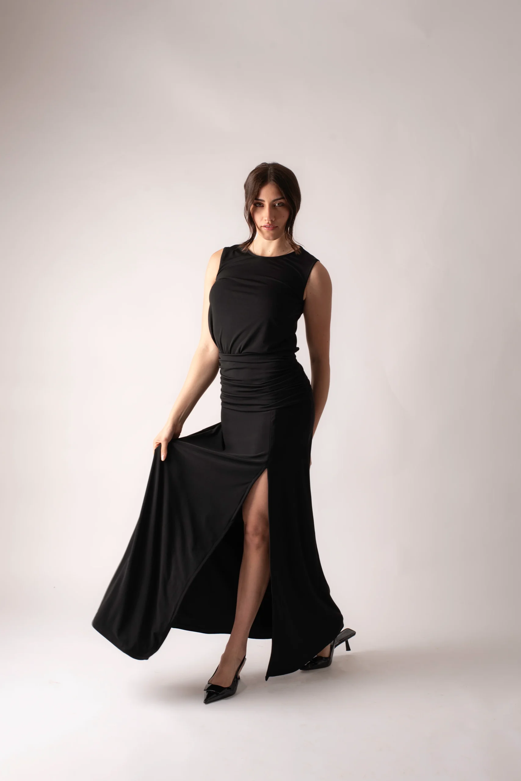 Abito lungo accollato con drappeggio frontale dalla vita ai fianchi e spacco laterale