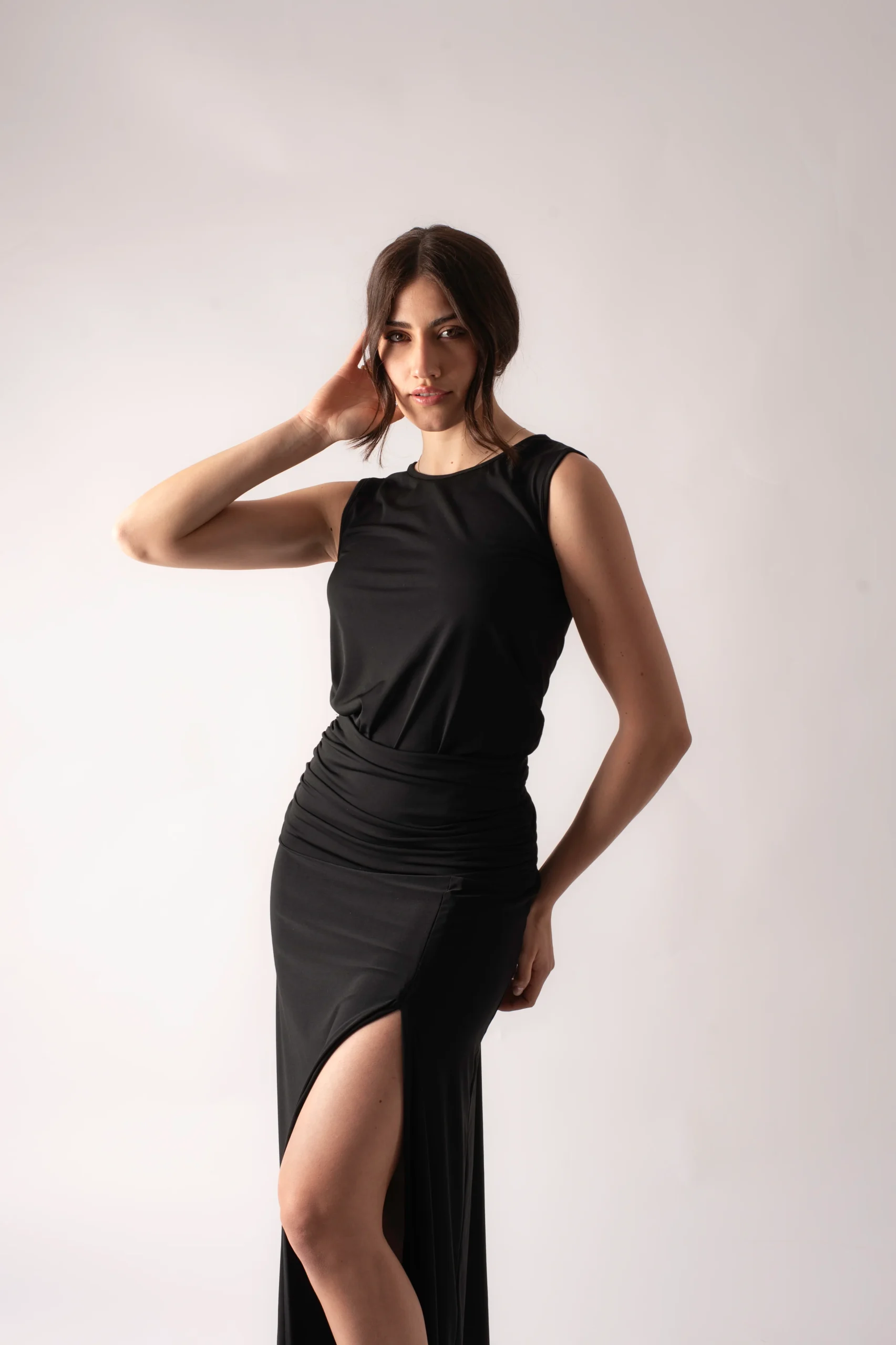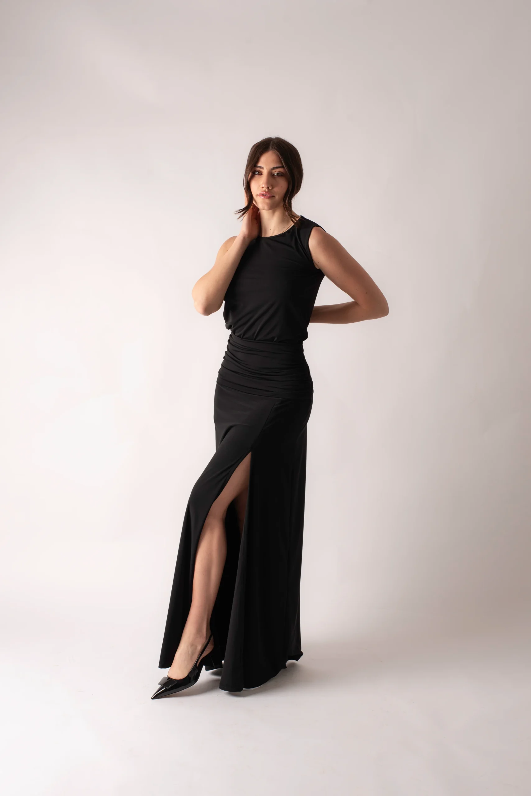 Abito lungo accollato con drappeggio frontale dalla vita ai fianchi e spacco laterale La modella indossa una taglia S Altezza della modella 1,65m