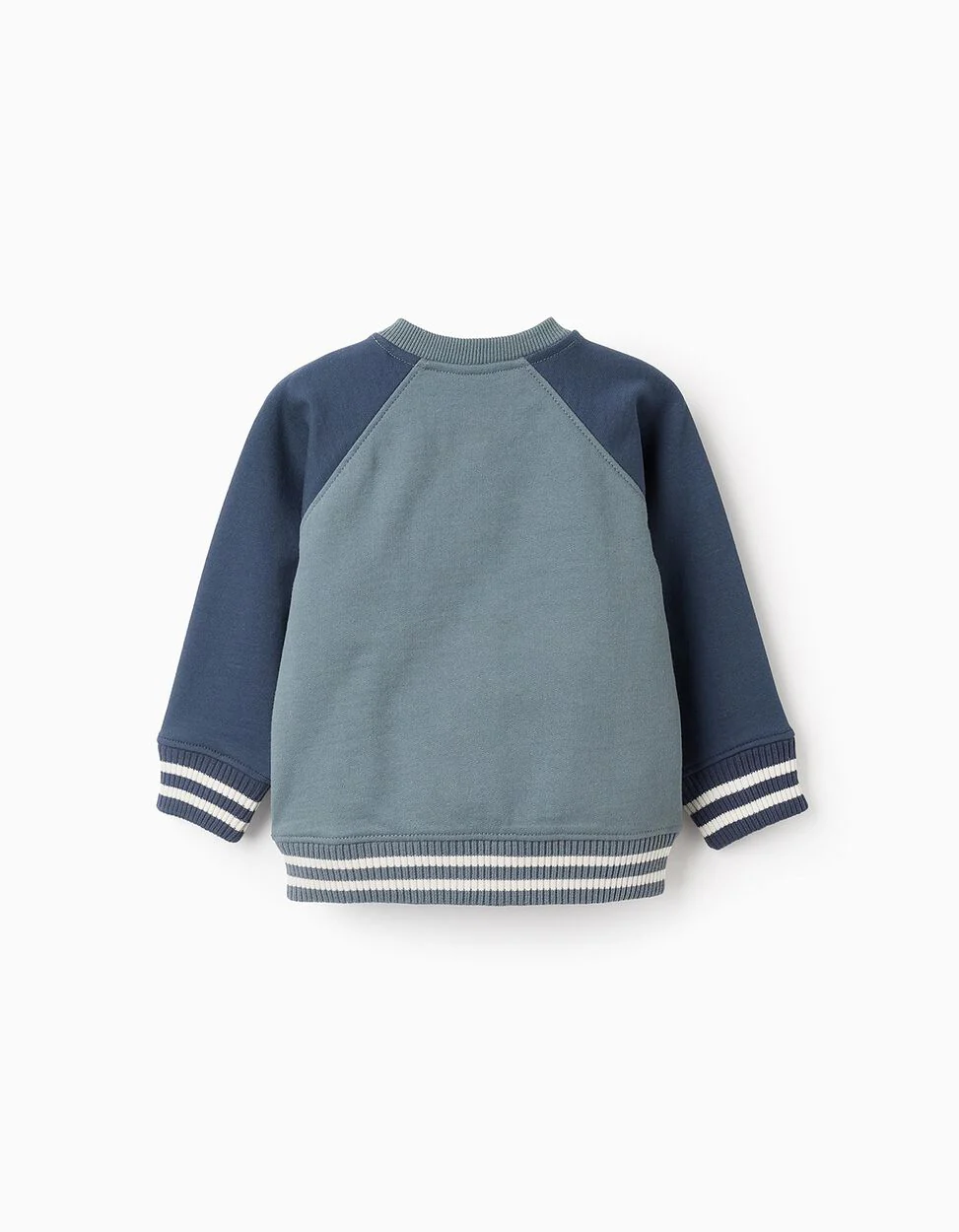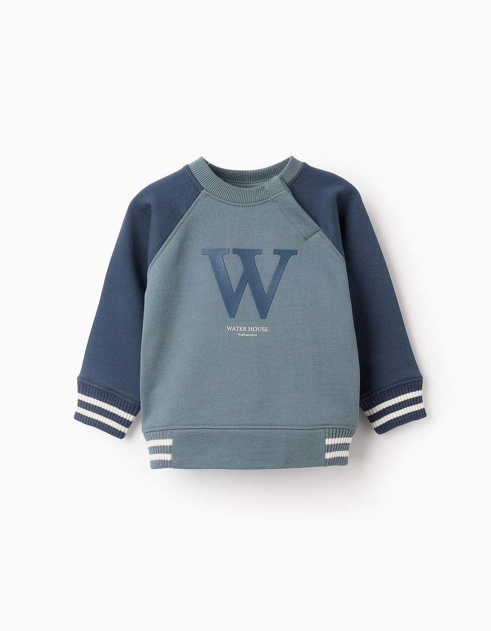 Felpa blu per neonato, 100% cotone, con maniche raglan. Stampa frontale con la lettera W in rilievo. Bottoni automatici sui lati per una facile vestizione. Polsini a costine per una vestibilità perfetta, con strisce bianche a contrasto. Pratica, comoda, perfetta per tutti gli stili.