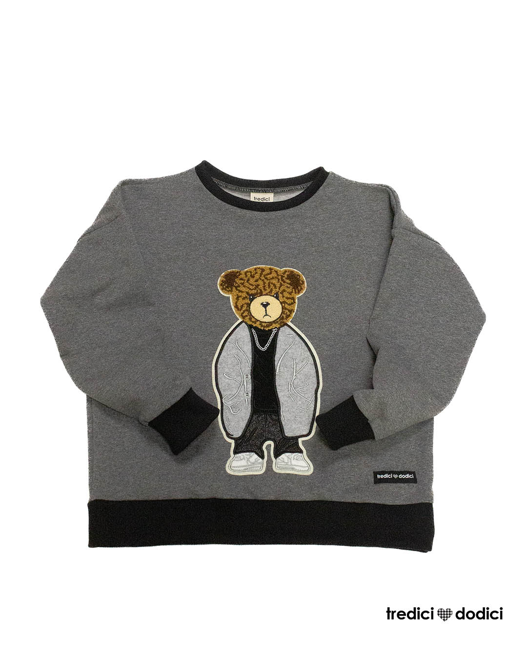 Felpa invernale unisex modello scatoletta con orsetto applicato. Bordi di costina abbinati.
