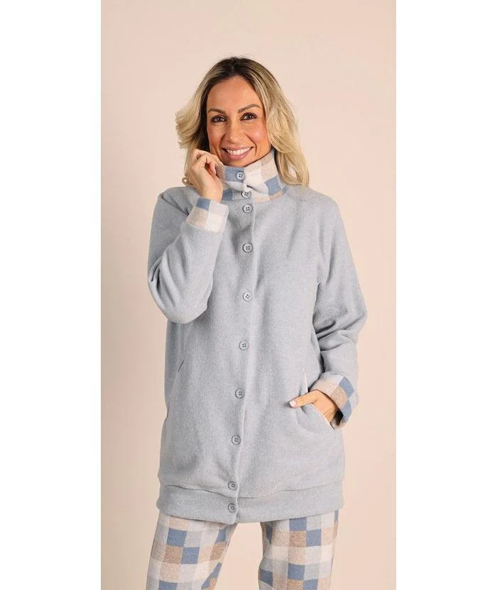Vestaglia/Giacca donna flanellata in Punto Milano tinta unita con collo alto e polsini a fantasia, abbottonatura centrale e tasche. Composizione: 50% cotone – 50% poliestre art. 5123