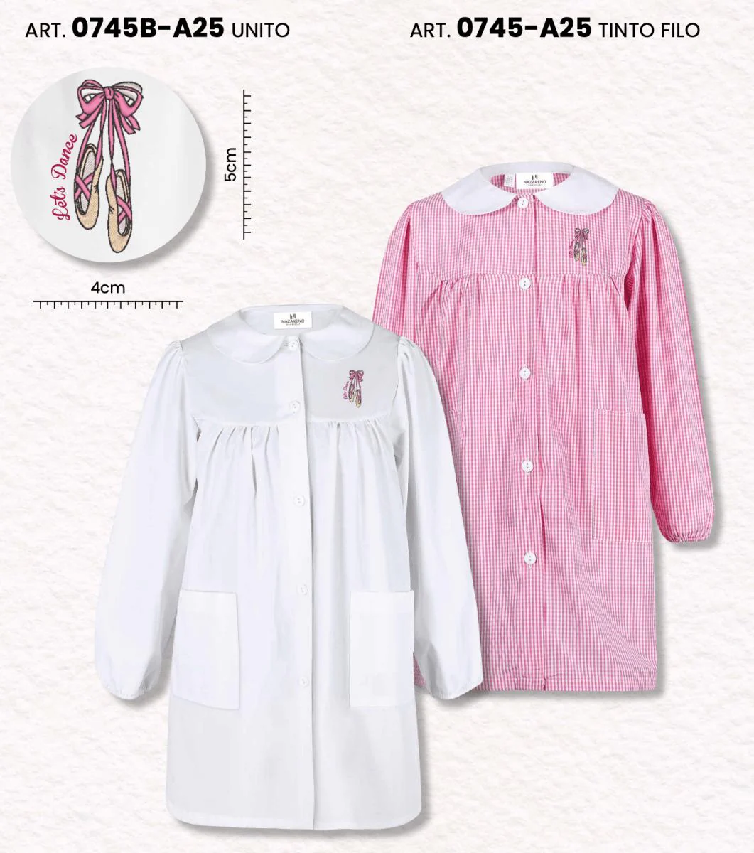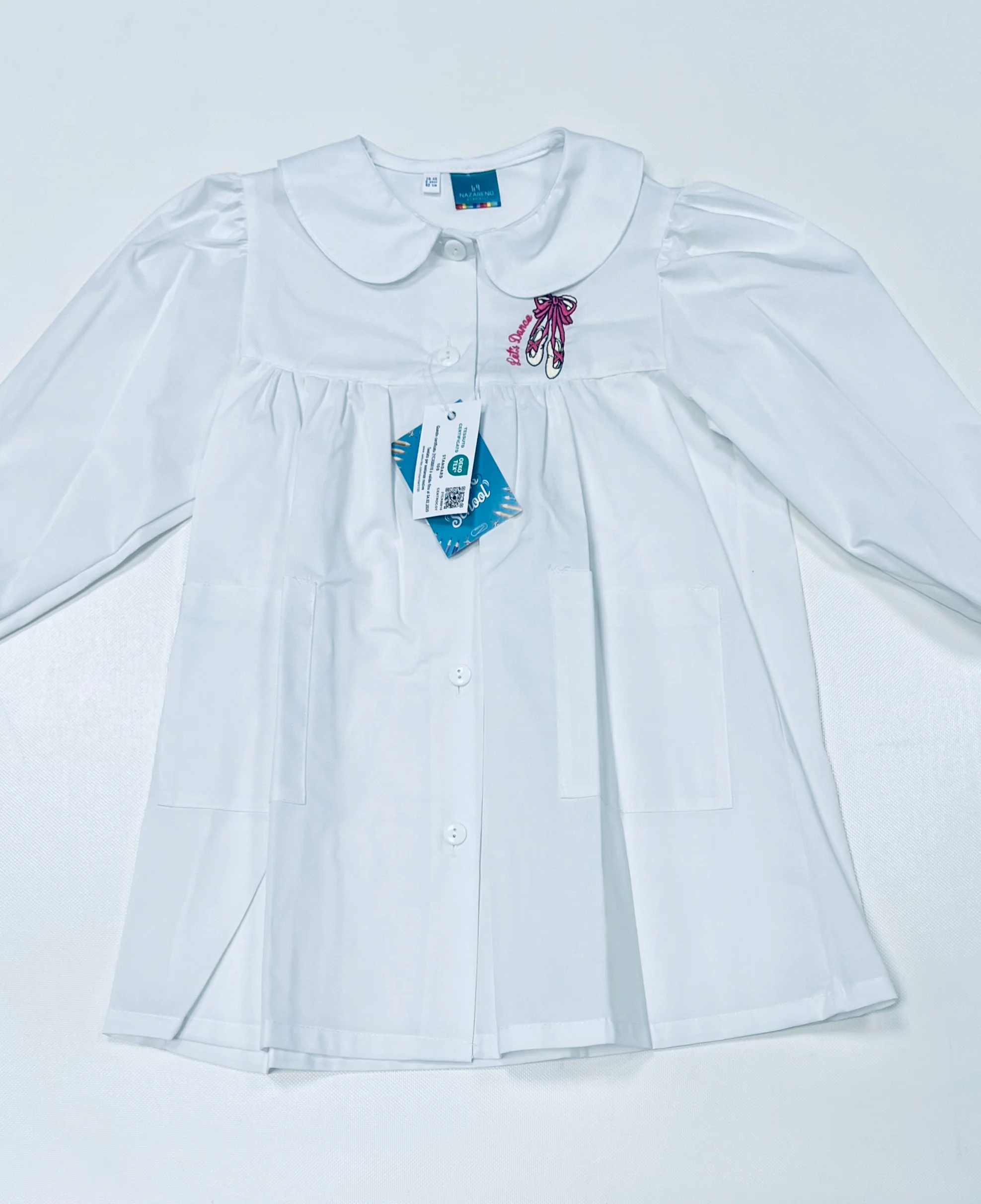 Grembiule Scuola Made in Italy – Asilo Bambina Siggi ricamo Dance 65% Poliestere, 35% Cotone Apetura centrale con bottoni, Colletto Bianco con Ricamo Tinta unita bianco art. 0745