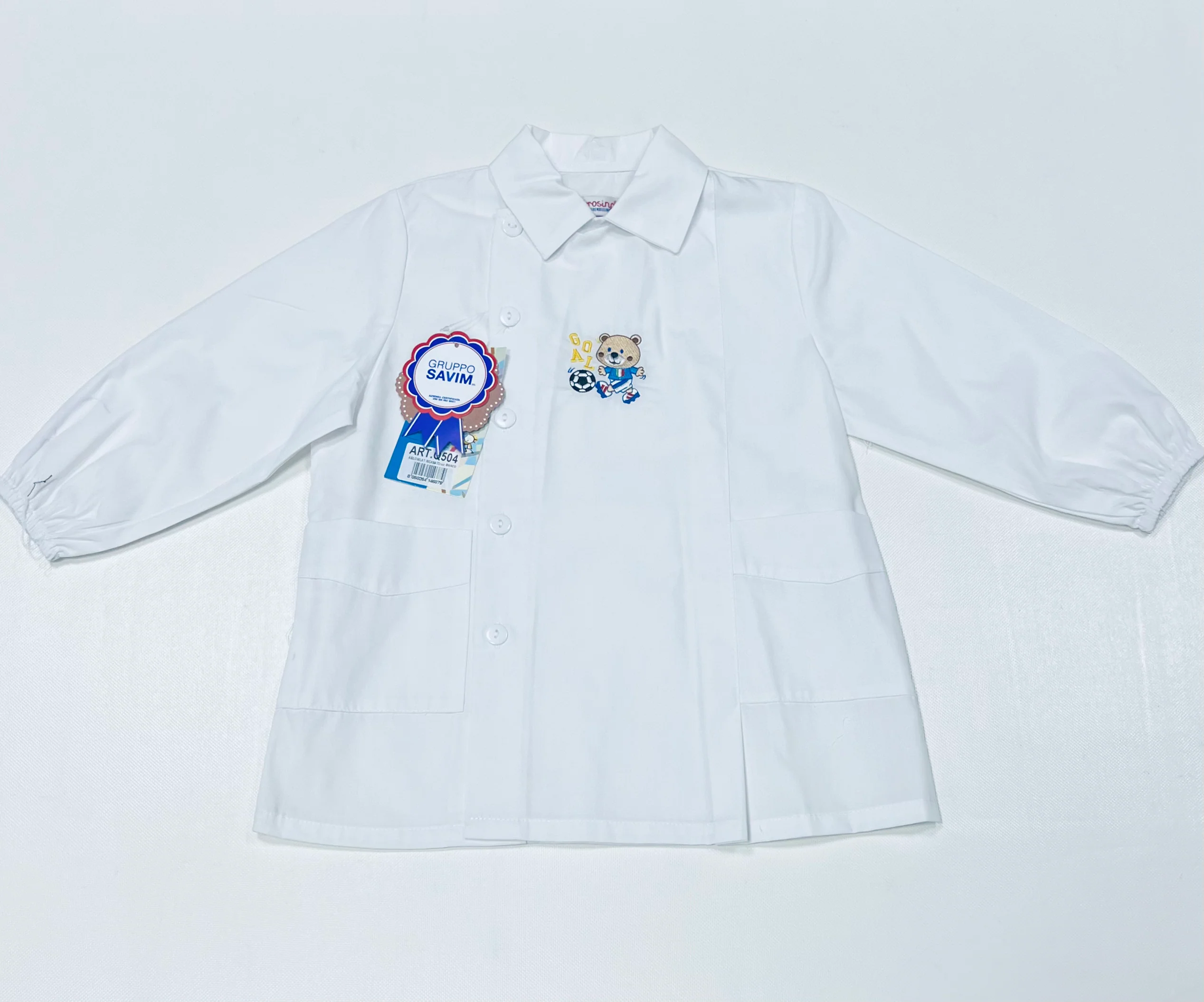 Grembiule Scuola Made in Italy – Asilo Bambino Colore Bianco Ambrosino ricamo Goal 65% Poliestere, 35% Cotone Abbottonatura laterale con Bottoni, Colletto Bianco non rimovibile. art. Q504