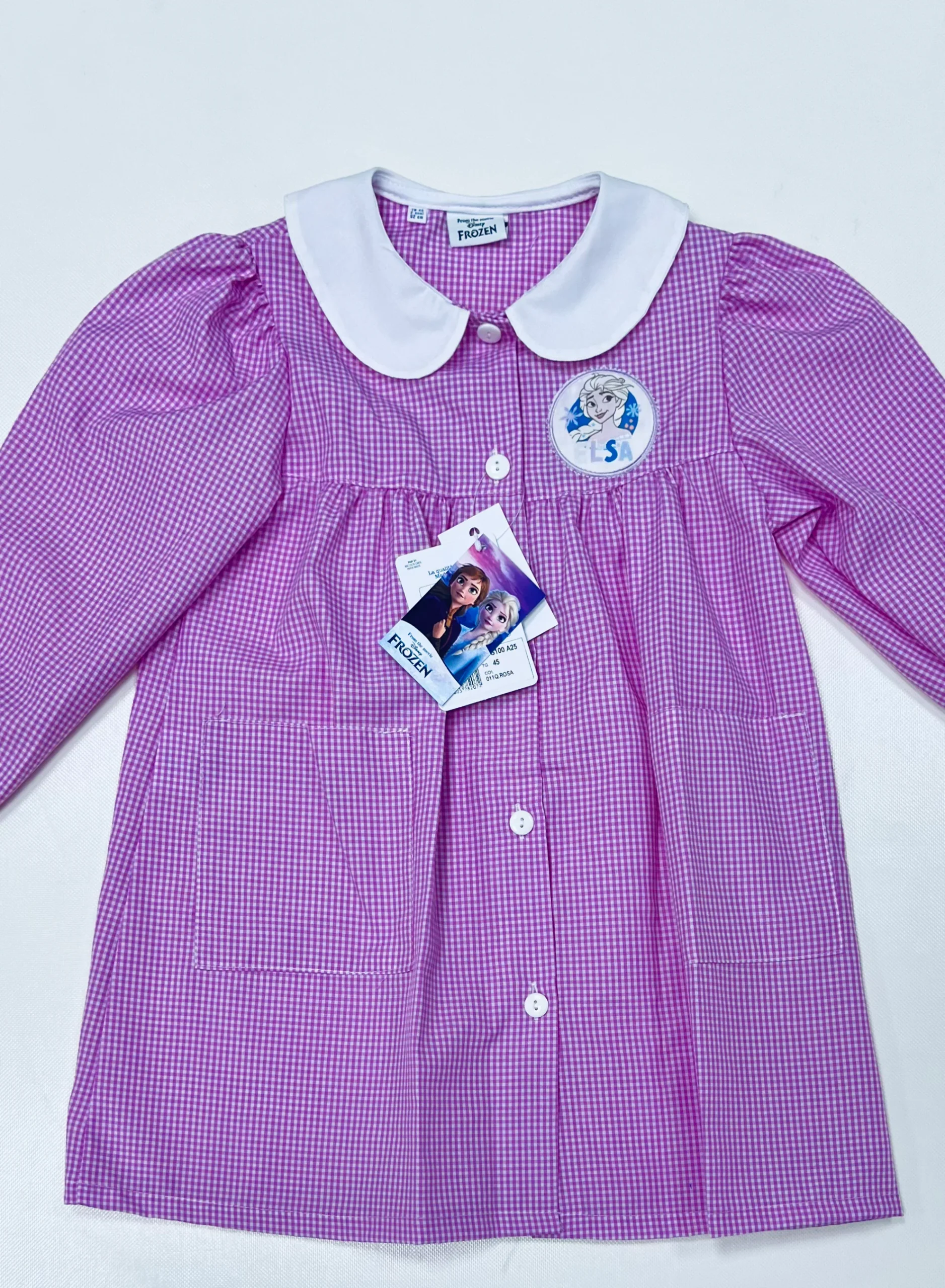 Grembiule Scuola – Asilo Bambina quadretti rosa Disney ricamo Frozen 65% Poliestere, 35% Cotone Made in Italy Abbottonatura Centrale con Bottoni Colletto Bianco non rimovibile art. G100