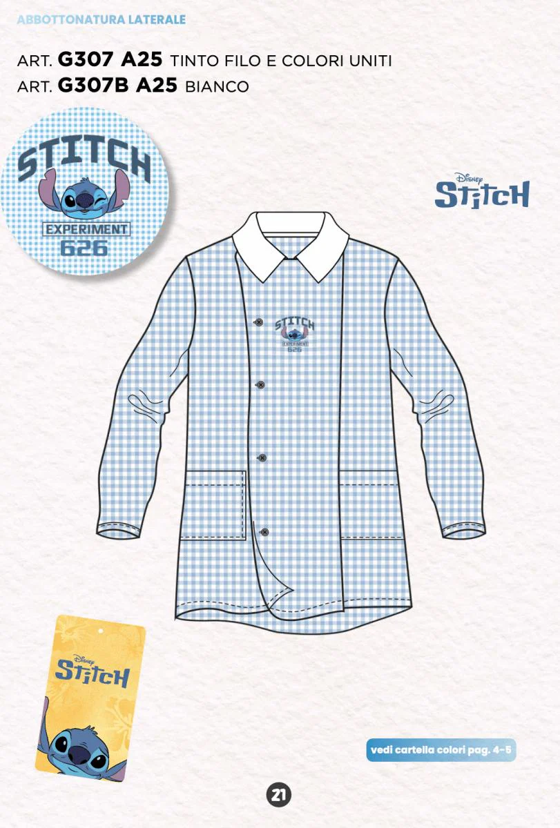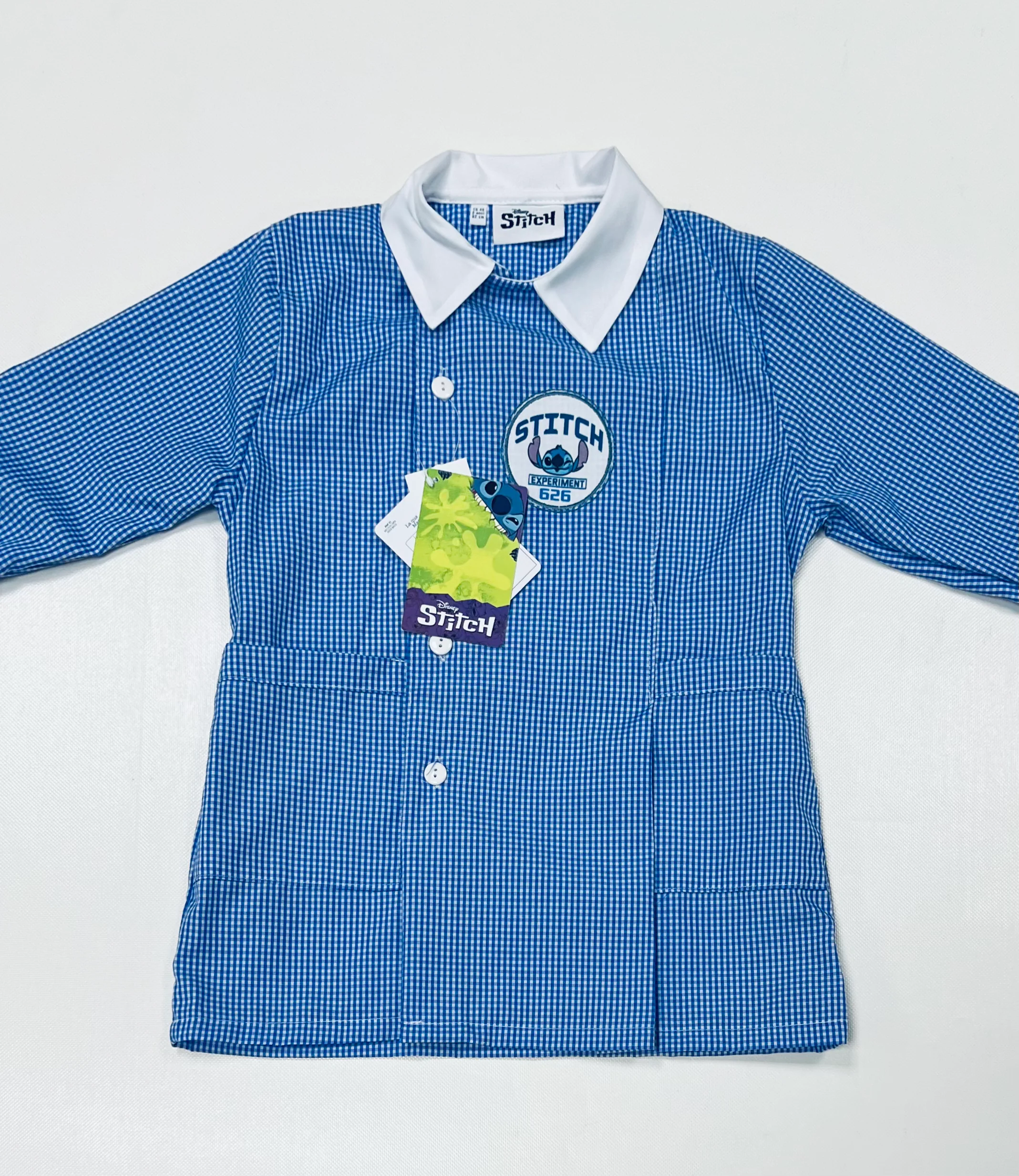 Grembiule Scuola Made in Italy – Asilo Bambino quadretti azzurri Disney Stitch 65% Poliestere, 35% Cotone Abbottonatura laterale con Bottoni Colletto non rimovibile art. G307